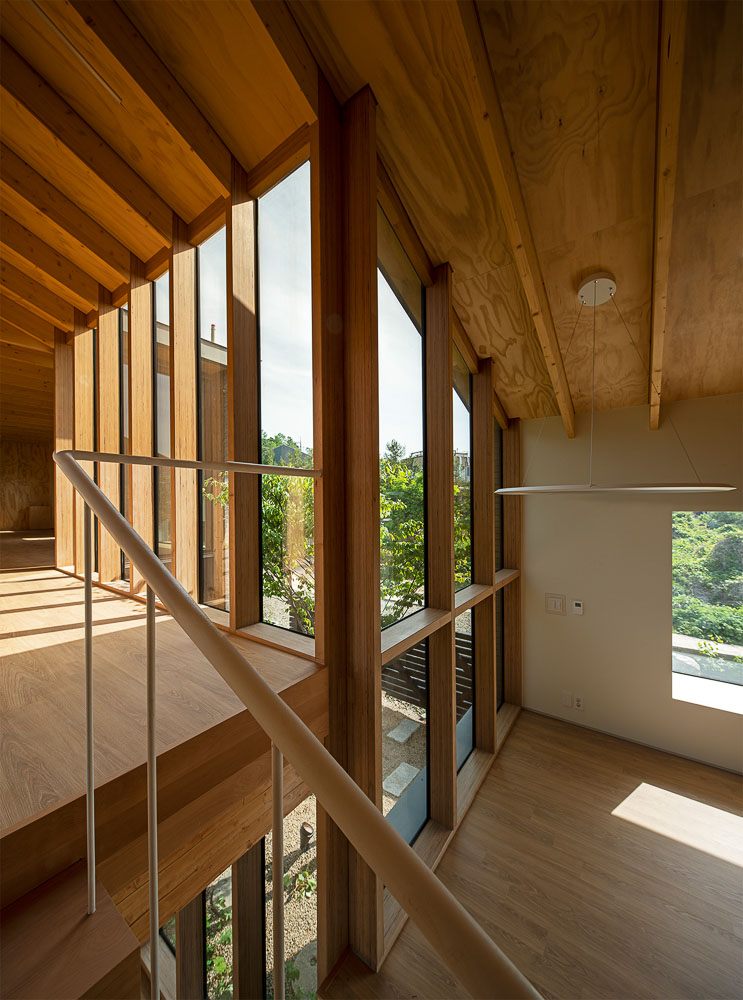 Beams, columns, and window frames were made using structure lamination wood (GLUELAM), and the roof and interlayer slabs were constructed with hand-manufactured SIP (an economical old-fashioned method to incorporate both insulation and structure at the same time by bonding structural plywood to both sides with EPS insulation material in between).