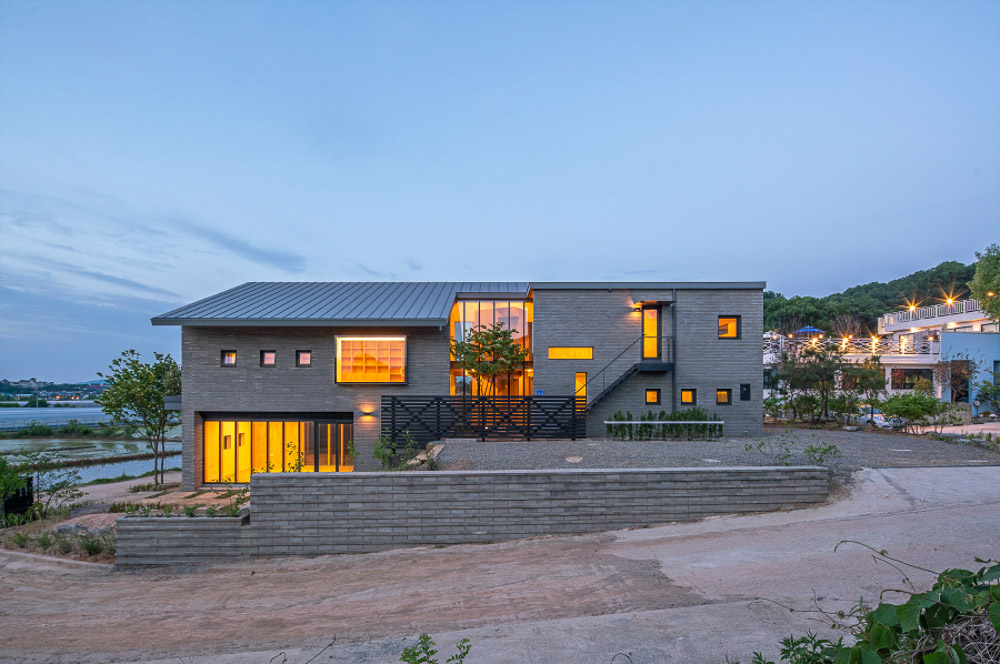 도로에서 보면 야트막한 담장으로 켜를 두고 오목한 사이 공간을 통해 출입하게 만들었으며 내부의 이동은 늘 사이 공간을 중심으로 순회하게 만들었다. 간결한 매스와 기능을 담은 깊은 처마는 시멘트 벽돌의 회색 느낌으로 통일했고 실내는 온통 나무의 향기와 색으로 통일시켰다.