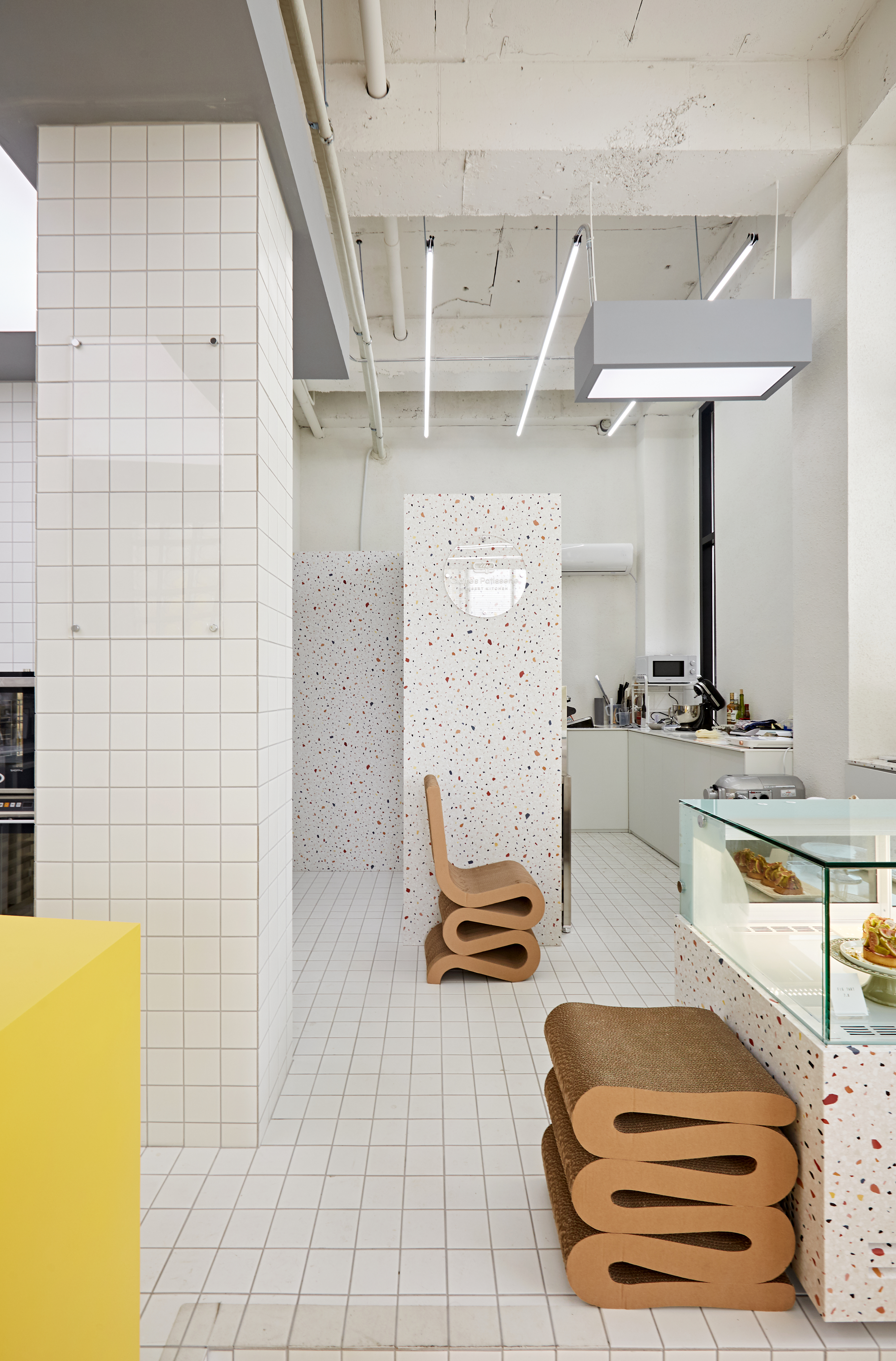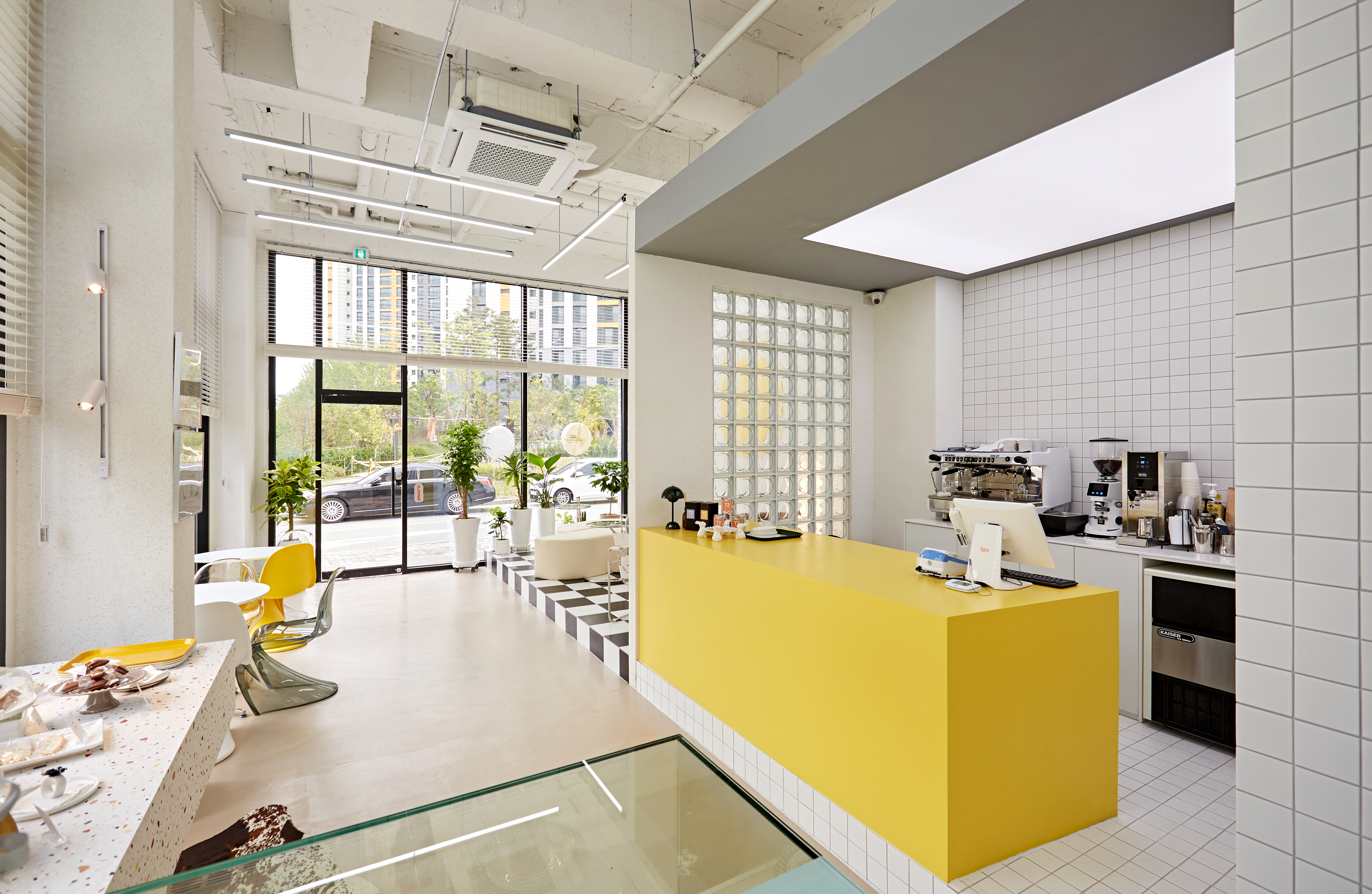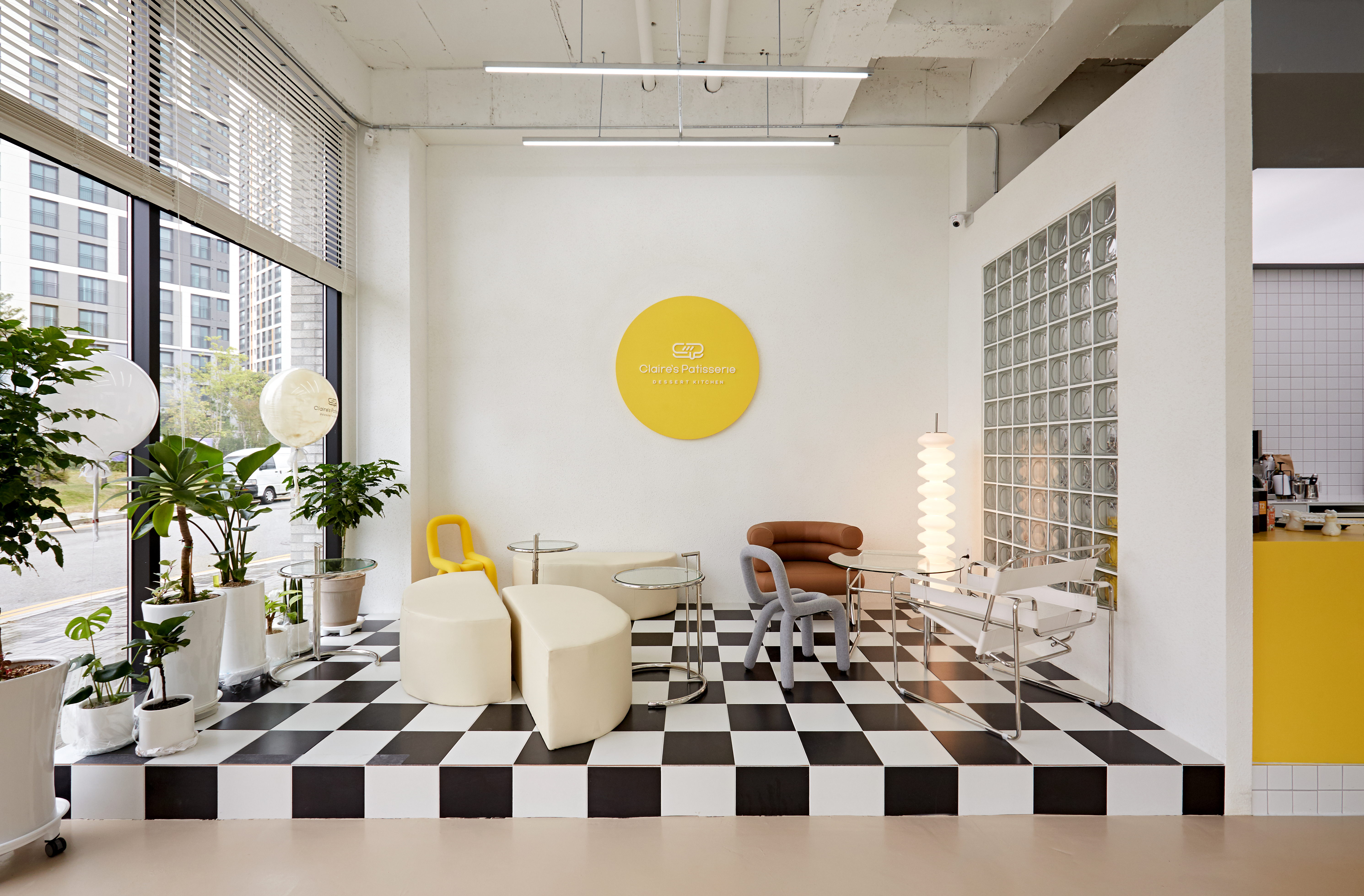 Clair's patisserie, located in Anseong, means "patisserie," not a typical bakery, that is, a confectionery store, a French, Belgian snack shop, and a bakery. Since it is located on the side of the boulevard, I had a good lighting and intuition that bright colors would go well with it. From the design concept meeting, a plan using primary colors was made, and the design direction was set while recognizing that colorful furniture would be included. Through spatial division, the gaze was sufficiently distributed and the texture of tiles added to the fun of viewing. He wanted to harmonize colorful furniture with tiles used everywhere and built another texture structure called a glass block between the kitchen and the hall space, hoping that clean and tidy gaze would come and go. Large cotton lights were placed on the ceiling of the kitchen to maximize the visual effect of spatial division from the customer's perspective, and the overall balance was made with the pillars built in the kitchen to capture the concept of space in space. Like the colorful and stylish snacks made here, you can feel the delicious space by combining elements of fun spaces everywhere.