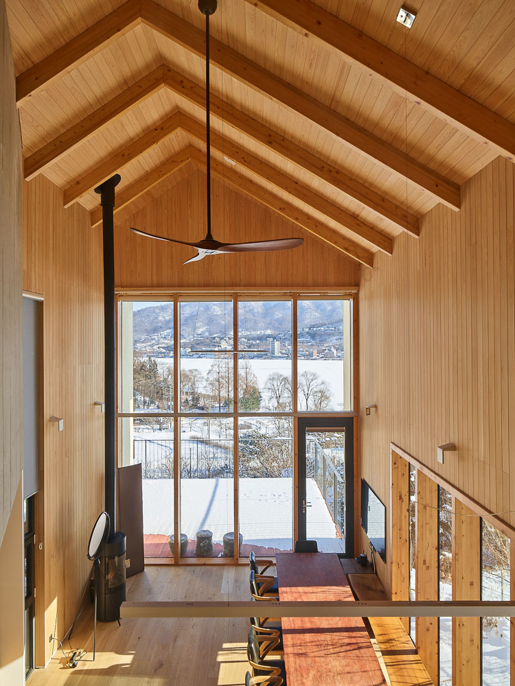 건축은 외부에서 느끼는 조형성에 초점이 있는 것이 아니라 비워진 공간이 중요하다. 이 집을 찾아 들어가는 과정은 다소 작위적 과정이 있다. 도로에서 차고 옆의 투명한 대문을 열면 자작나무 숲길의 브릿지가 있어 손님을 환영하듯 맞이하는 10여 미터의 여정을 지나 현관을 만난다. 현관문을 열고 만나는 계단 창은 집 아래의 강을 풍경으로 머물게 한다. 2층은 마스터를 위한 침실과 욕실이 있으며 복도와 방에서 거실을 내려다보며 두 개 층의 소통을 자유롭게 한다.