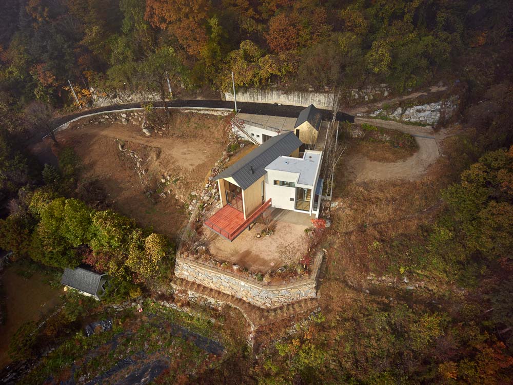 Architecture does not focus on the formativeness felt from the outside, but on the empty space, which is important. The process of finding the entrance and entering this house is somewhat unnatural. If you open the transparent gate next to the garage on the road, there is a bridge on the birch forest road, which welcomes you as if you were a guest after completing a 10-meter journey to arrive at the front door. The stair window at the front door allows the river below the house to remain part of the landscape. The second floor has a master bedroom, and the corridor and the room overlook the living room, allowing free communication between the two floors. A short refraction encountered when passing down the confuses the movement route and lengthens the journey, leading to the living room at a slightly different angle from the entry axis. Standing beside the island table in the kitchen on the side of the living room, through the two-story high window you can see the peak of Jusan Mountain, as well as the layers of other mountains. “Mountains are mountains and waters are water” as Monk Seongchul said, the scenery of rivers and mountains is just beautiful.