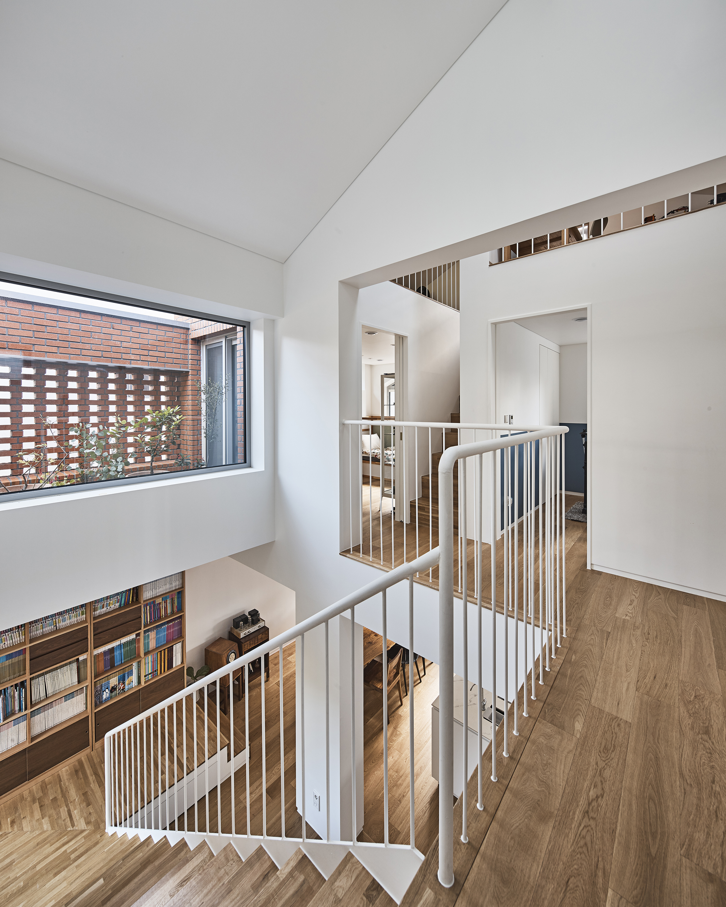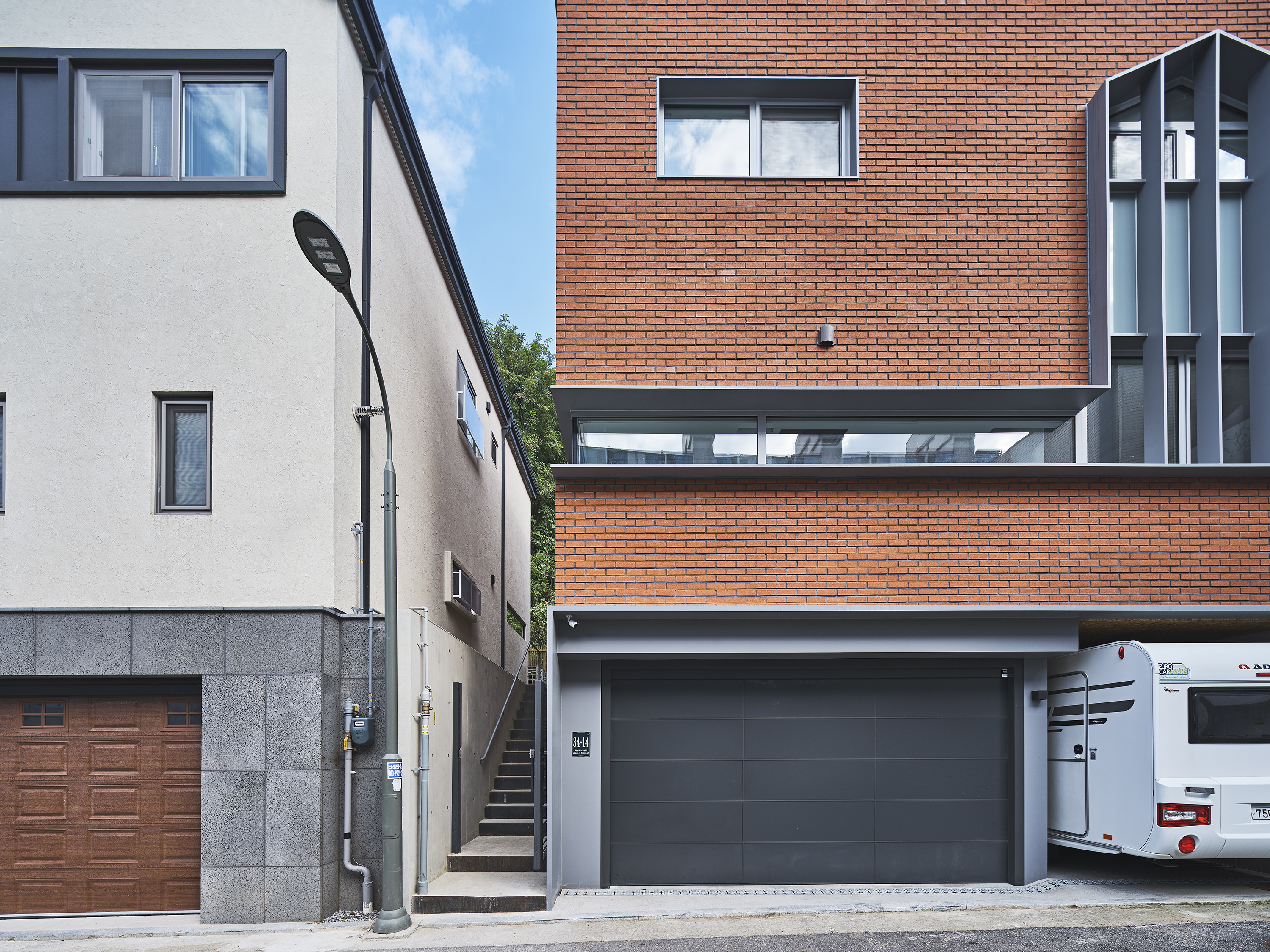 The JOYCE is a house for the family, who have a hobby about outdoor activities and related to vehicles, caravan camping. They have a camper with a height of 2.7m. The plan about a garage for two cars needed to change to a space for the camper. In most detached houses, the garage is an affiliate space, but it was not easy to provide two parking spaces, space for a camper, and an entrance, including the publicly spaced distance in the site, which is a legally separated distance, in a small parcel with a limited front width facing the road. Joyce is a house to start with a camper trailer to determine the important dimensions and spatial composition of the house. The height of the camper was used to separate the floor height of the garage into general parking and camper areas. Accordingly, the 1st floor, where the living room and the kitchen are located, naturally made a difference in the floor level resulting from the difference in the height of the B1 floor, and the space on the 1st floor was divided into a dining area and a living area to become a smooth skip floor. A small lot of about 165m2 was crowded with neighboring houses in the north and south, faced the road on the west side, and on the east side was the foot of a hill. The issue of family identity on the western facade, which is the only facade exposed to the outside, the connection of a small garden with a hill, and reflecting the internal and external relationship settings from the perspective of the residents' life were important. However, creating a bright and light interior space as a starting point to tie these individual issues together was an important goal of the design. The house is a design to allow the family to feel a large interior space. Although there is a lot of blocked views around the site, the window plan was designed to open it boldly in a direction where a view could be seen, and to accept sunlight only on the side blocked by neighboring houses. In order to make the space feel three-dimensional, not flat but volumetric, the staircase is opened vertically, and the 1st and 2nd floors are recognized as one connected space.