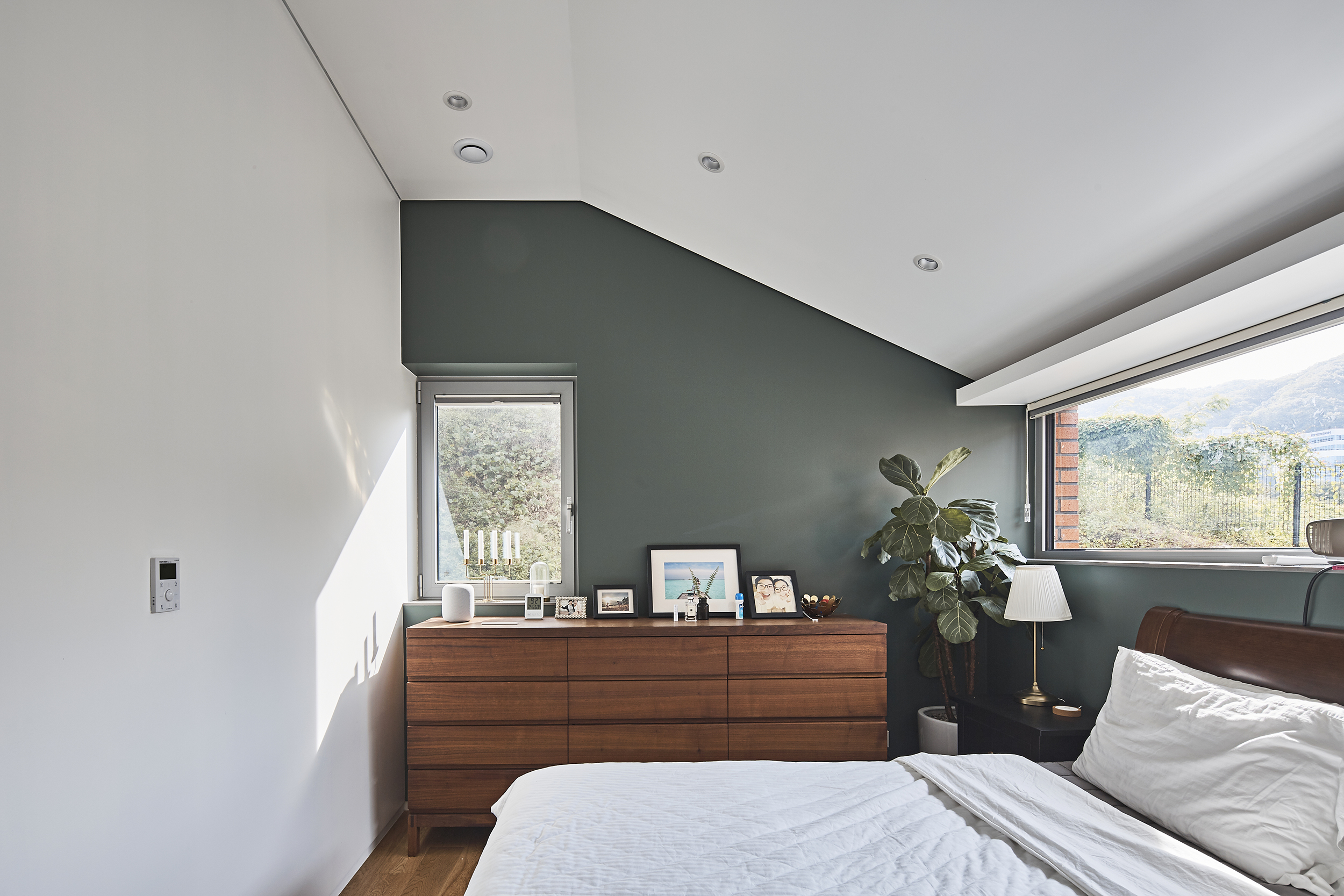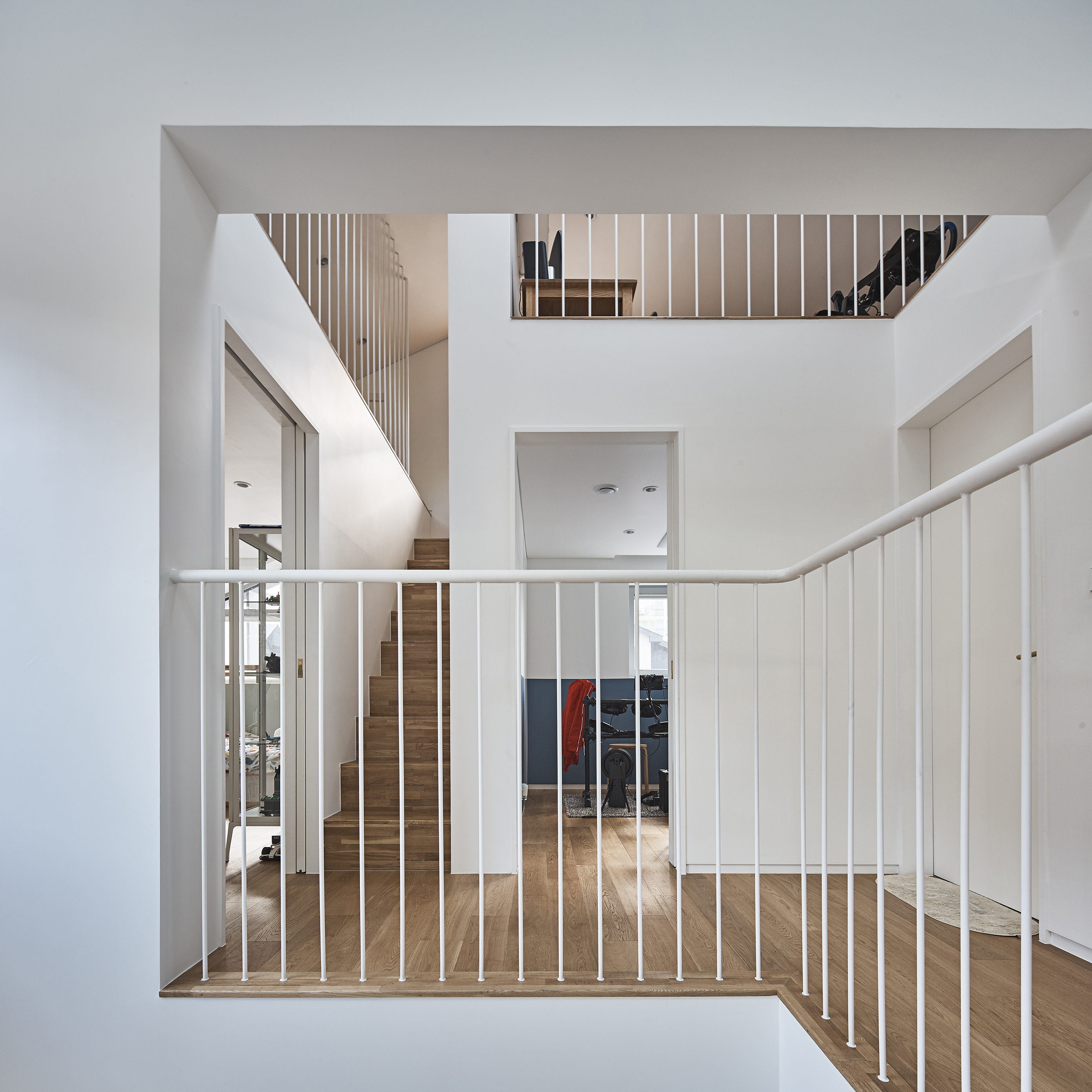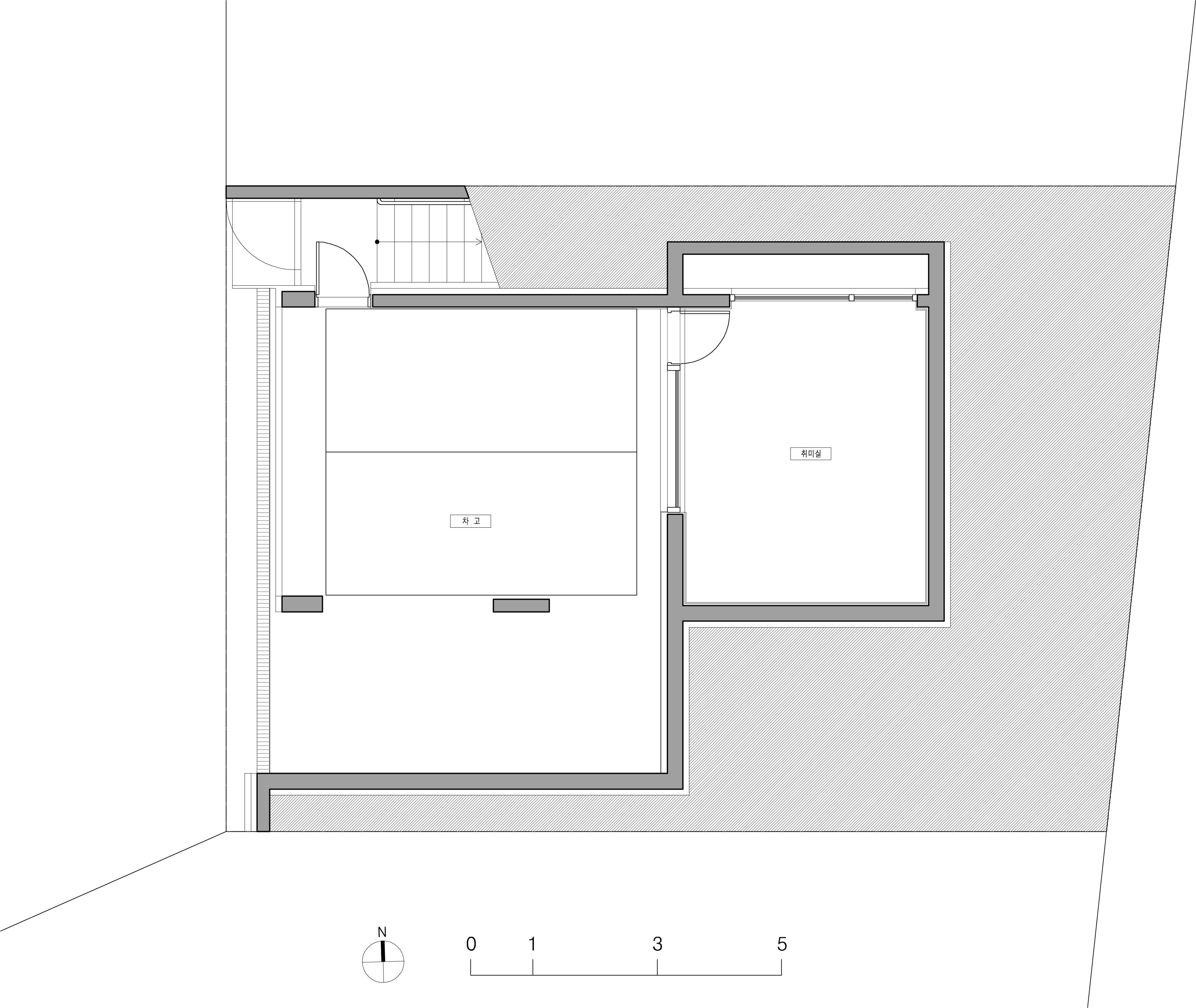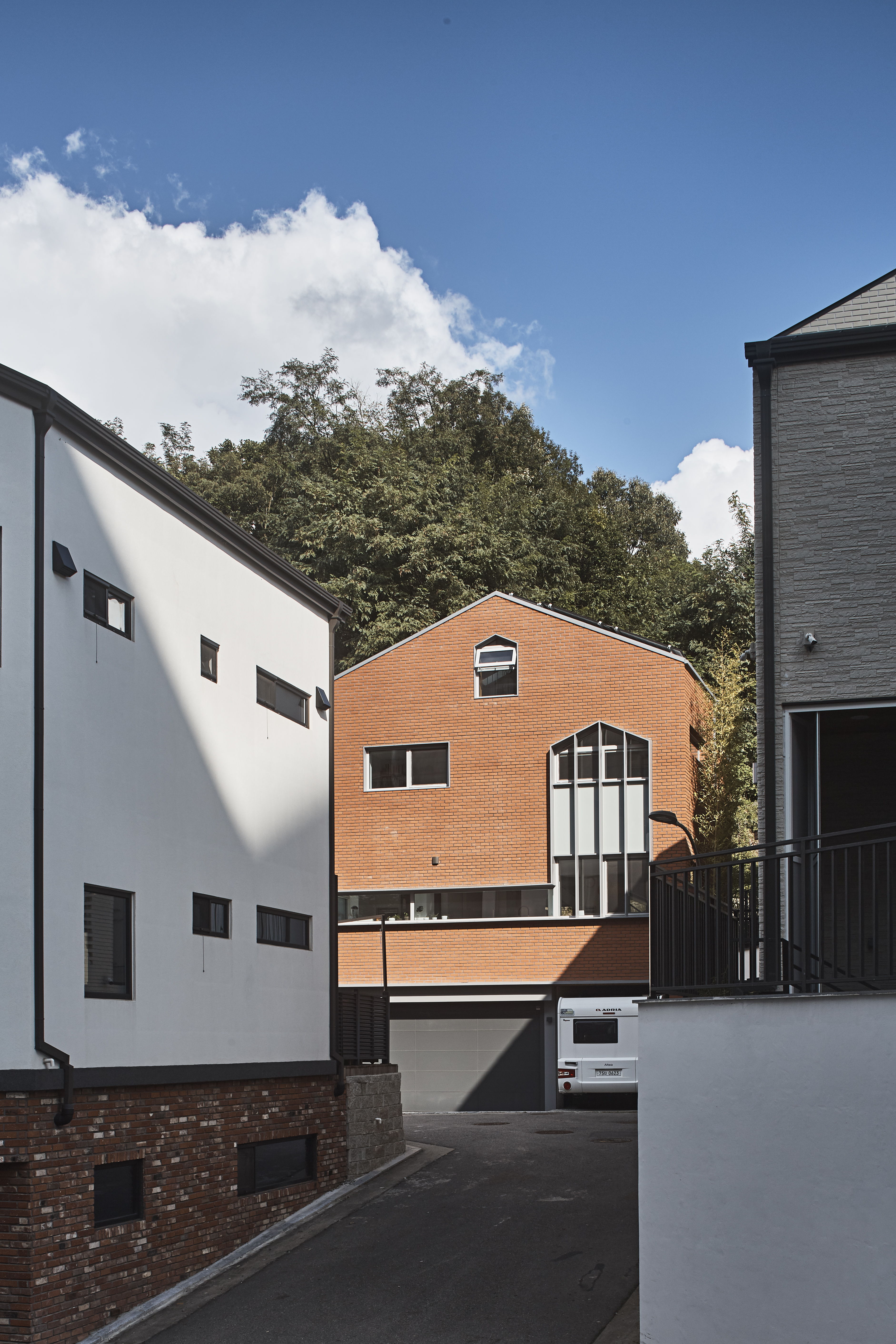 The JOYCE is a house for the family, who have a hobby about outdoor activities and related to vehicles, caravan camping. They have a camper with a height of 2.7m. The plan about a garage for two cars needed to change to a space for the camper. In most detached houses, the garage is an affiliate space, but it was not easy to provide two parking spaces, space for a camper, and an entrance, including the publicly spaced distance in the site, which is a legally separated distance, in a small parcel with a limited front width facing the road. Joyce is a house to start with a camper trailer to determine the important dimensions and spatial composition of the house. The height of the camper was used to separate the floor height of the garage into general parking and camper areas. Accordingly, the 1st floor, where the living room and the kitchen are located, naturally made a difference in the floor level resulting from the difference in the height of the B1 floor, and the space on the 1st floor was divided into a dining area and a living area to become a smooth skip floor. A small lot of about 165m2 was crowded with neighboring houses in the north and south, faced the road on the west side, and on the east side was the foot of a hill. The issue of family identity on the western facade, which is the only facade exposed to the outside, the connection of a small garden with a hill, and reflecting the internal and external relationship settings from the perspective of the residents' life were important. However, creating a bright and light interior space as a starting point to tie these individual issues together was an important goal of the design. The house is a design to allow the family to feel a large interior space. Although there is a lot of blocked views around the site, the window plan was designed to open it boldly in a direction where a view could be seen, and to accept sunlight only on the side blocked by neighboring houses. In order to make the space feel three-dimensional, not flat but volumetric, the staircase is opened vertically, and the 1st and 2nd floors are recognized as one connected space.