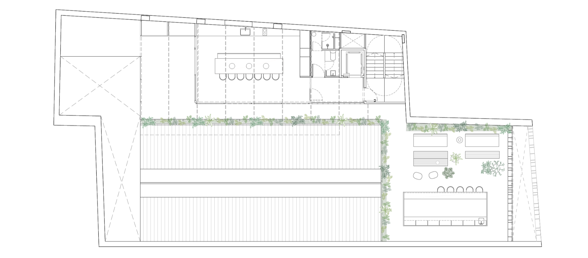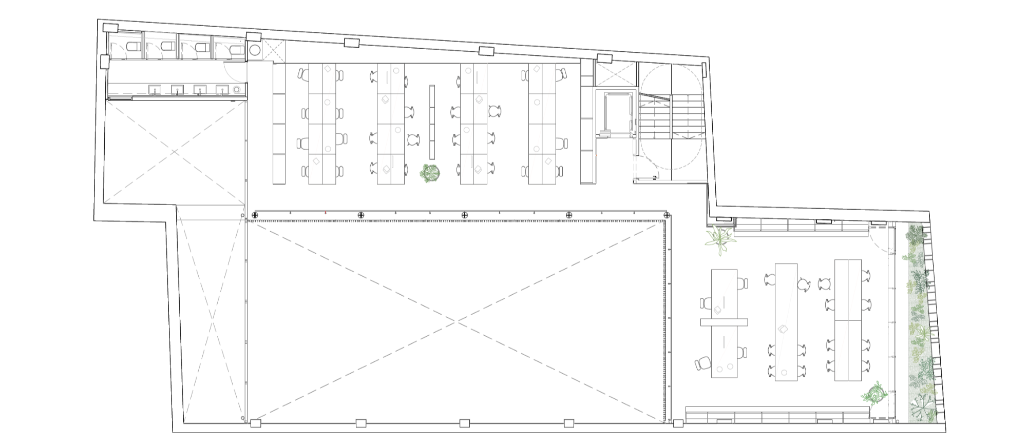 Through the enhancement and recycling of the warehouse a huge volume was created to place the main room, where the company’s product exhibition and diverse events take place, and alternative work spaces are conceived. This great empty luminous space, let us work in various scales and renew it by providing additional uses. Two levels were built on the adjoining property where the closed offices and workstations are located. The new construction is delicately juxtaposed without competing or fading. Large windows, high ceilings, and work-optimized open floor plans mark the territory where creative thinking unfolds. The facade, facing the street, is presented silently. Transparent and opaque at the same time, it is constituted by reflective vertical columns of irregular rhythm, creating a plastic sensation at the look of the eye. Behind, a terrace with great vegetation multiplies with the reflective game. With a translucent configuration, the facade strips the building from its frontal perspective, while as passing through, it becomes quiet, giving space to the lush vegetation.