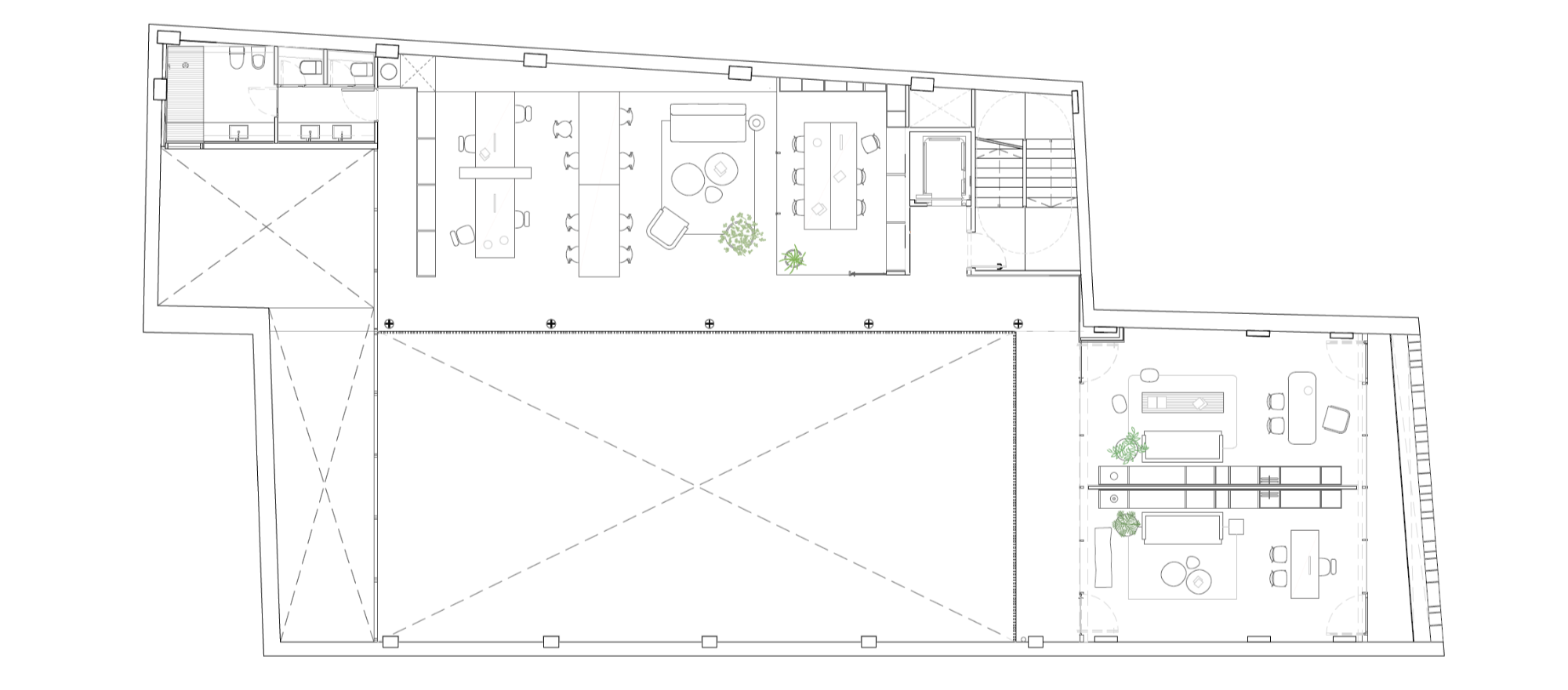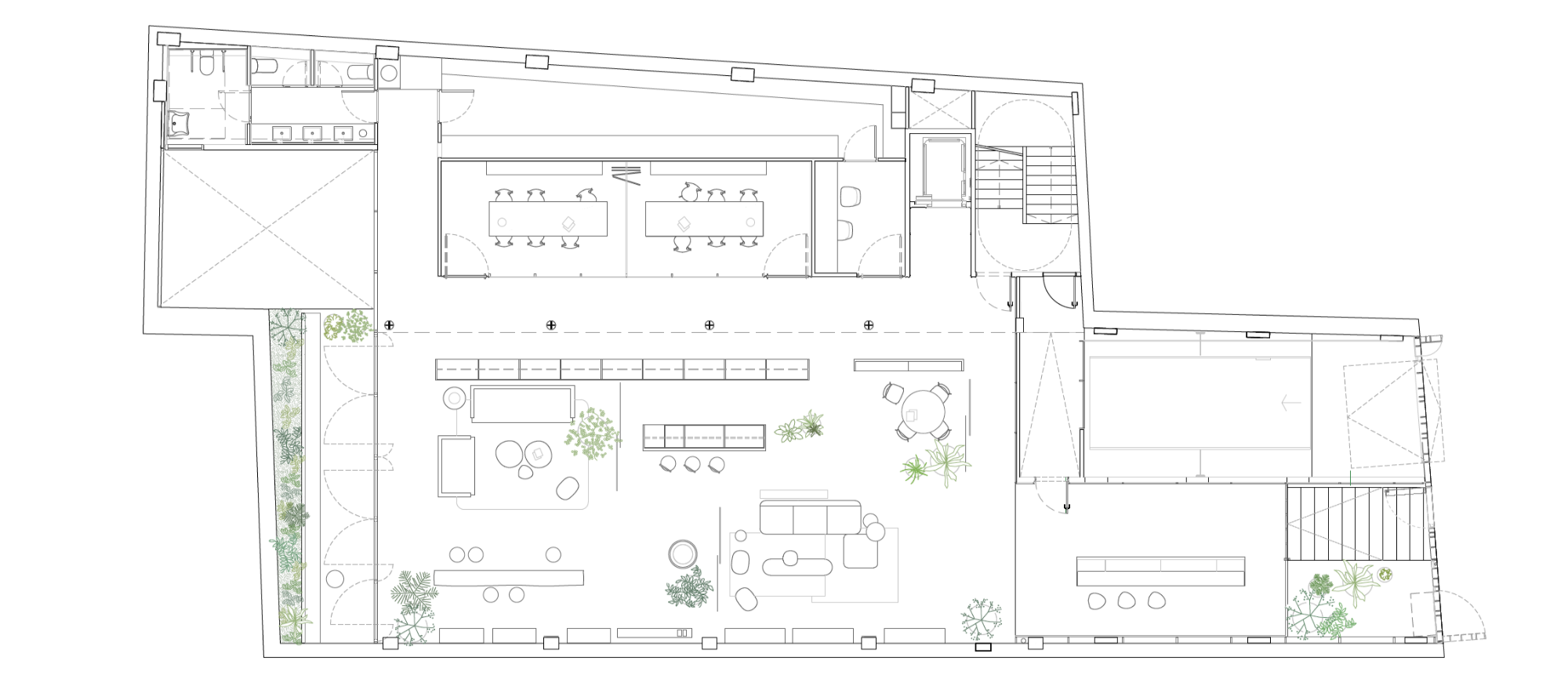 Through the enhancement and recycling of the warehouse a huge volume was created to place the main room, where the company’s product exhibition and diverse events take place, and alternative work spaces are conceived. This great empty luminous space, let us work in various scales and renew it by providing additional uses. Two levels were built on the adjoining property where the closed offices and workstations are located. The new construction is delicately juxtaposed without competing or fading. Large windows, high ceilings, and work-optimized open floor plans mark the territory where creative thinking unfolds. The facade, facing the street, is presented silently. Transparent and opaque at the same time, it is constituted by reflective vertical columns of irregular rhythm, creating a plastic sensation at the look of the eye. Behind, a terrace with great vegetation multiplies with the reflective game. With a translucent configuration, the facade strips the building from its frontal perspective, while as passing through, it becomes quiet, giving space to the lush vegetation.