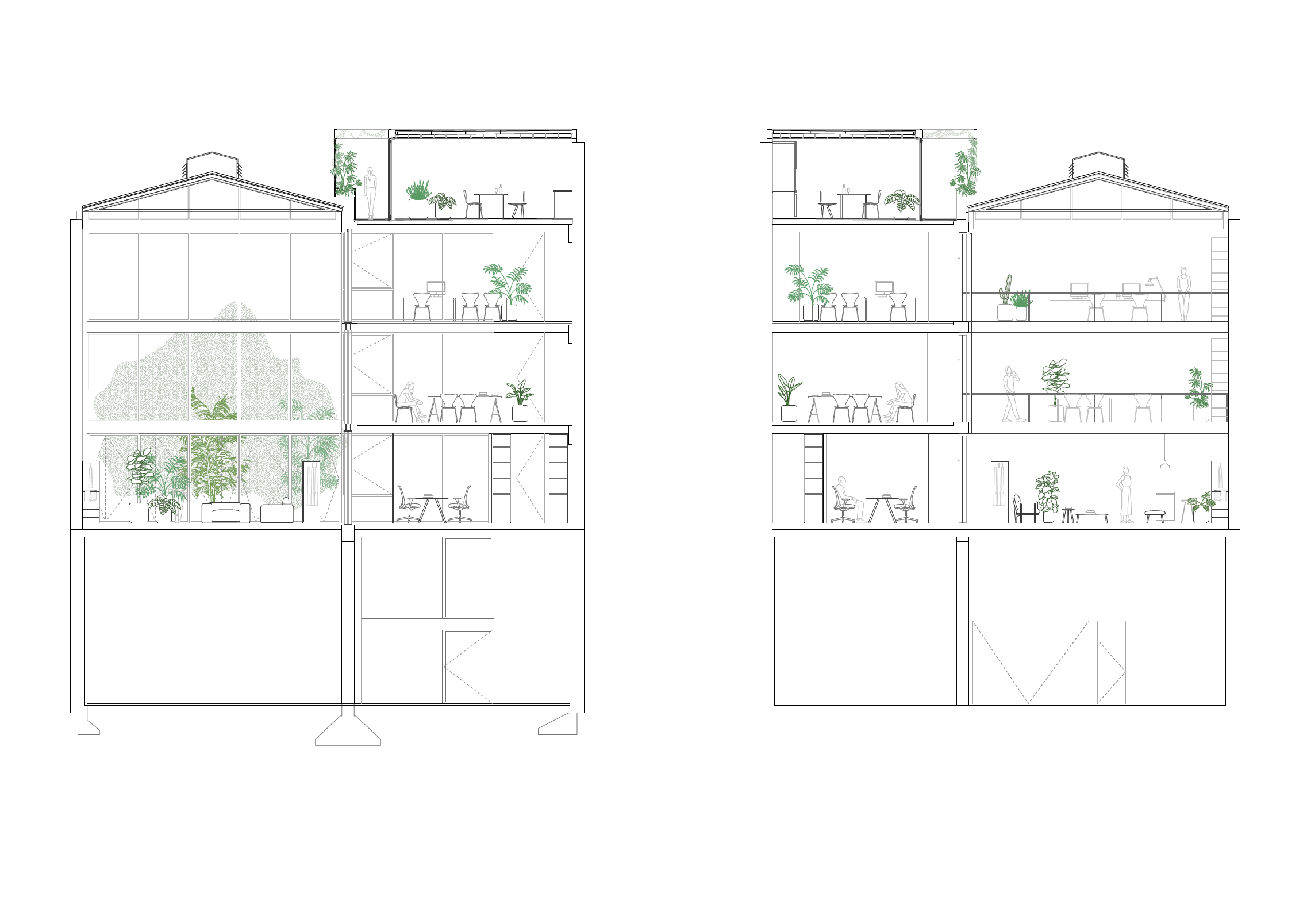 창고의 증축과 재활용을 통해 회사의 상품 전시회와 다양한 행사가 열리는 메인 공간을 배치하기 위한 거대한 볼륨을 만들고 대체 작업 공간을 했다. 이 광활한 공간을 다양한 스케일로 작업하고 추가적인 용도를 제공하여 새롭게 리모델링했다. 폐쇄된 사무실과 워크스테이션이 위치한 인접한 건물 위에 두 개의 층이 증축됐다. 새로운 건물은 섬세하게 나란히 배치되어 있다. 큰 창문, 높은 천장, 그리고 작업에 최적화된 탁 트인 평면은 창의적인 사고가 펼쳐지는 영역을 나타낸다. 거리에 면해 있는 정면이 조용히 펼쳐져 있다. 투명함과 불투명함을 동시에 불규칙한 리듬의 반사 수직 기둥으로 구성되어 있어 조형적 감각을 나타낸다. 뒤편에는 초목이 우거진 테라스가 반사적으로 어우러져 있다. 반투명 구성의 파사드는 무성한 초목이 자랄 수 있는 공간을 제공한다.
