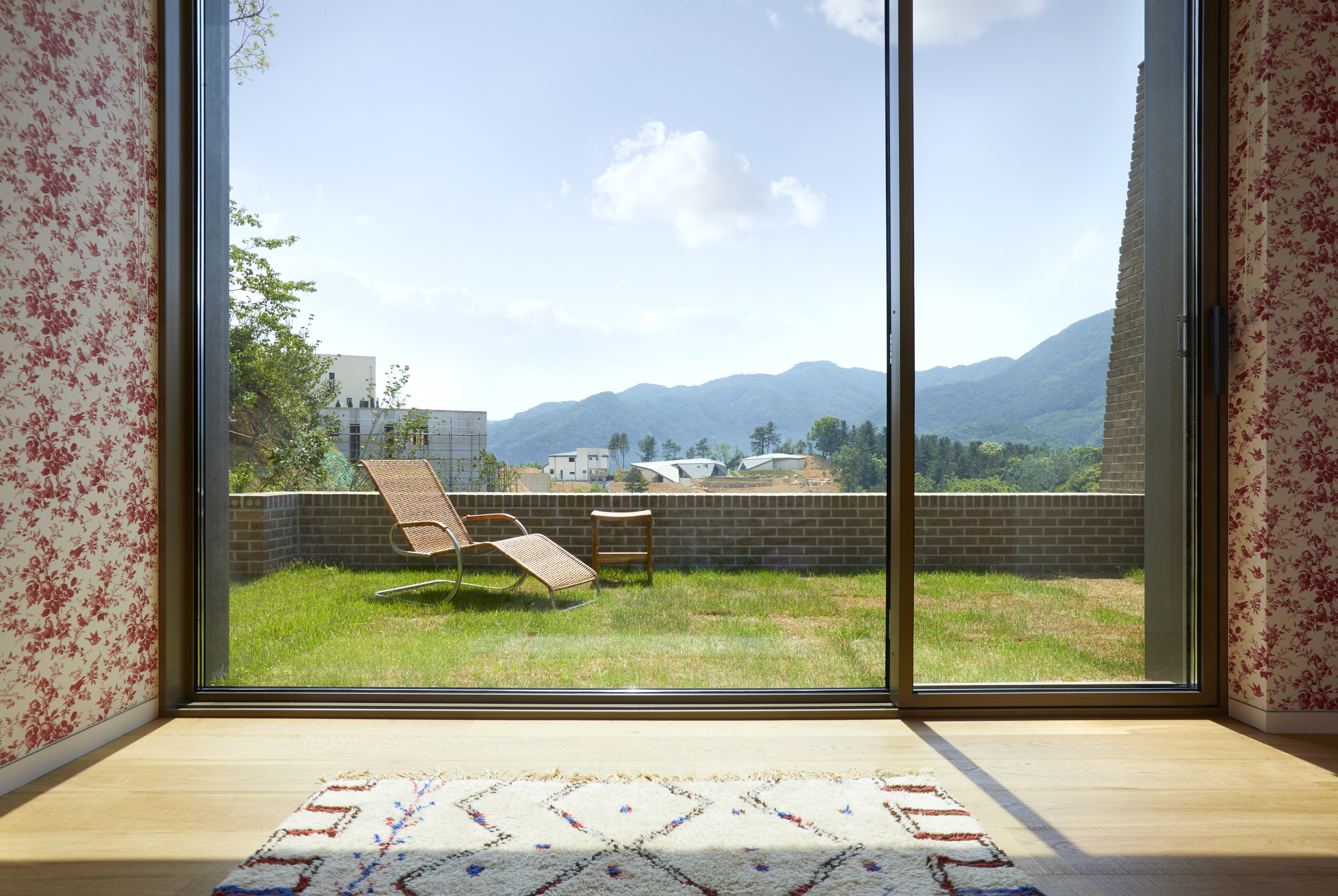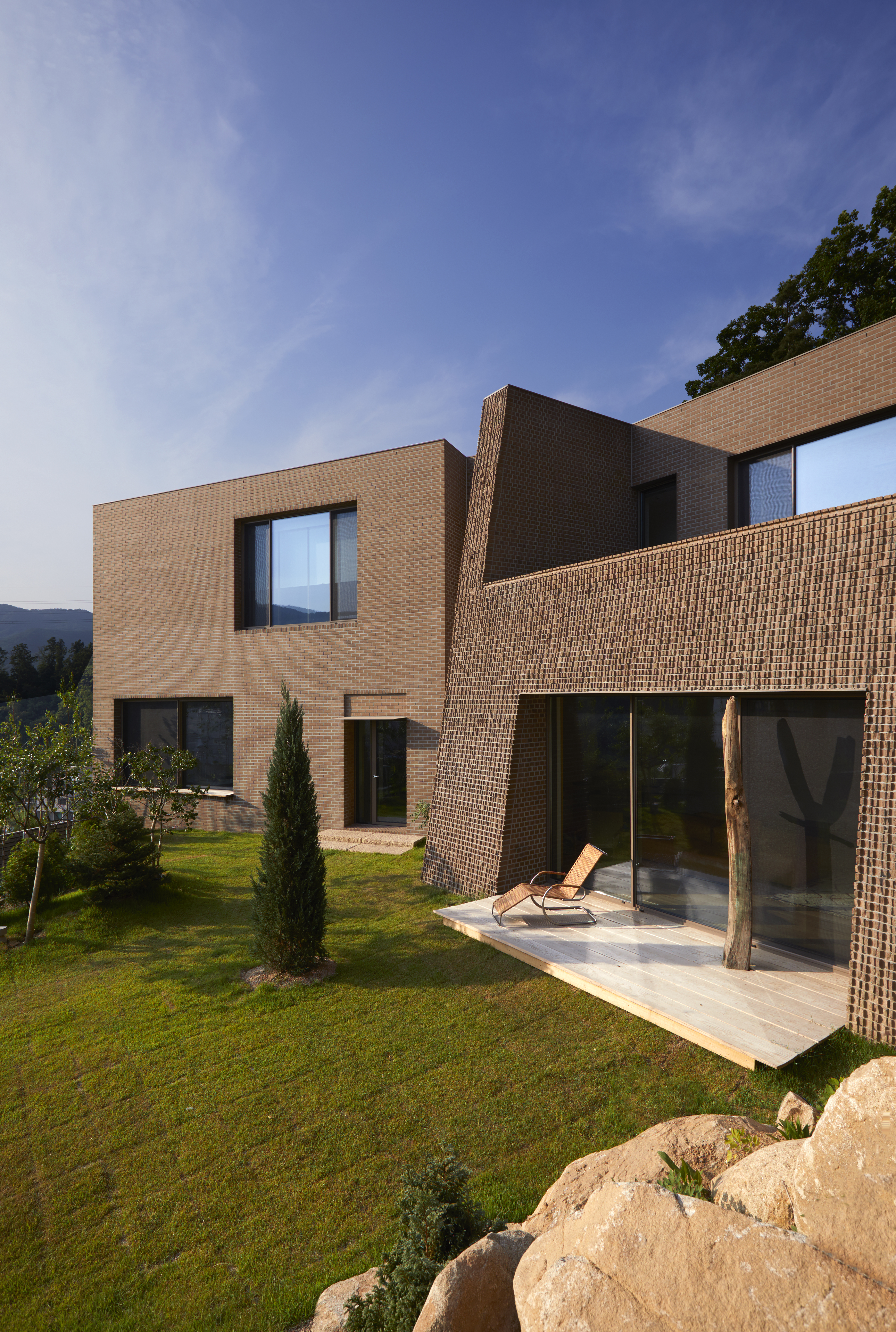 Munho-ri house is a quiet hideout that would not be revealed. The house provides the sunset view which is dramatic scenery from the window of the small bedroom, not only that. The site is overlooking the beautiful and tranquil Bukhan River. It facing the slope is open toward the river, but the front of the house is arranged so that it faces the south where the sun can be fully received without facing the river. This is due to the nature of the region, it is considered that the hot and humid in summer and in winter do not thaw well. In addition, the area is characterized by a river view everywhere, which is maximized in the bedroom on the second floor of the house. The exterior is designed to be felt the sensitivity and humility by the colors and textures of bricks similar to the soil and a simple and neat form. So that, the house looks unrevealed as much as possible.