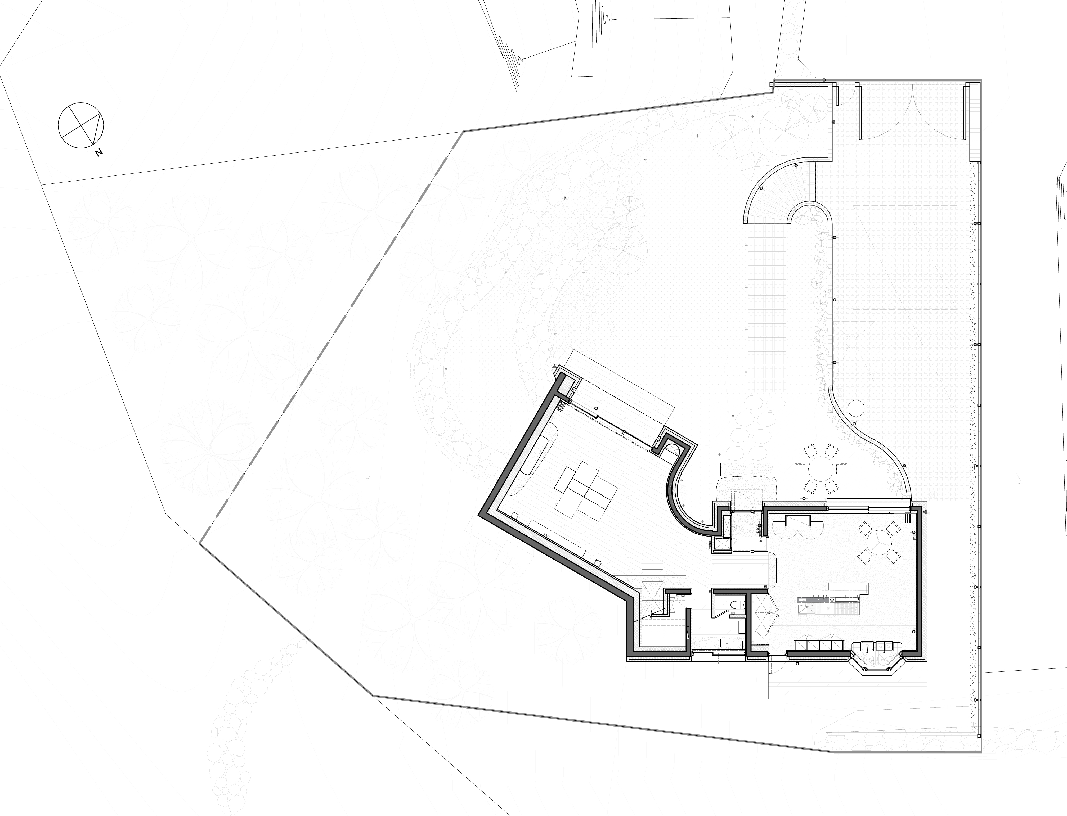 This joint is the position of the core that connects the upper and lower levels inside. Inside the two curved masses, each provides a different look at the yard. The first floor, which functions as a living room and kitchen, is large and simple. The entire wall is finished with natural ash walls to react to humidity. The curved wall connecting the living room and the kitchen is a reversal of the concave exterior form. The floor of the staircase in the center brings a experience the dichotomous properties of stone and wood. The second floor, which has a relatively small and charming atmosphere, is divided into a client's personal space and a guest space. The private space is arranged in the order of a Japanese-style sitting living room, a bedroom with a minimum area using a mattress, a long corridor dressing room, and a bathroom with a large window. On the opposite side is the bathroom and guest room with a terrace. The grass-lined terrace opens toward the slope. The living room on the second floor has two steps higher than the corridor. It forms a relatively low sense of space and provides an oriental image along with Korean paper top-hinged push-up windows. The size of the lower open window contrasts with the large windows on the first floor, inducing a dramatic effect. In addition, density changes in repeated spaces create a unique rhythm and another axis of emotion that constitutes the architecture. The ceiling of the bathroom exaggerates the height with artificial light falling through the wooden louvers. The slanted east window provides an experience of bathing in the morning sun. The parking space, which is lower than the yard, is protected by a tall reed hiding the car and the forest on the slope hugs the house.