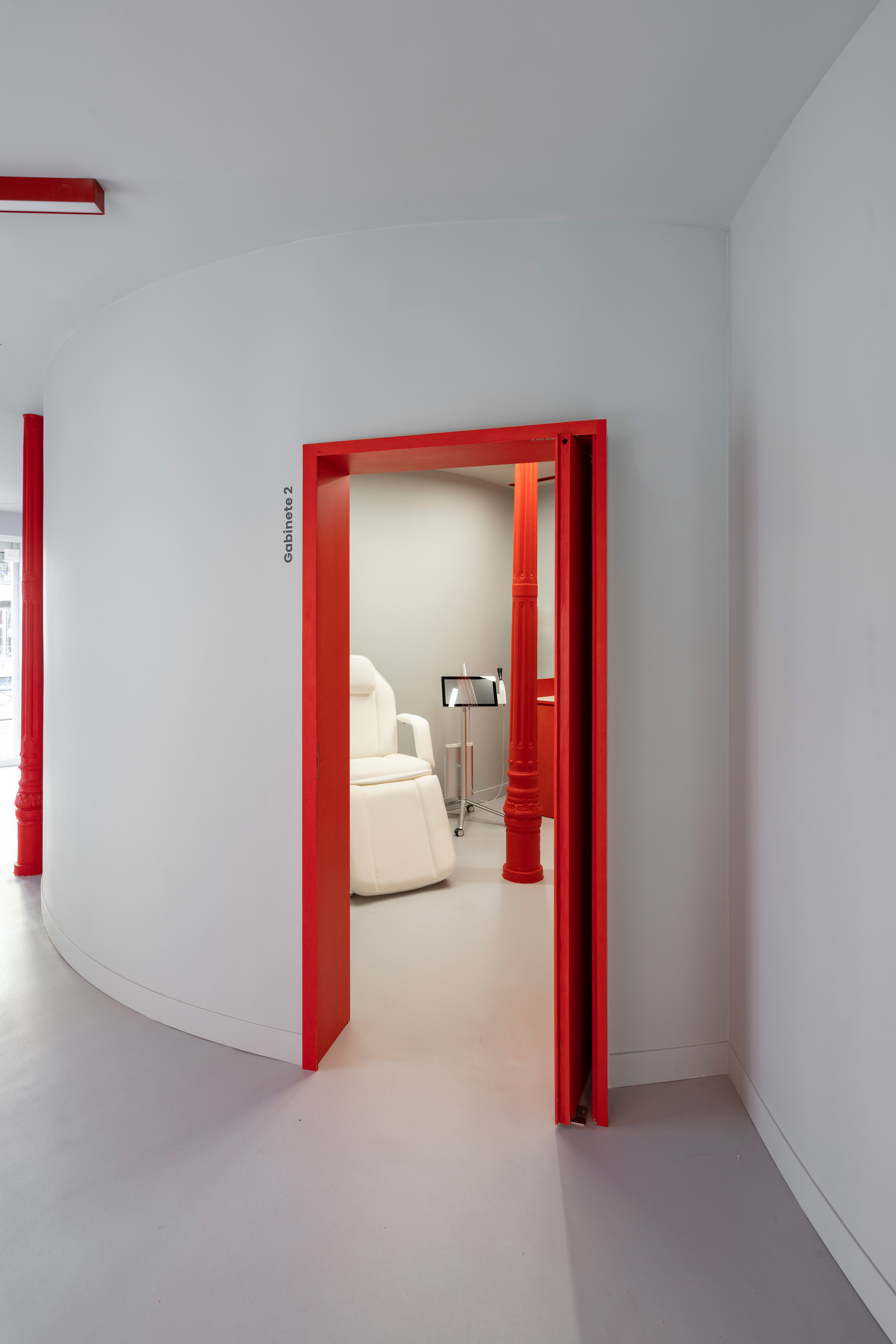 This new clinic for Impress in Madrid is located on a busy corner of Carranza street, where a line of huge granite ashlars delimits the perimeter towards the street, while inside, slender and refined wrought iron columns make the counterpoint to the ashlars. This striking contrast between these two porticoes guided the design process: a series of curves in the form of cylinders crowd the interior party wall and play with the wrought iron columns, leaving them inside or outside them, while leaving an empty space towards the stone ashlars, where the lobby and the waiting area are resolved, always in close contact with the street. In this way, a dialectic game is created between the enormous stone pillars, which are given space to be seen, and the curves and iron pillars, which appear, in contrast, as fragile planes and lines that approach and move away from the ashlars. Even the iron columns themselves have been painted red, giving them a more playful character compared to the stony seriousness of the granite.