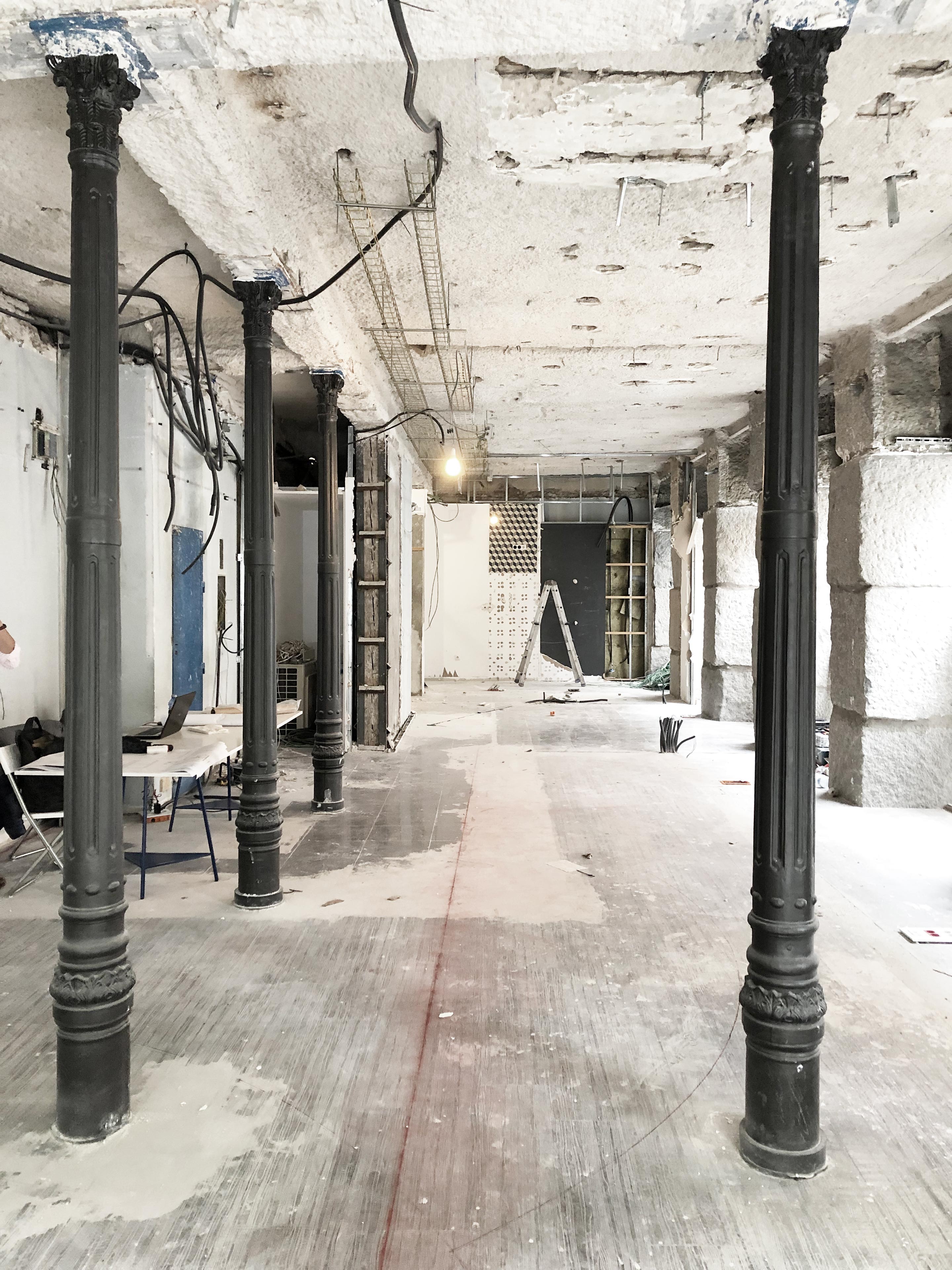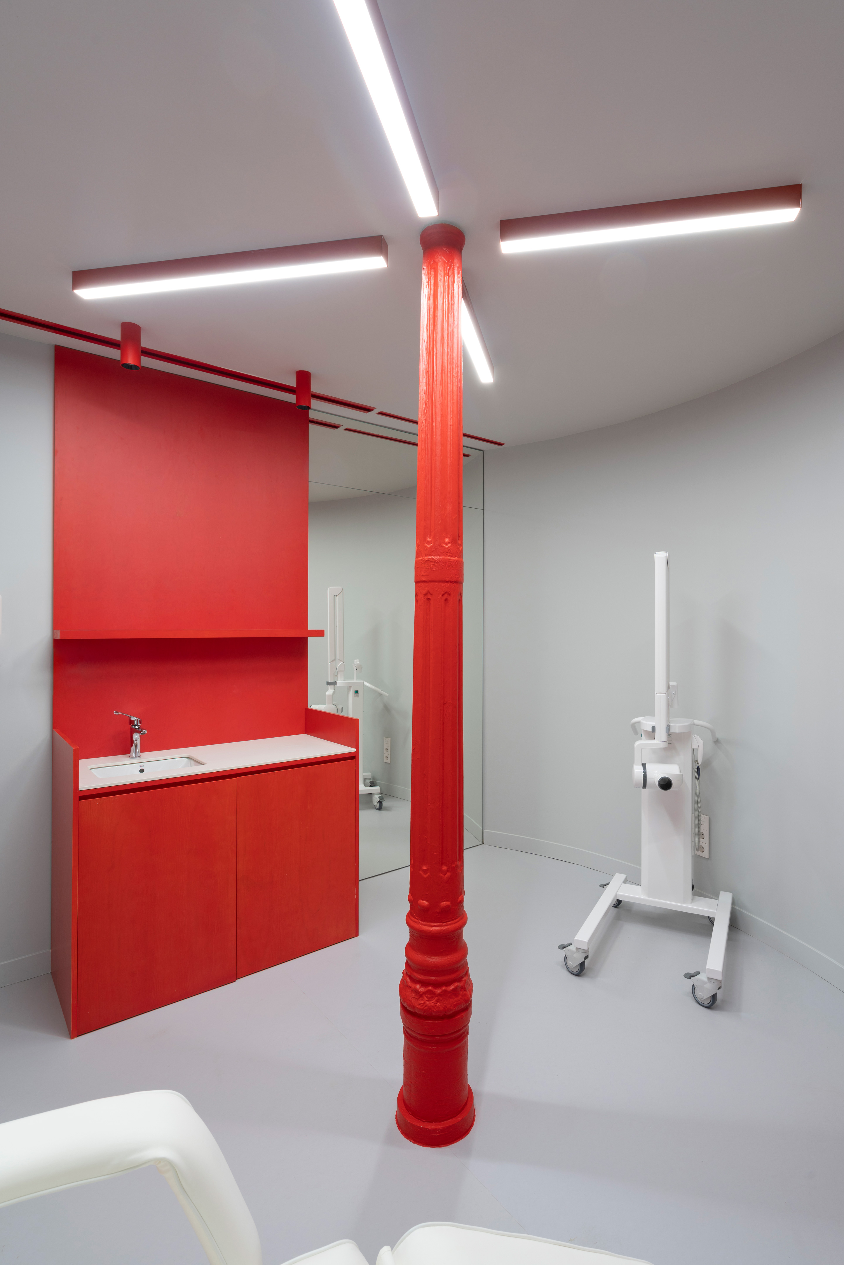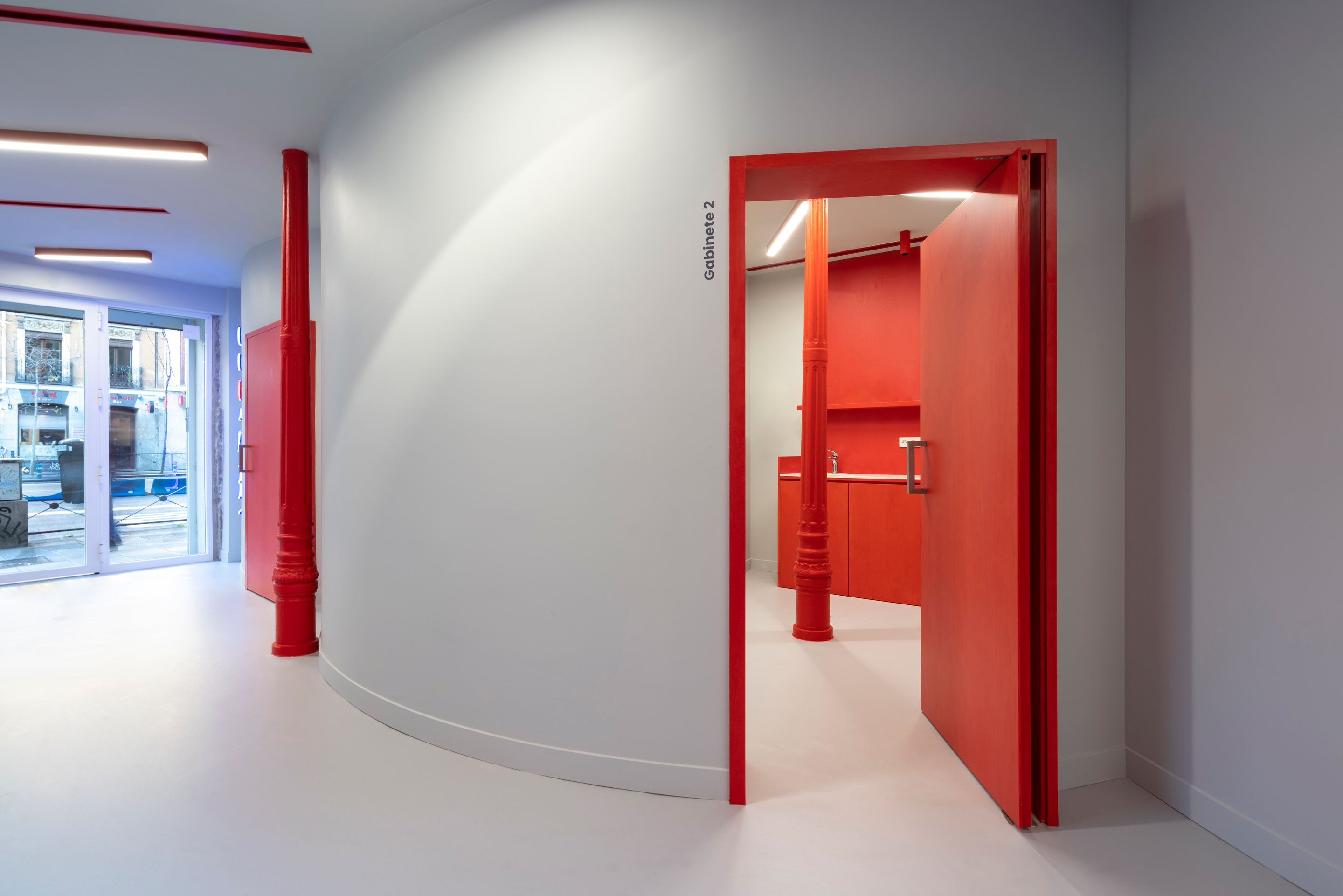 This new clinic for Impress in Madrid is located on a busy corner of Carranza street, where a line of huge granite ashlars delimits the perimeter towards the street, while inside, slender and refined wrought iron columns make the counterpoint to the ashlars. This striking contrast between these two porticoes guided the design process: a series of curves in the form of cylinders crowd the interior party wall and play with the wrought iron columns, leaving them inside or outside them, while leaving an empty space towards the stone ashlars, where the lobby and the waiting area are resolved, always in close contact with the street. In this way, a dialectic game is created between the enormous stone pillars, which are given space to be seen, and the curves and iron pillars, which appear, in contrast, as fragile planes and lines that approach and move away from the ashlars. Even the iron columns themselves have been painted red, giving them a more playful character compared to the stony seriousness of the granite.