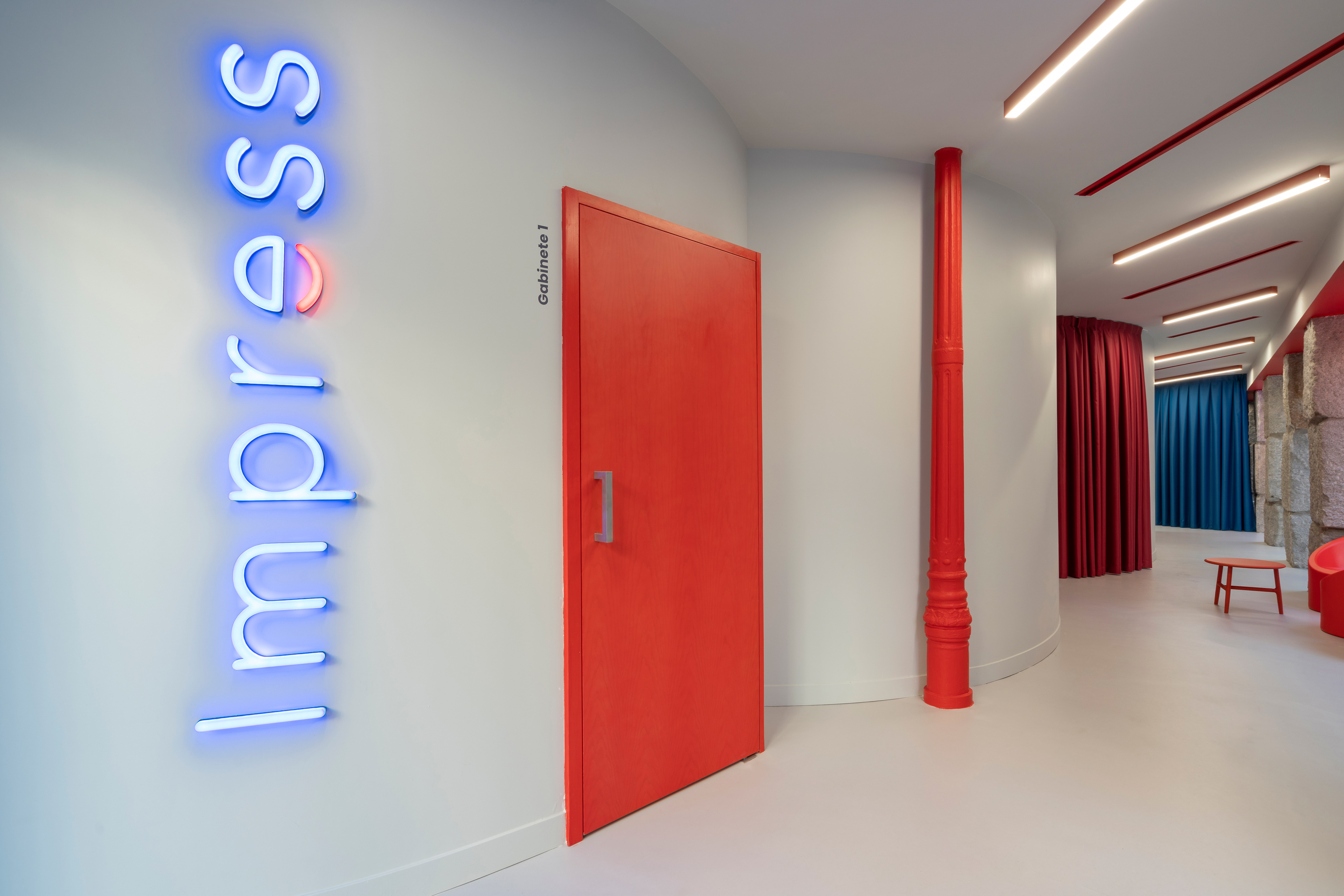 마드리드에 있는 Impress를 위한 이 새로운 진료소는 Carranza 거리의 번화한 모퉁이에 위치해 있다. 거대한 화강암 마름돌이 거리와의 경계를 구분하고 내부의 가늘고 세련된 연철 기둥이 대조를 이루고 있다. 이 두 포르티코(대형 건물 입구에 기둥을 받쳐 만든 현관 지붕) 사이의 두드러진 대조는 디자인 프로세스에 영감을 주었다. 실린더 형태의 일련의 곡선은 내부 벽을 둘러싸고 연철 기둥을 사용하여 내부 또는 외부에 남겨둔 채, 로비와 대기공간으로 사용되는 빈 공간을 남겨둔다. 철기둥 자체도 붉은색으로 칠해져 화강암의 돌기둥에 비해 장난기 가득한 모습을 보여주고 있다.