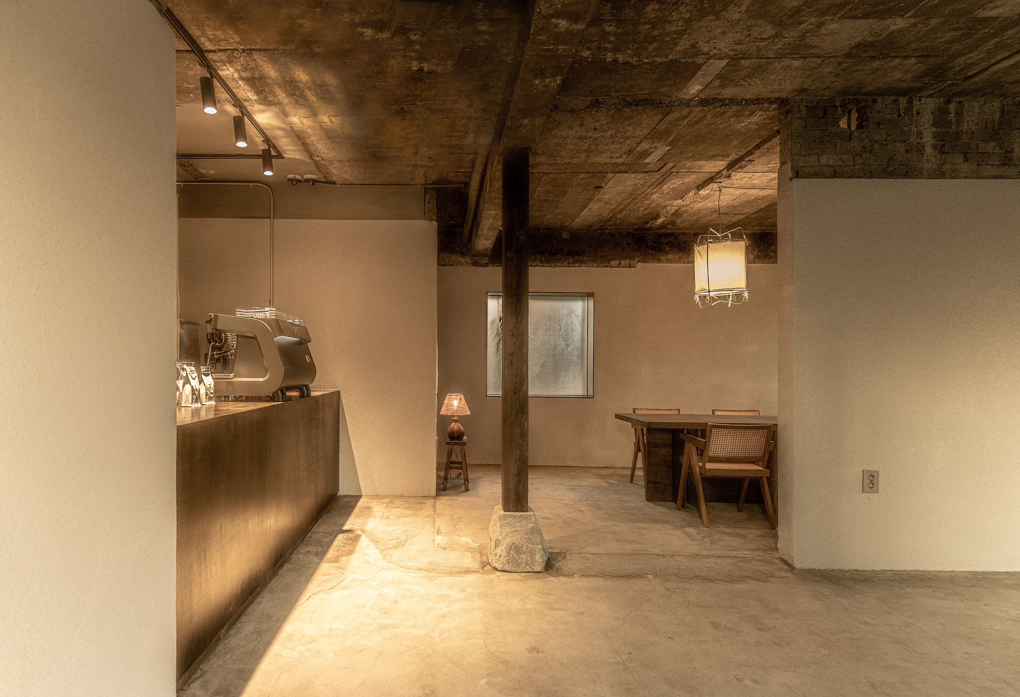 The interior floor, walls, and ceiling finish preserved the existing concrete finish after demolition. The wall that can reach a person's hand or body was finished with a Staco coating that most resembles concrete, not a white or clean coating that removes traces of the past. The design of light also excluded stimulating hidden lights and direct installed lights as much as possible, maintained minimal illumination with a Gat lamp using fabric, and pursued the same comfort as a lamp in the past. In particular, in summer, lights with regulators were used to make darker. This place, which used to be a small room, uses the window of the room to share the nature of the open garden and does not specifically design it. It only arranged sofas and stools made of old old wood with a time of about 50 years. The space, which used to be a large room, has a house on the back of the building, showing sunlight and opaque nature using translucent glass and protecting privacy. The bathroom was made of a washbasin with concrete-like finish that appeared after using or demolishing gravel in the yard.