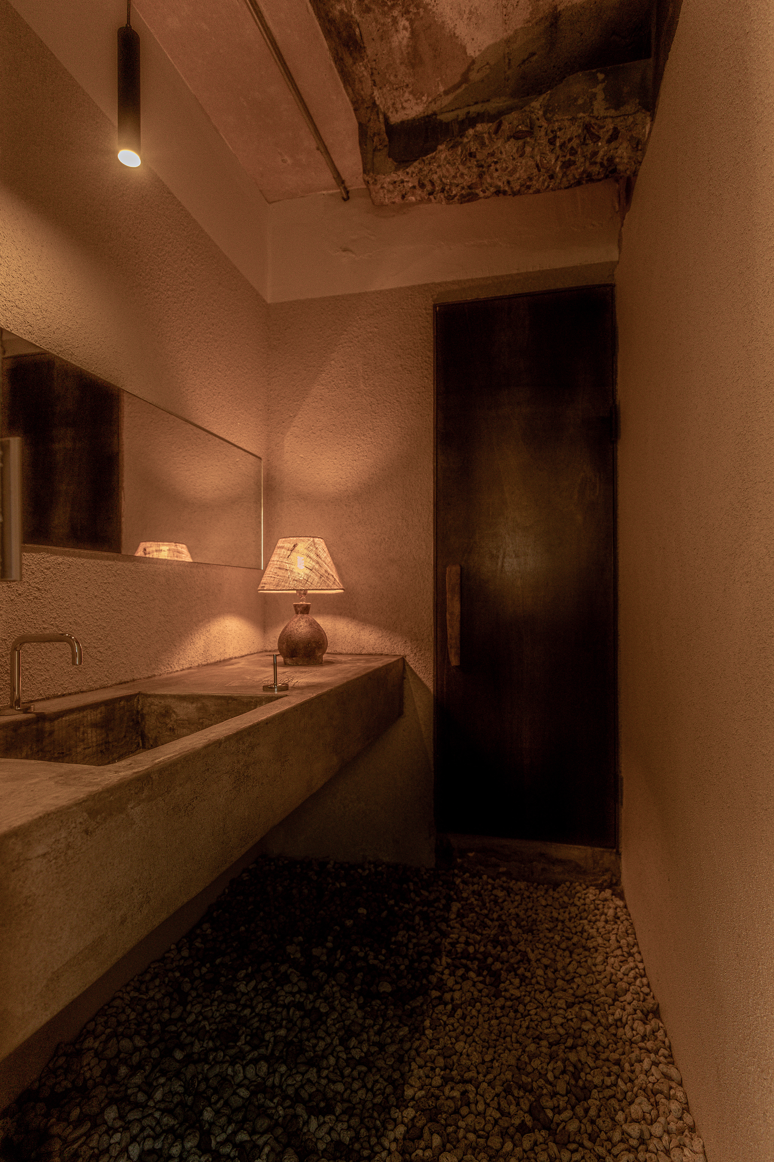 내부의 바닥, 벽체, 천장 마감은 철거 후 기존의 콘크리트 마감을 그대로 보존했다. 사람의 손이나 몸에 닿을 수 있는 벽체는 과거의 흔적이 제거되는 백색이나 깨끗한 도장이 아닌 콘크리트와 가장 흡사한 스타코 도장으로 마감했다. 빛의 설계도 자극적인 매입등이나 직부등을 최대한 배제하고 패브릭을 이용한 갓등으로 최소한의 조도를 유지하며 과거의 등불과 같은 편안함을 추구했다. 특히, 여름에는 어둡게 하기 위해 조절기가 설치된 조명을 이용했다. 작은방이었던 이 곳은 방의 창문을 이용해 오픈정원의 자연을 공유하고 있으며 특별히 디자인을 하지 않았다. 50년 정도의 시간성을 가지고 있는 오래 된 고재목들을 이용하여 제작한 소파와 스툴을 배치했을 뿐이다. 큰방이었던 공간은 건물의 후면에 주택이 있어 반투명 유리를 이용하여 햇빛과 불투명한 자연을 보여주며 프라이버시는 보호해 주고 있다. 화장실은 마당에 있던 자갈들을 이용하거나 철거하고 나타난 콘크리트와 같은 마감으로 세면대를 제작했다.