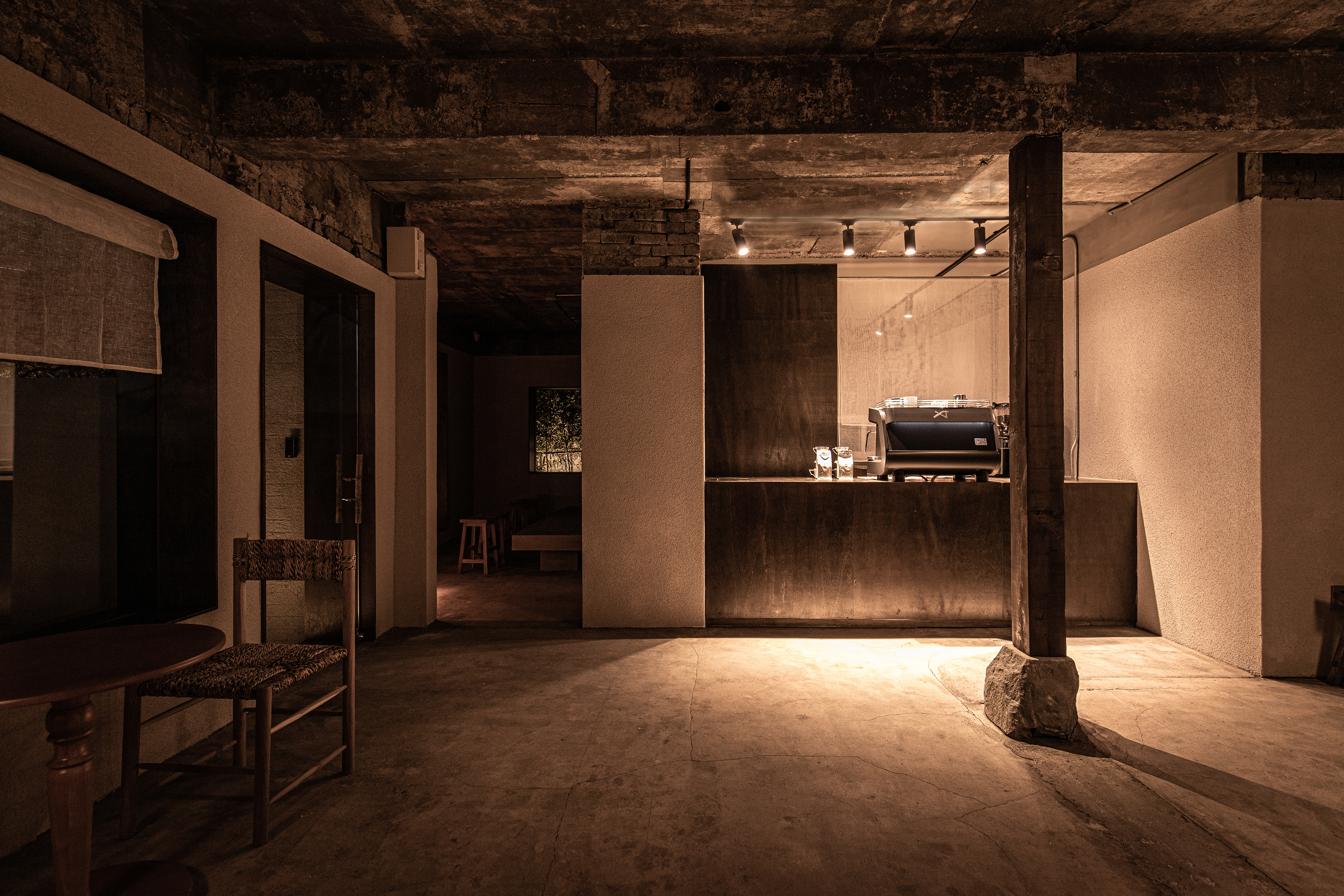 내부의 바닥, 벽체, 천장 마감은 철거 후 기존의 콘크리트 마감을 그대로 보존했다. 사람의 손이나 몸에 닿을 수 있는 벽체는 과거의 흔적이 제거되는 백색이나 깨끗한 도장이 아닌 콘크리트와 가장 흡사한 스타코 도장으로 마감했다. 빛의 설계도 자극적인 매입등이나 직부등을 최대한 배제하고 패브릭을 이용한 갓등으로 최소한의 조도를 유지하며 과거의 등불과 같은 편안함을 추구했다. 특히, 여름에는 어둡게 하기 위해 조절기가 설치된 조명을 이용했다. 작은방이었던 이 곳은 방의 창문을 이용해 오픈정원의 자연을 공유하고 있으며 특별히 디자인을 하지 않았다. 50년 정도의 시간성을 가지고 있는 오래 된 고재목들을 이용하여 제작한 소파와 스툴을 배치했을 뿐이다. 큰방이었던 공간은 건물의 후면에 주택이 있어 반투명 유리를 이용하여 햇빛과 불투명한 자연을 보여주며 프라이버시는 보호해 주고 있다. 화장실은 마당에 있던 자갈들을 이용하거나 철거하고 나타난 콘크리트와 같은 마감으로 세면대를 제작했다.