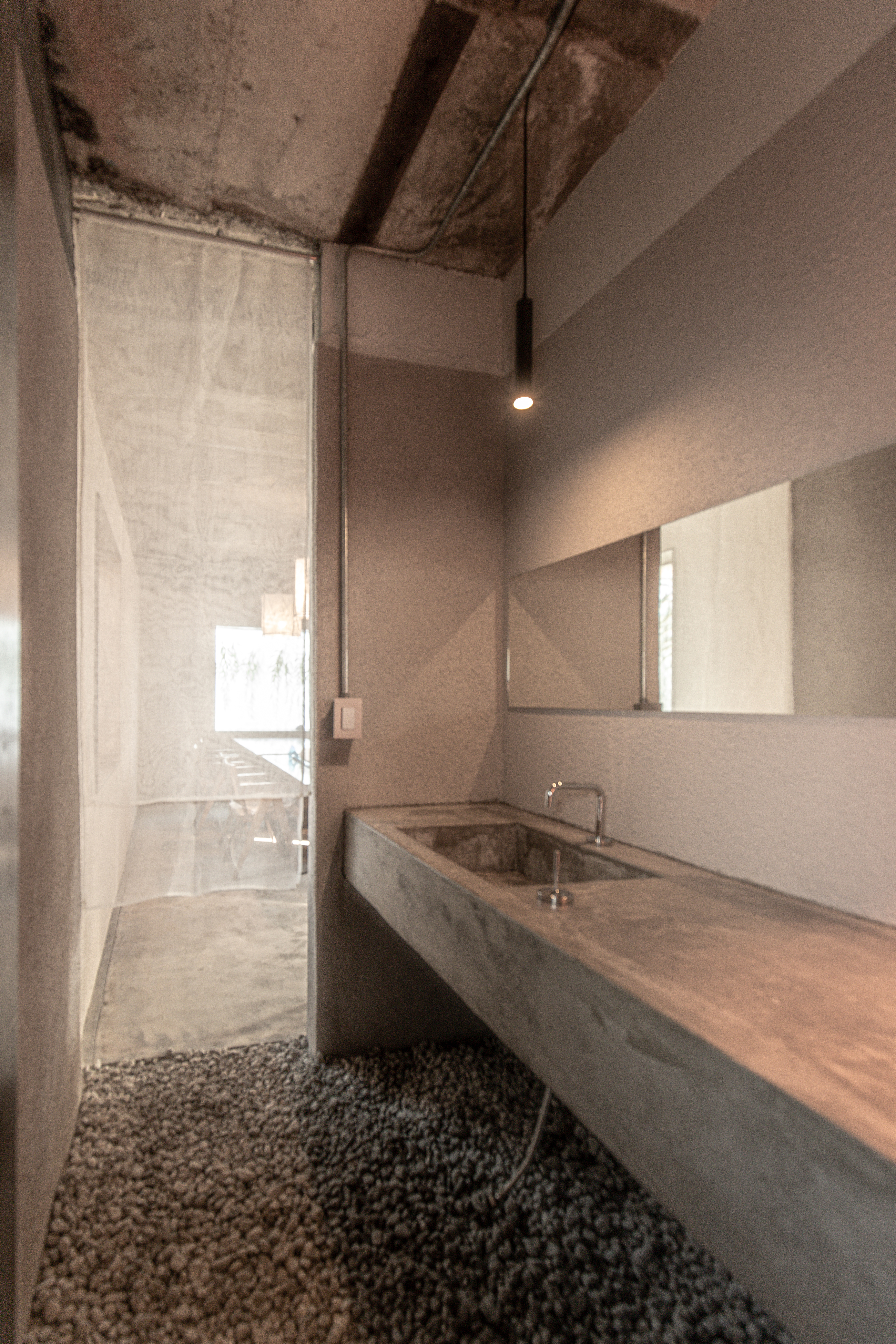 The interior floor, walls, and ceiling finish preserved the existing concrete finish after demolition. The wall that can reach a person's hand or body was finished with a Staco coating that most resembles concrete, not a white or clean coating that removes traces of the past. The design of light also excluded stimulating hidden lights and direct installed lights as much as possible, maintained minimal illumination with a Gat lamp using fabric, and pursued the same comfort as a lamp in the past. In particular, in summer, lights with regulators were used to make darker. This place, which used to be a small room, uses the window of the room to share the nature of the open garden and does not specifically design it. It only arranged sofas and stools made of old old wood with a time of about 50 years. The space, which used to be a large room, has a house on the back of the building, showing sunlight and opaque nature using translucent glass and protecting privacy. The bathroom was made of a washbasin with concrete-like finish that appeared after using or demolishing gravel in the yard.