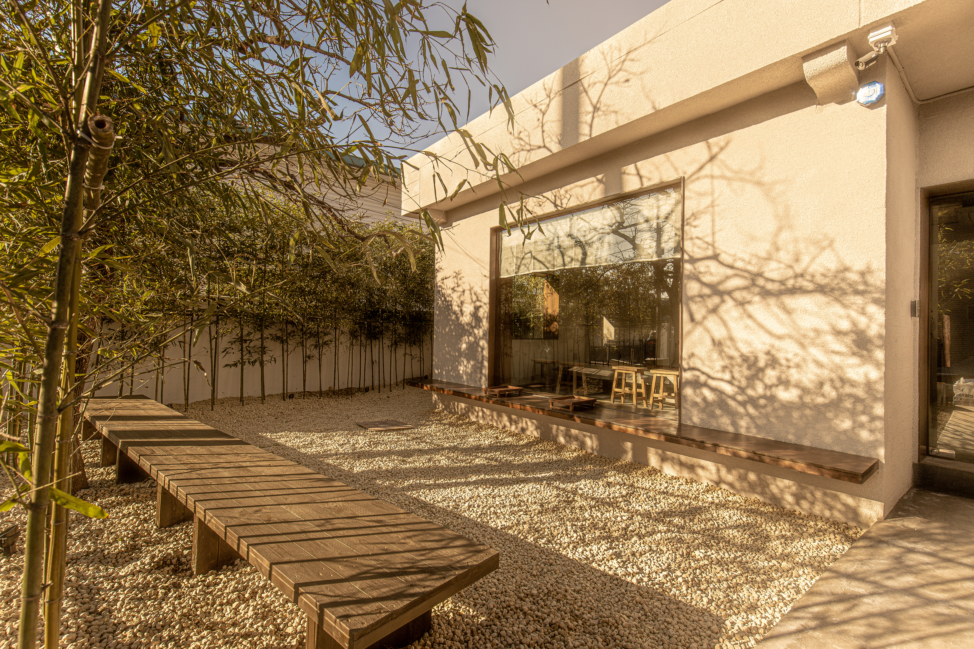 좌측의 담은 허물어 내부와 관계를 맺고 우측은 기존의 담을 보존하여 프라이빗 가든으로 조성했다. 내부로 들어오면 연결되는 이 정원은 30년 된 모과나무를 그대로 보존하고 잡석들과 긴 벤치를 무심히 배치했다. 이 나무는 가든의 중심축이 되어주며 자연의 아늑함과 오래된 시간성을 내포해준다. 한 그루의 나무와 담으로 이루어진 이 정원은 외부와 단절된 채 하늘이라는 자연과 교감할 수 있는 정원으로 설계했다.