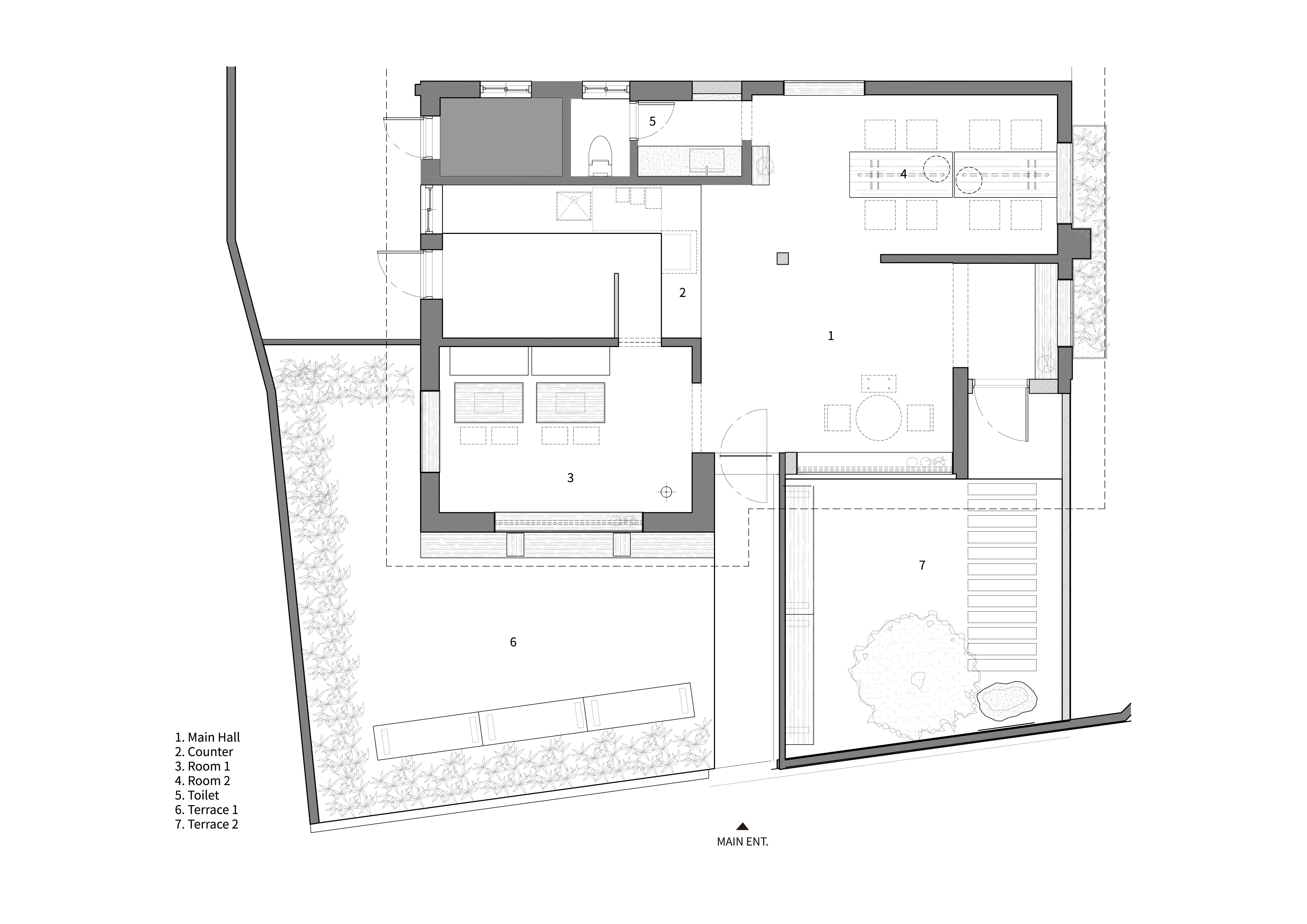 The wall on the left was demolished and related to the inside, and the right side was created as a private garden by preserving the existing wall. This garden, which is connected to the inside, preserves the 30-year-old quince tree as it is and inadvertently arranges rubble and long benches. This tree serves as the central axis of the garden and implies the coziness of nature and old timeliness. The garden, consisting of a single tree and a wall, is designed as a garden that can communicate with nature, the sky, cut off from the outside.