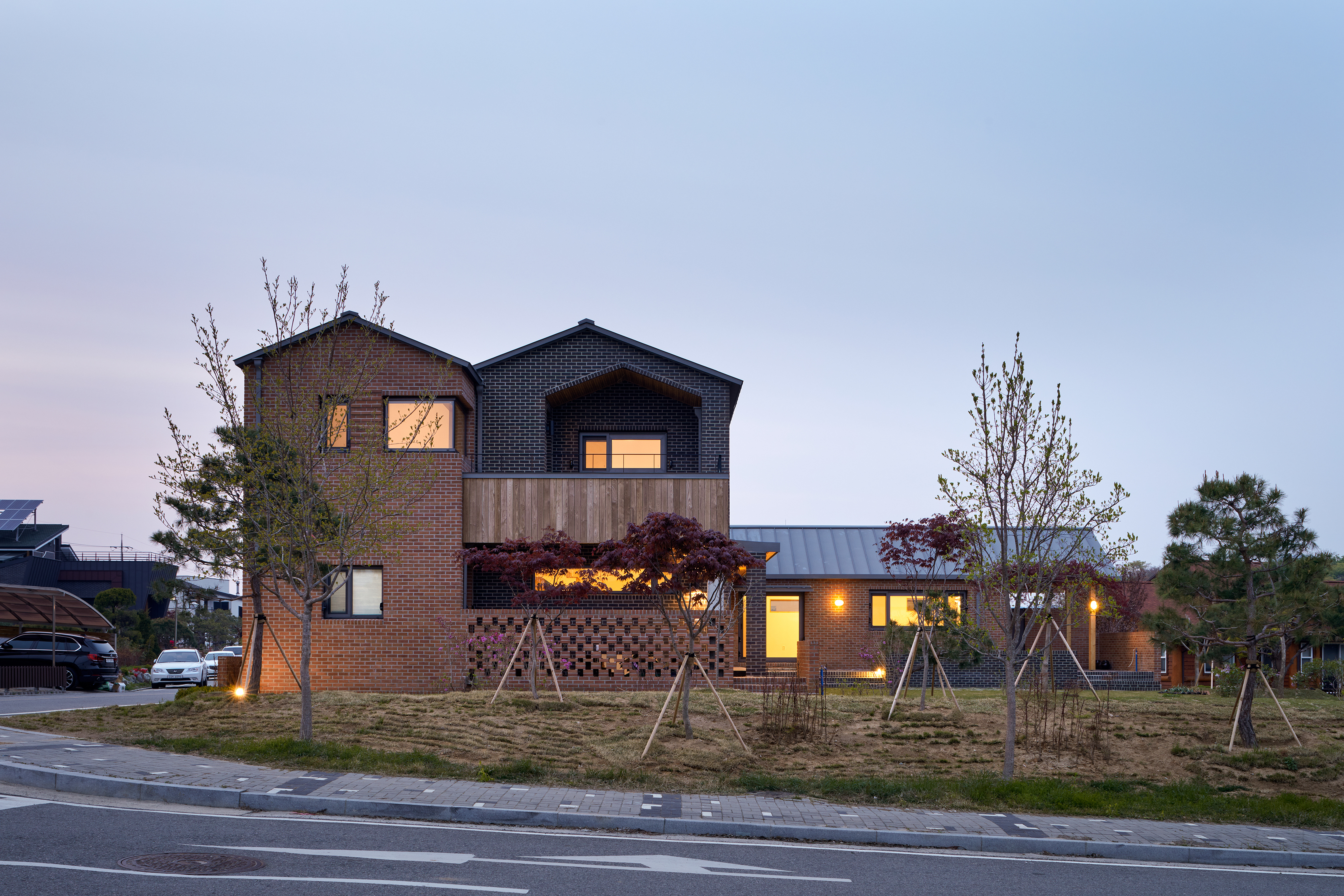 The area of the separate building was separated from the entrance of the front door. As it is connected to the main building in an L-shape, the clients can see each other through the straight and neat front yard. Since the spaces covered by the roof outside are included in the floor area of the house, it lays a burden on the size of the house, but they enrich the use of external space in real life. From the moment the front door is entered, an extensive corridor window that draws attention to the yard is connected to the living room, and the view seen from the interior is widely open towards the mountains in the direction of the lake. The length of the low gable roof of the separate building was extended to the platform for crocks to help with the stability and gaze of the yard, and due to the roof, they are connected to the exterior storage house behind the platform for crocks. The ponderous appearance of Moaksan or the landscape of the mountain that stretches out far away while surrounding Gui Lake are landscapes that the gable roof best harmonizes with in a stable way. The scale of the house seems to be divided into three masses, and there are three gable roofs that are characteristic of Wanju House. The sense of scale of the gable roof created by the division of masses seems comfortable. For the exterior material, bricks are finishing materials that one does not get tire of looking at even for a long time, they have a sense of warmth, and they are materials that are easy to manage and become better with time. Furthermore, it does not lay a burden on the surroundings. Two colors were chosen for this house, and the outer gable roof area was finished with red bricks and main volume of the living room and master bedroom area located towards the yard was finished with profound traditional bricks to avoid monotony and augment the sense of division of the masses.