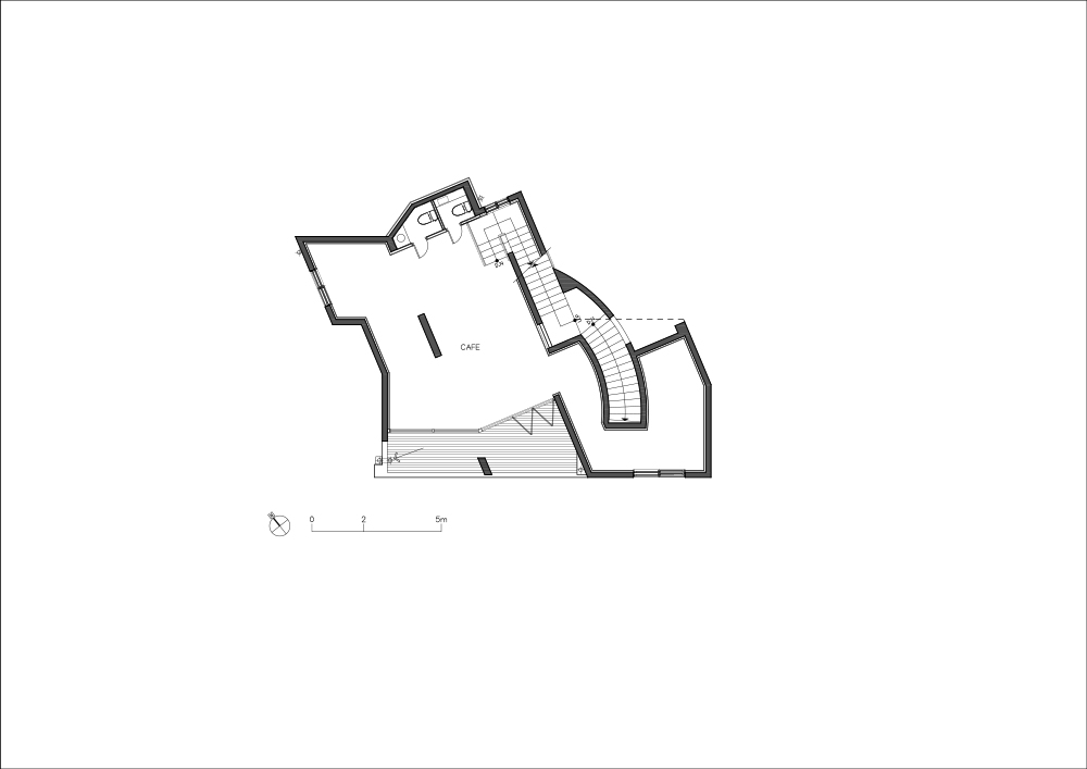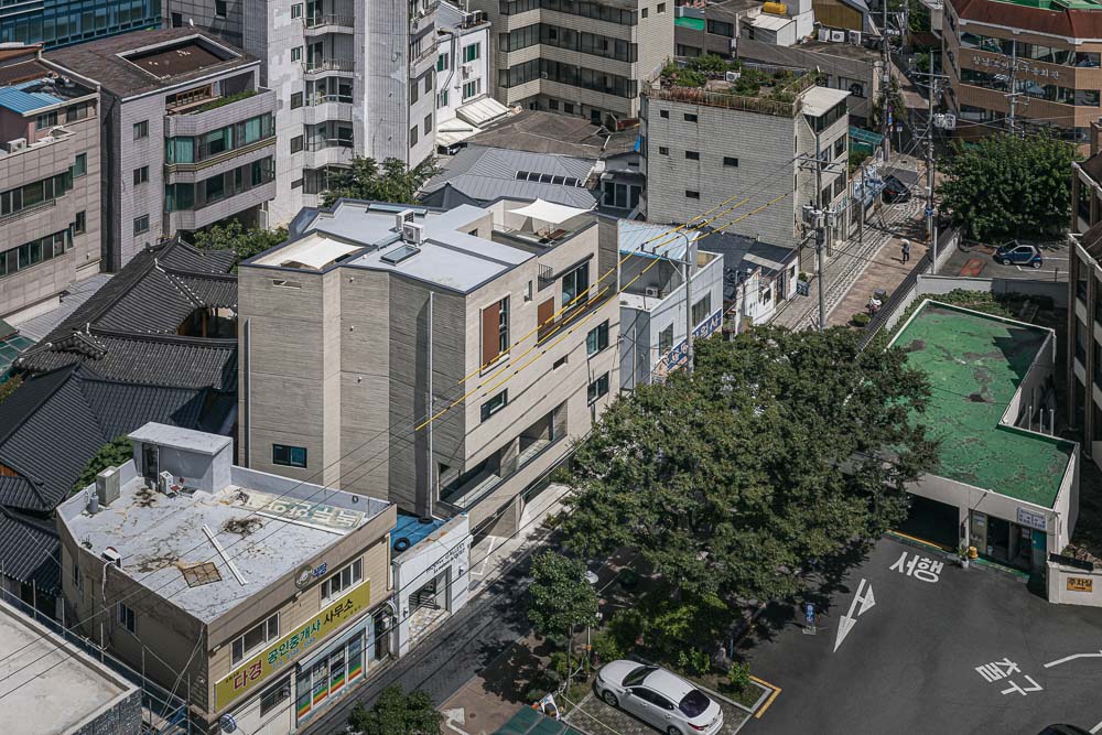 Considering the connection between Gyesan Cathedral located on the periphery of the site and the modern alley, a dining lounge was planned on the first and second floors. The third, fourth and fifth floors are residential spaces, overlooking the nearby Gyesan Cathedral and the First Church in the distance. In addition, because it is open towards an old zelkova tree, you can experience changes in seasons up close.