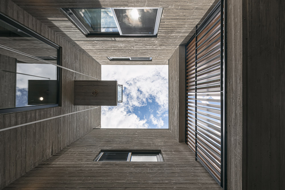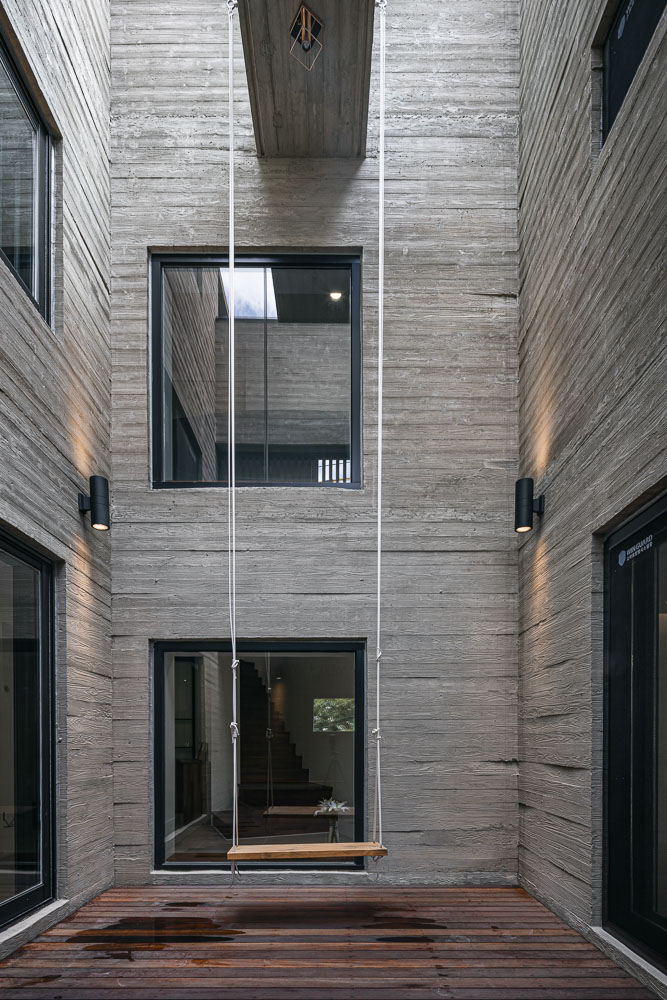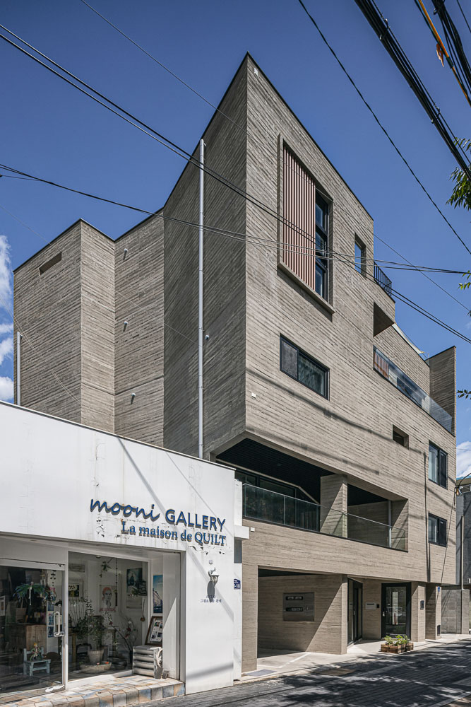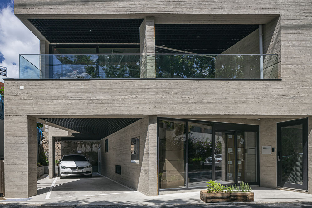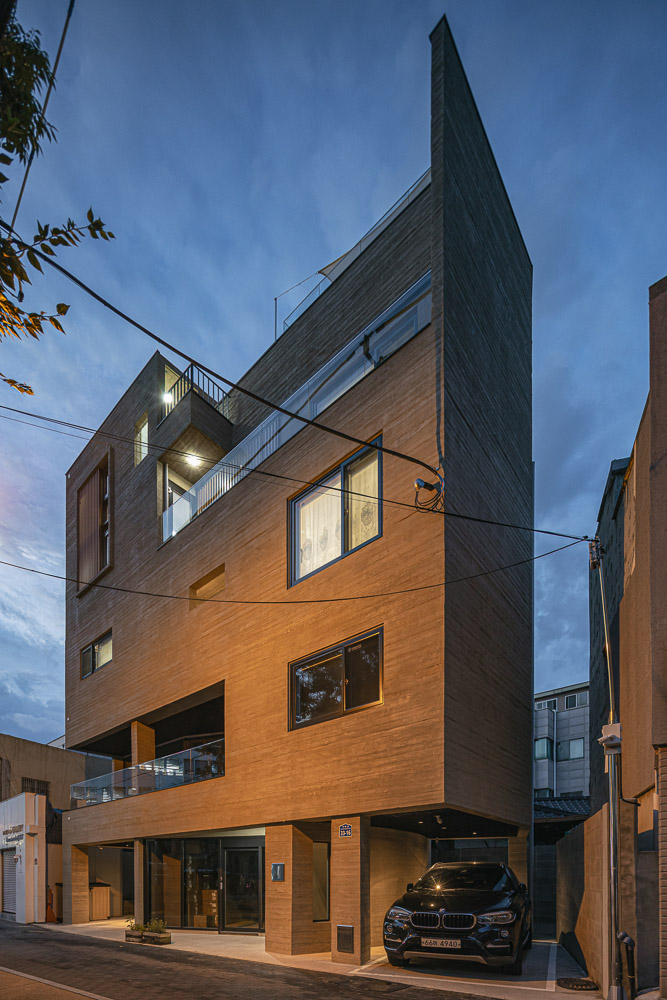 3층 주거 진입부는 마당깊은 집의 배경을 담아냄과 동시에 외부에서 내부로의 시선을 차단하는 효과를 내기 위해 스틸루버로 마감했으며, 주변과의 조화를 이루도록 재료의 물성이 그대로 표현되는 노출콘크리트로 마감했다. 내부의 중정과 두 곳의 휴식공간은 쉼이 내외부 구분 없이 이 건축물에 공존하도록 계획한 것이다. 중정은 상부의 루버형 슬라이딩 도어를 설치하여 직사광선이 차단되고 빛은 스며들어 실루엣 같은 효과가 연출된다.