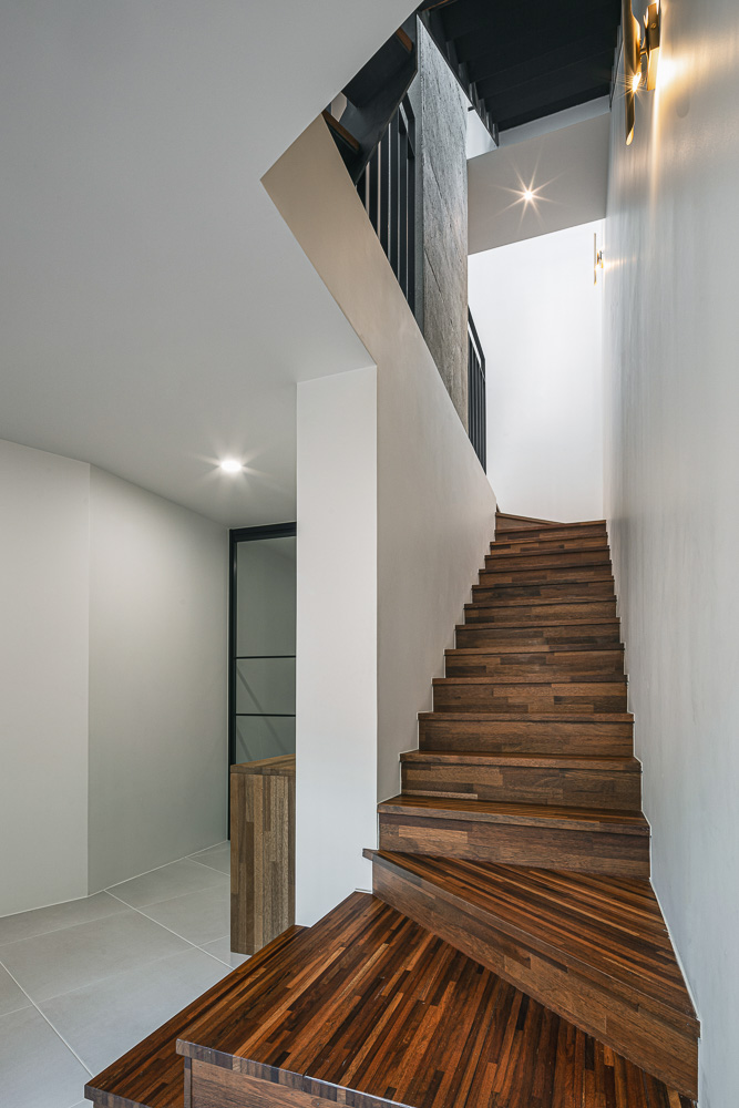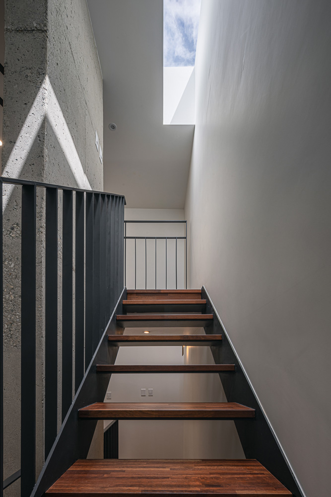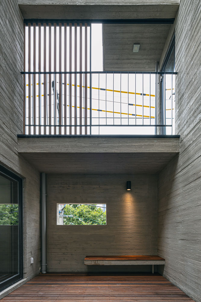 The entry area of the three-story house captures the background of the house with a deep yard, and the steel louver prevents the entry area from being seen from outside. An exposed concrete exterior, which expresses the physical properties of the material as it is, blends in with the surroundings.