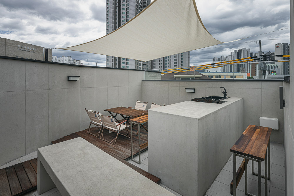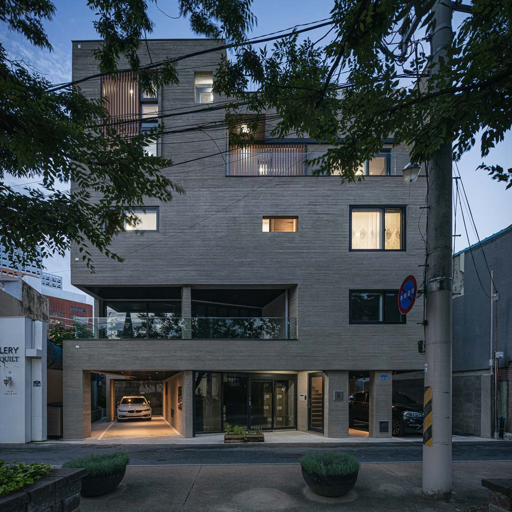 3층 주거 진입부는 마당깊은 집의 배경을 담아냄과 동시에 외부에서 내부로의 시선을 차단하는 효과를 내기 위해 스틸루버로 마감했으며, 주변과의 조화를 이루도록 재료의 물성이 그대로 표현되는 노출콘크리트로 마감했다. 내부의 중정과 두 곳의 휴식공간은 쉼이 내외부 구분 없이 이 건축물에 공존하도록 계획한 것이다. 중정은 상부의 루버형 슬라이딩 도어를 설치하여 직사광선이 차단되고 빛은 스며들어 실루엣 같은 효과가 연출된다.