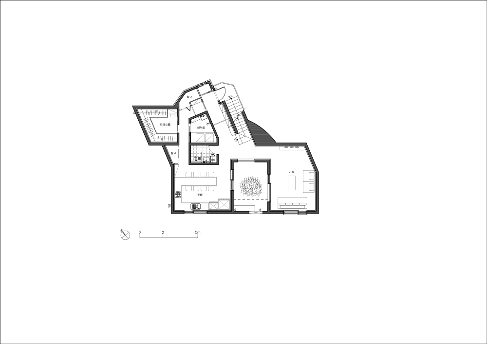 Considering the connection between Gyesan Cathedral located on the periphery of the site and the modern alley, a dining lounge was planned on the first and second floors. The third, fourth and fifth floors are residential spaces, overlooking the nearby Gyesan Cathedral and the First Church in the distance. In addition, because it is open towards an old zelkova tree, you can experience changes in seasons up close.