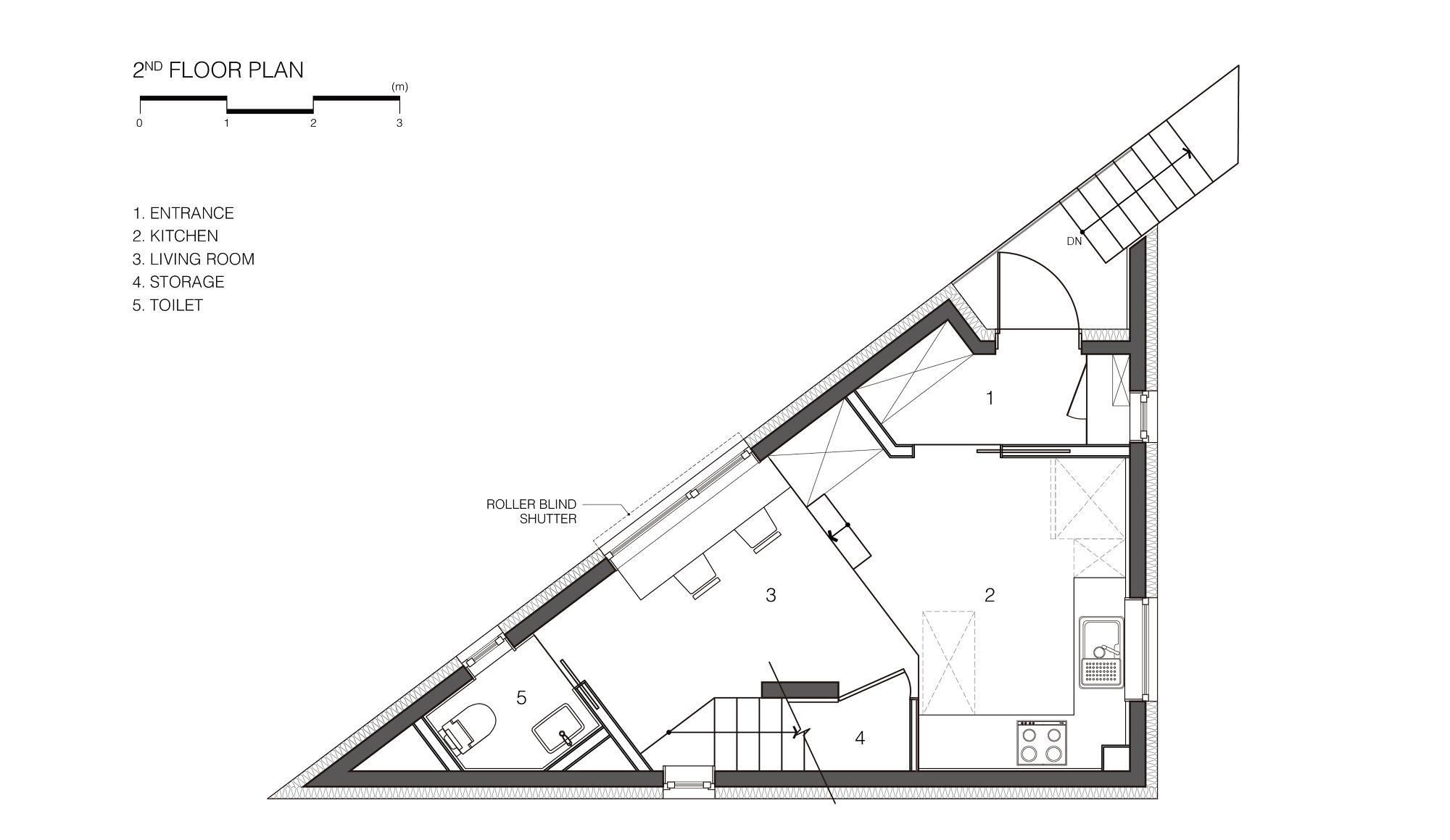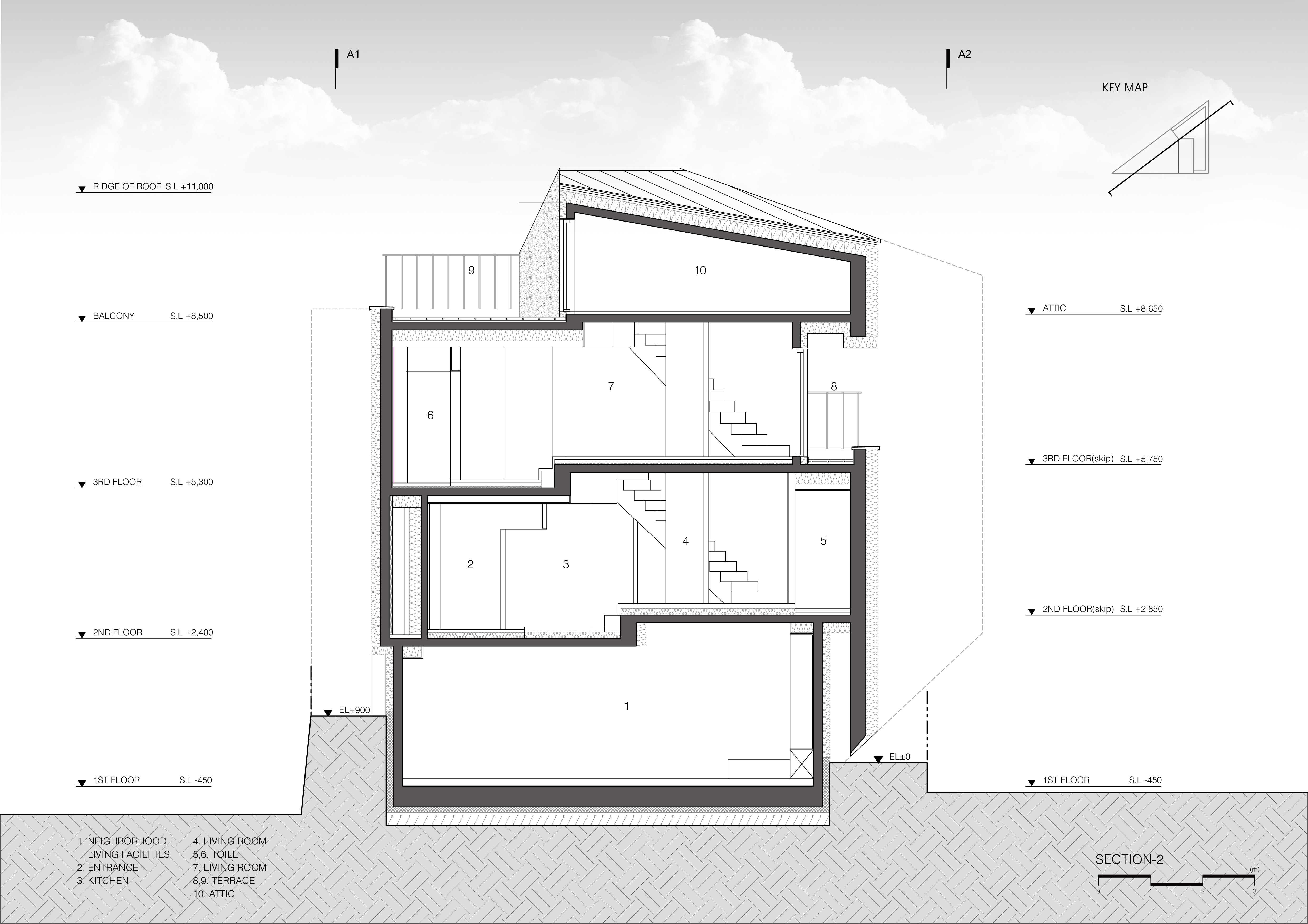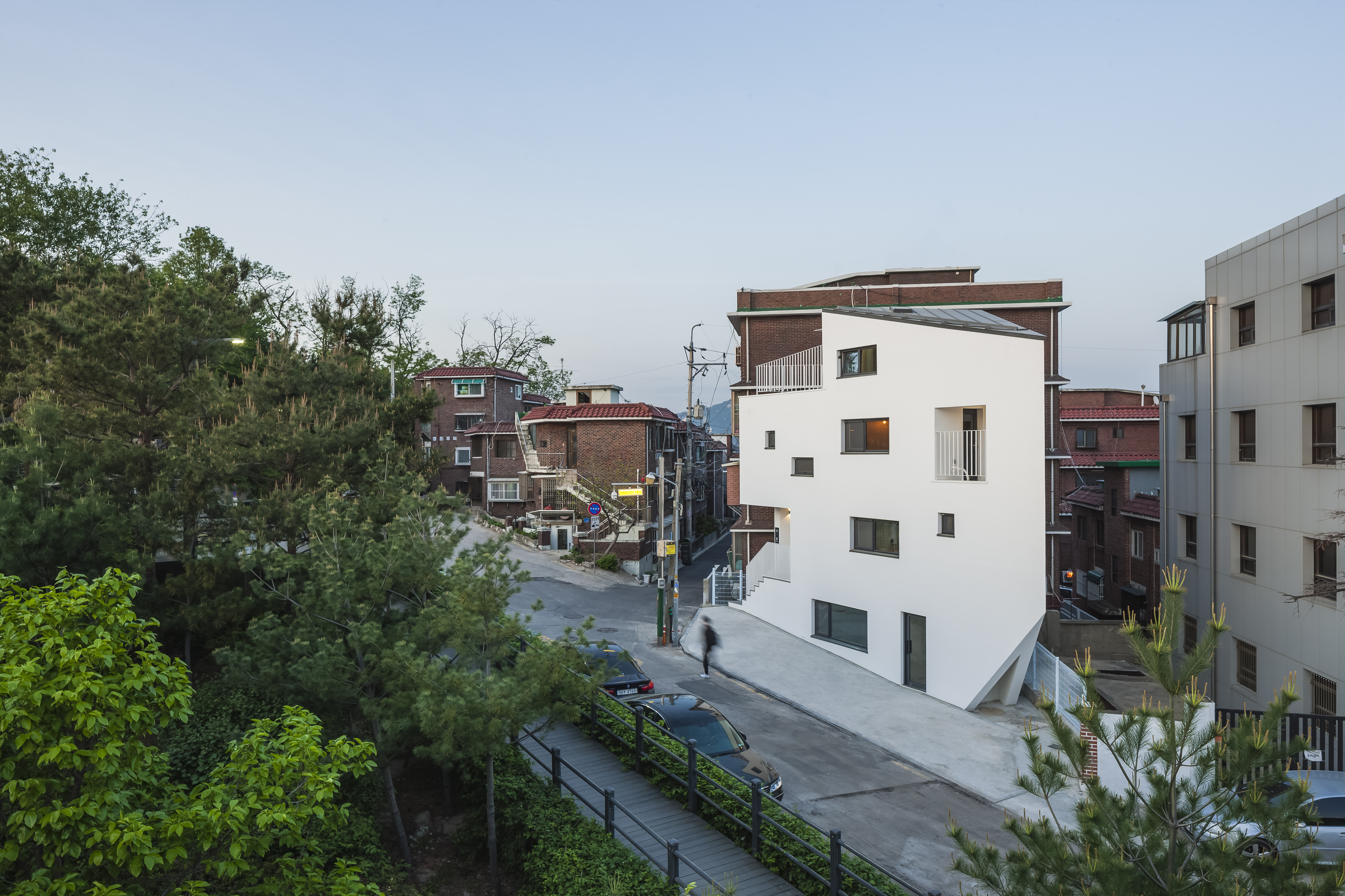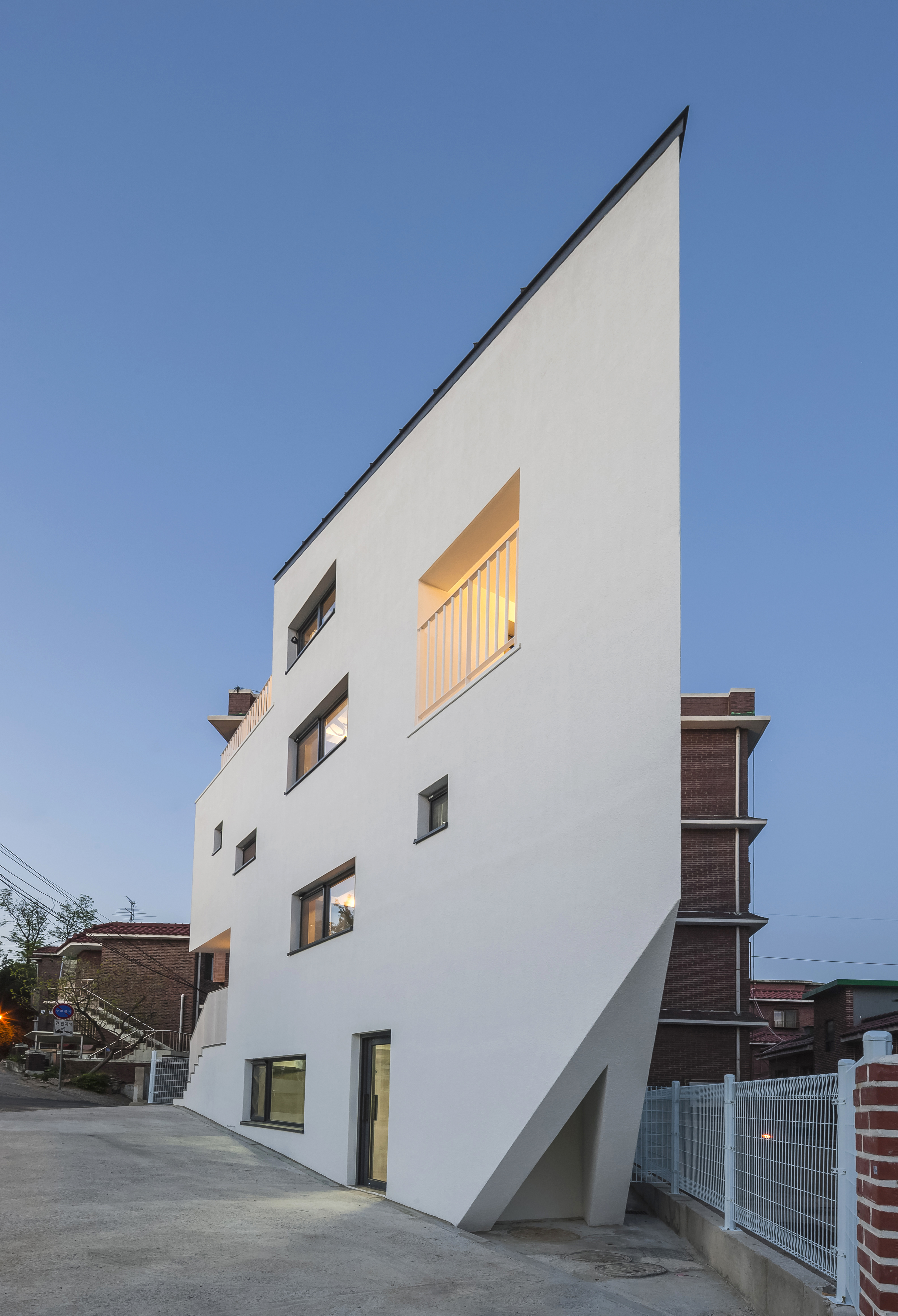 노을집은 저녁 노을 하늘을 바라볼 수 있는 서쪽에 창이 큰 집을 원하는 건축주를 위한 집이다. 집이 지어지기 전 대지에는 아주 오래전에 지어진 단층짜리 구옥이 있었다. 지적도 상의 대지 형태는 완전한 삼각형 이었고 땅의 크기는 고작 16.7평이었다. 이런 작은 땅에서 건물의 배치는 이미 정해져 있다. 다만, 출입구의 위치와 실내공간 구성 배치가 중요했다. 2층에서 1층으로 벽이 사선으로 꺽여지는 부분은 정화조, 계량기 등을 설치할 땅의 면적을 확보하기 위한 디자인 요소다. 이렇게 노을집은 땅의 모양을 그대로 받아 들이면서도 유니크한 디자인의 돋보이는 집이다. 주택의 내부는 건축물의 외벽이 주요 구조이며, 형태적으로도 자유롭고 강성이 큰 철근콘크리트 벽식구조로 지어졌다. 건축주가 원했던 ‘집같지 않은 집’의 콘셉트에 맞게 내부마감은 벽의 콘크리트 노출과 면처리를 통해 거친 마감이 되게 했고 이와 반대로 외부의 마감은 STO 외단열공법과 밝은 화이트색의 로투산페인트를 적용하여 외부에서 집안으로 들어섰을 때 느끼는 반전 같은 것을 의도했다. 내부의 색감이나 톤이 약간은 어두운 칼라가 적용이 되어 인더스트리얼 인테리어 분위기가 난다. 회색 벽의 색감과 어우러지는 바닥의 타일색과 질감, 부분적으로 사용된 페인트의 색상과 조명등이 조화를 이룬다. 1층은 임대소득을 얻을 수 있는 작은 상가다. 입주 후에는 작은 카페나 소규모 사무실 등으로 쓰일 수 있으며, 집과는 독립적으로 분리된 작은 공간이다. 2층부터 3층과 다락층까지는 건축주가 생활하는 주택이다. 서측 벽면에 놓인 오픈 욕조에는 저녁 하늘을 감상할 수 있는 적당한 크기의 창도 배치되어 있다. 2층과 3층에서 가장 큰창인 서향창은 외부 전동롤링셔터가 설치되어 있어 여름철 서향의 햇빛을 막아줄 수 있으면서도 일몰 후 서측의 노을을 감상할 수 있게 해주는 중요한 창이다. 대부분 예비 건축주들이 꺼려하는 서향에 창을 크게 내어 저녁 하늘을 감상하는 것이 집짓기의 가장 중요한 요소가 된 점, 어두운 톤의 내부의 색감으로 ‘집 같지 않은 집’의 느낌을 살려내고 싶어 한 점, 모든 공간이 층으로 구분은 되어 있지만 막힘없이 연결되어 있는 점 등이 특징이다.