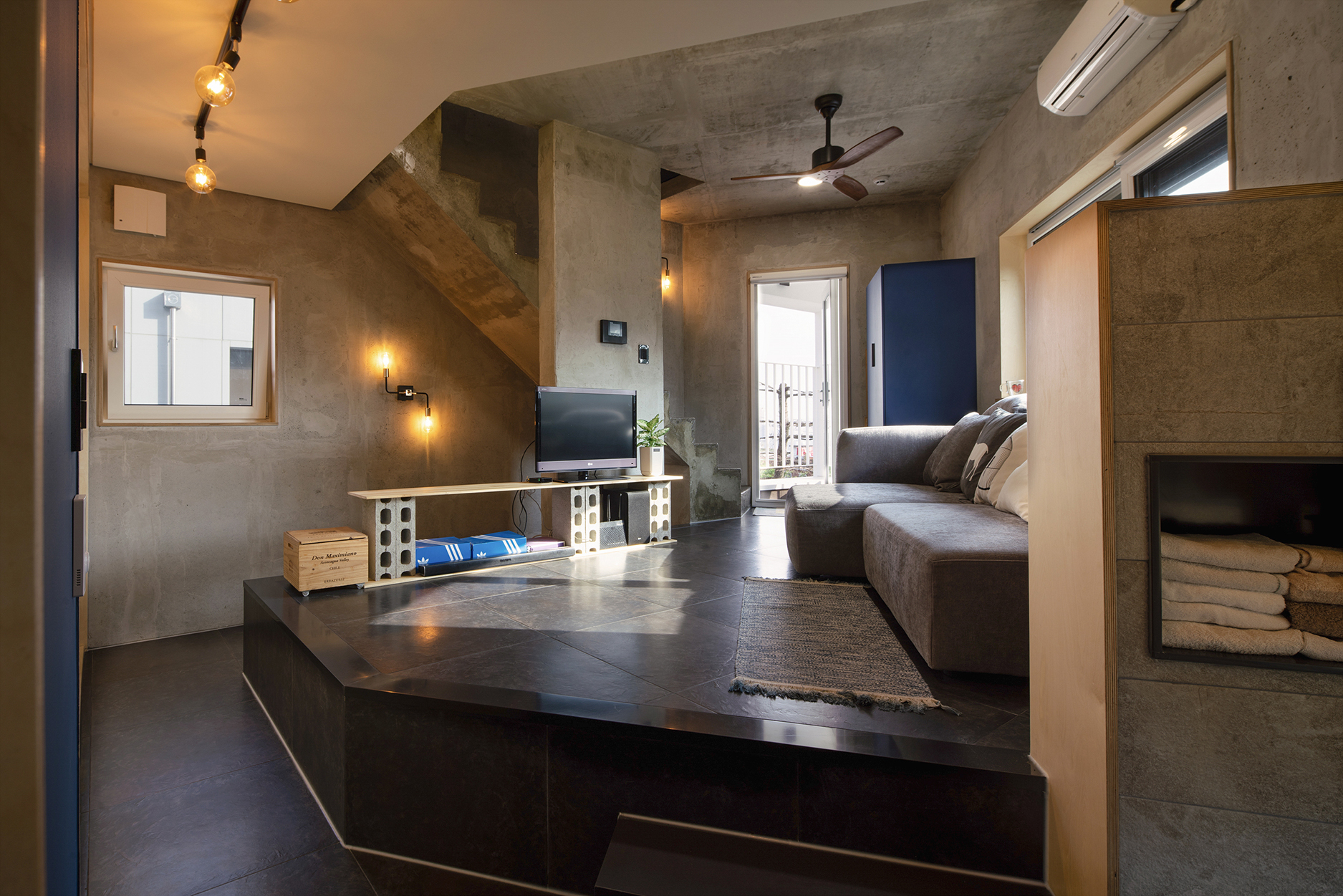 The Sunset House is for the client wanted see throught a large window to the western sky with the sunset sky. Before the house was built, the site had an old single-story house that was built a long time ago. The form of the site on the cadastral map was a complete triangle and the land was only 16.7 pyeongs. The building’s layout is already determined on such small lands. However, the location of the entrance and the composition of the interior space were important. The part where the wall from the second story to the first was diagonally cut is a design element to secure an area of the land to install the septic tank, meters, etc. In this way, Sunset House is a house that has accepted the shape of the land just as it is and also has a unique design that stands out. The building’s exterior walls are the main structure of the house’s interior and they were built with a reinforced concrete wall structure, which is morphologically free and has high rigidity. To match the concept of ‘a house unlike a house’ that the client wanted, the interior was roughly finished by exposing the concrete and finishing the surface with it, and contrarily, by applying STO external insulation and bright white lotusan paint to the exterior finish, a twist of some sorts that is felt when entering the house from the exterior was intended for. Slightly darker colors were applied for the interior’s colors and tone, providing it an industrial interior atmosphere. The floor’s tile color, texture, the color of the partially used paint and lights that go well with the color of the gray walls all harmonize with each other. The 1st floor is a small shop where rental income can be earned. After moving in, the space can be utilized as a small cafe or office, and it is a small space separate from the house. The 2nd to the 3rd floors and the attic are the house where the client lives. The open bathtub placed on the western wall also has an appropriately sized window where the evening sky can be enjoyed. The western windows, which are the largest windows on the 2nd and 3rd floors, have external electric rolling shutters that allow the sunlight from the west in summer to be blocked and they are important windows that allow the sunset in the west to be enjoyed. The fact that placing a large window in the west, which most prospective owners avoid, and enjoying the evening sky became the most important element in building the house, the fact that the feeling of ‘a house unlike a house’ was aimed to be emphasized with the interior’s dark-toned colors, and the fact that all spaces are divided by floors yet seamlessly connected are the most distinct features of this house.