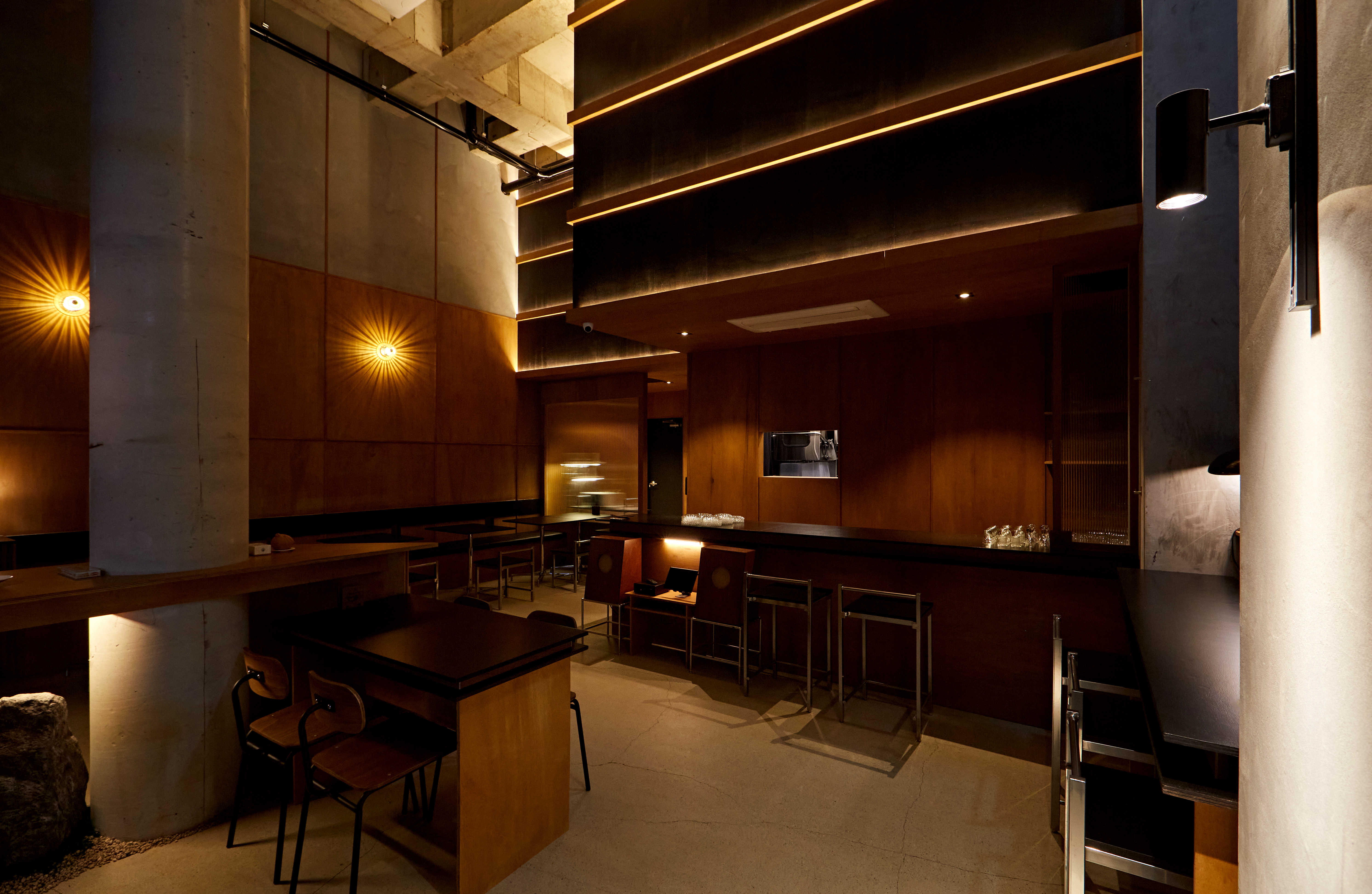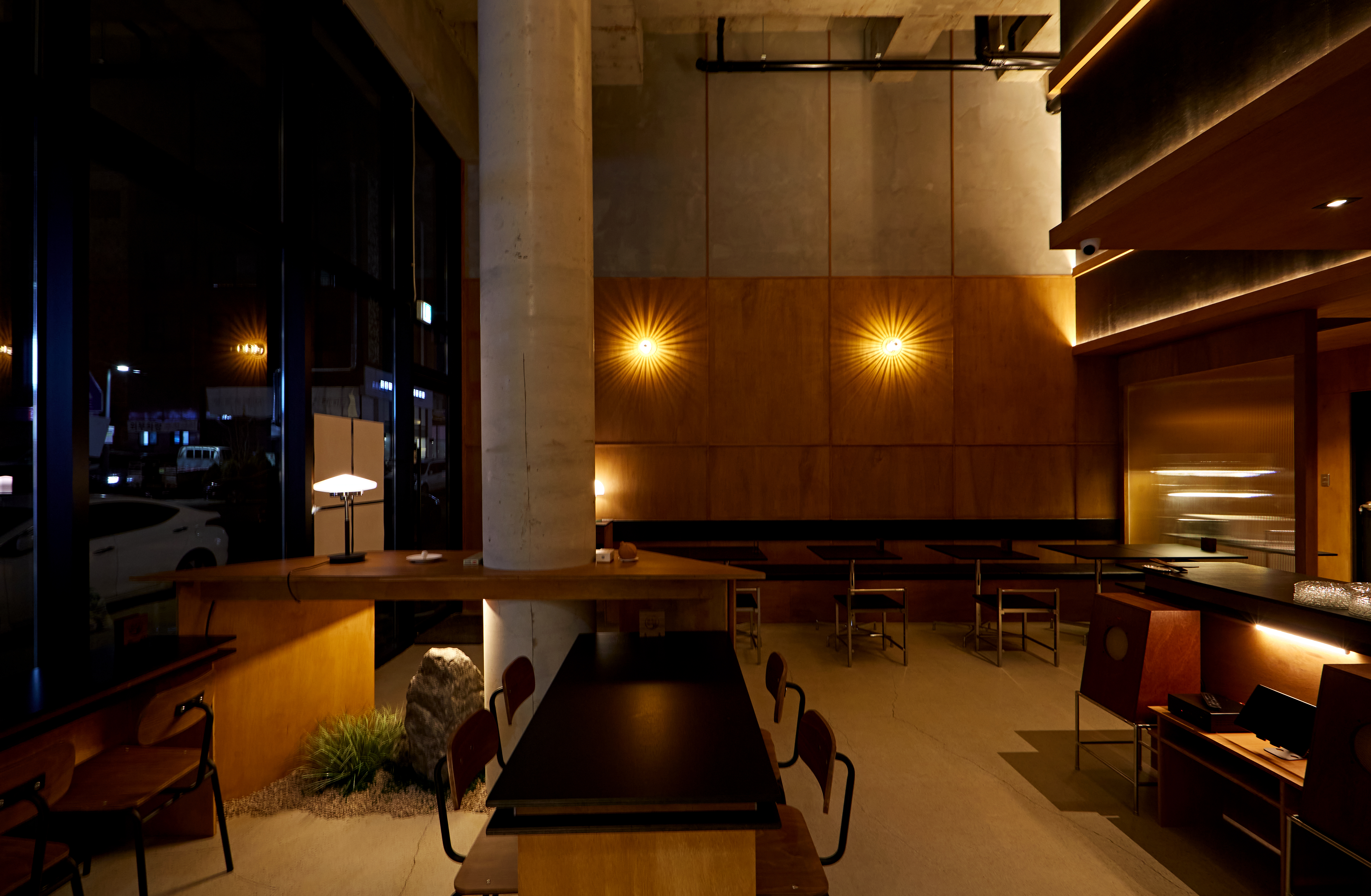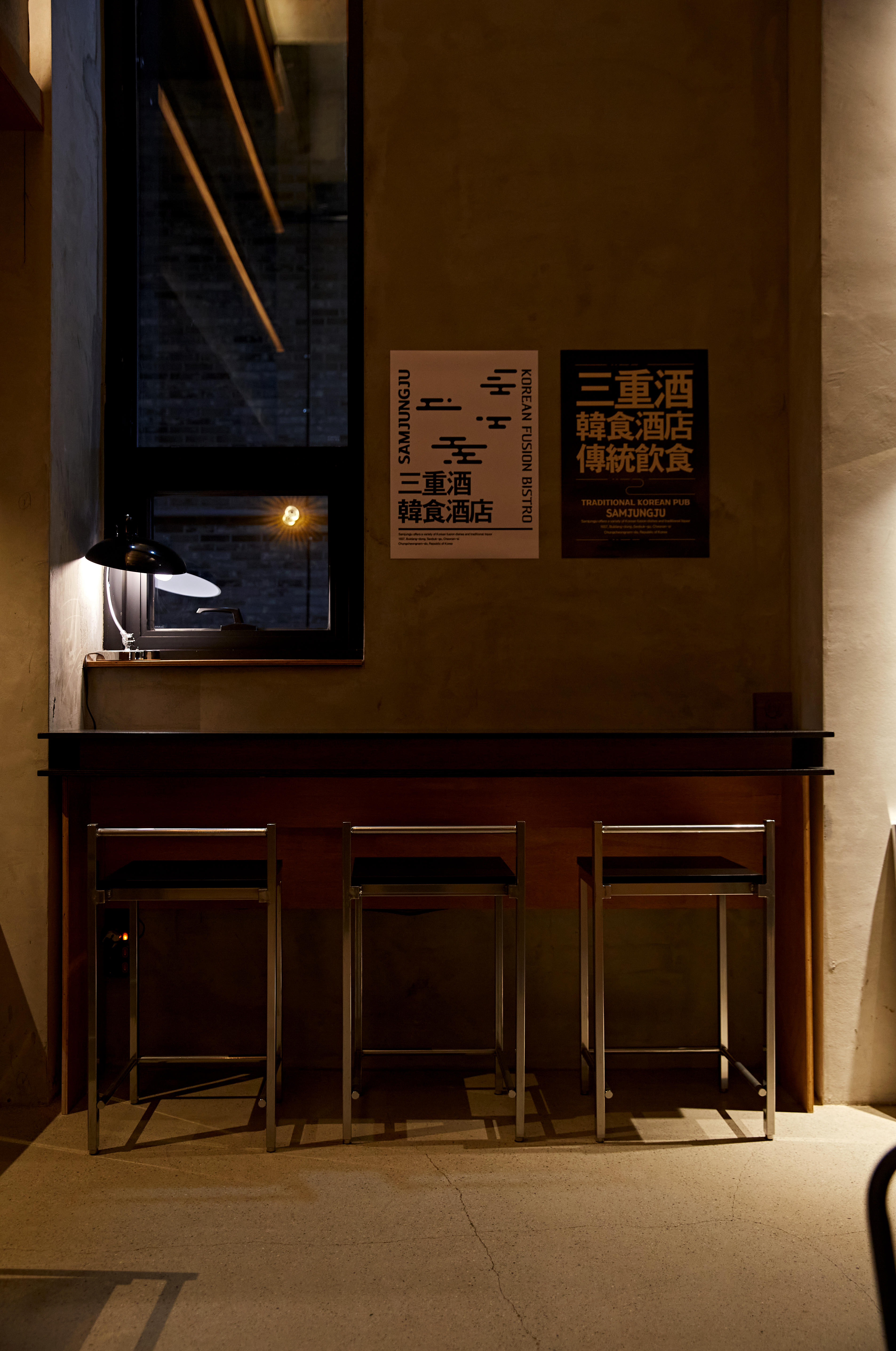 Sam joong joo(三重酒) means "clean alcohol which is filtered for three times." Along with unfamiliar Korean-based fusion foods, it offers a familiar yet different experience with various types of traditional liquor. The site with a high ceiling height was thought to be a large drawing paper that could capture the image to be expressed. The large ceiling structure seen from the front contains the frame of hieroglyphics of the store name. Traditional images were expressed by using plywood, and black-toned textures used everywhere represent modern images. The combination of achromatic colors, concrete, and wood was used to remind the image of fusion food which the brand contains.