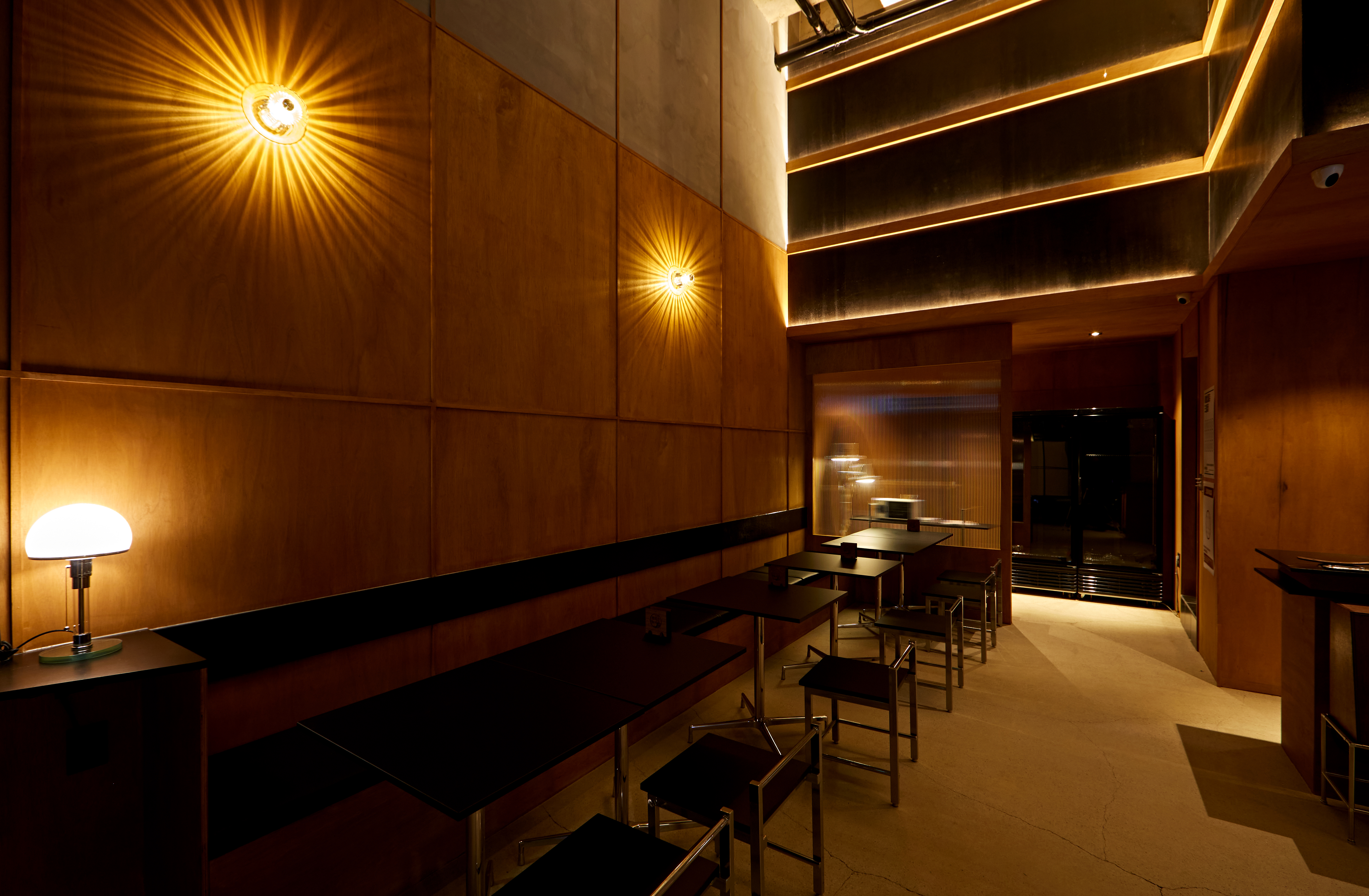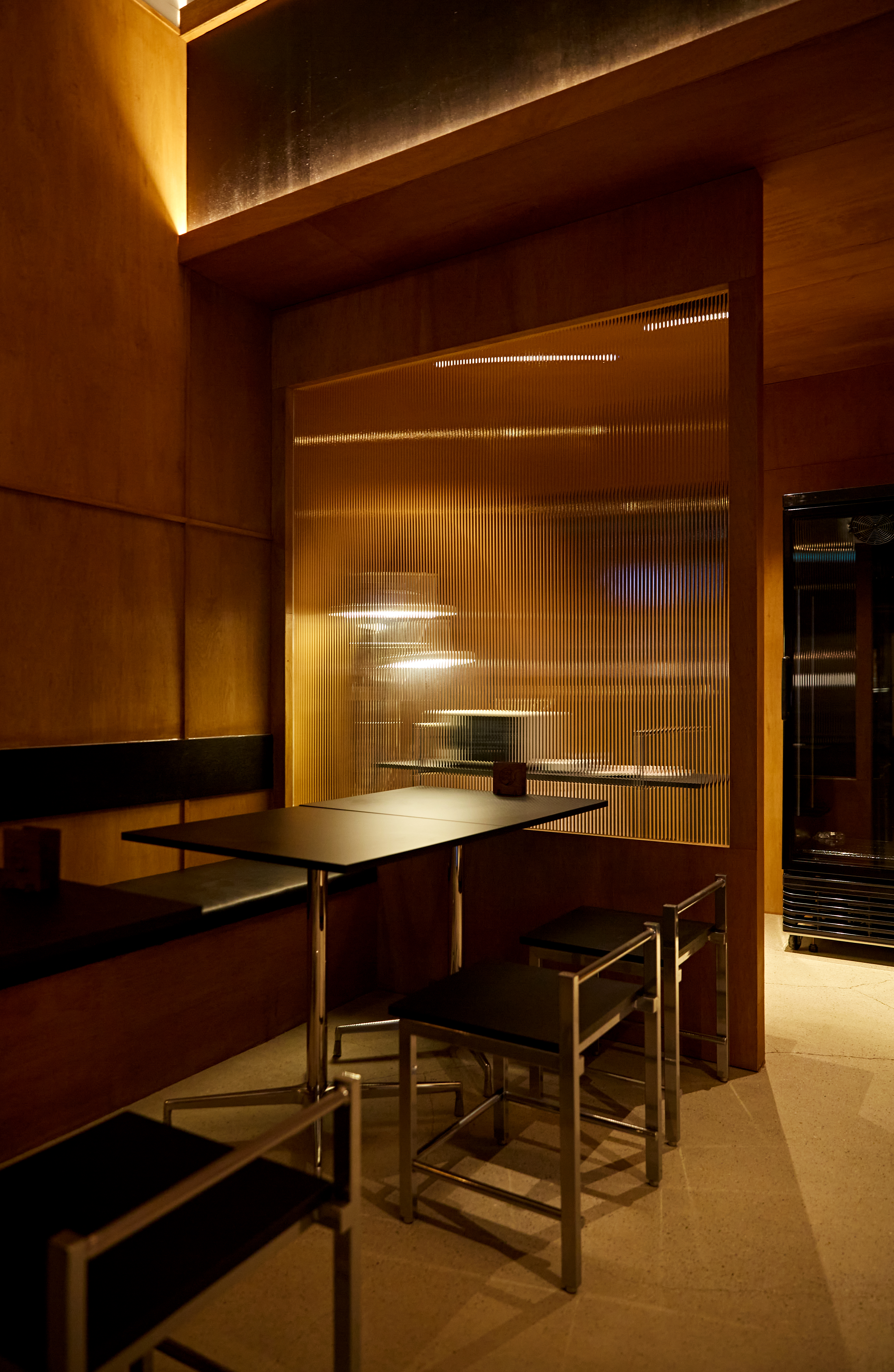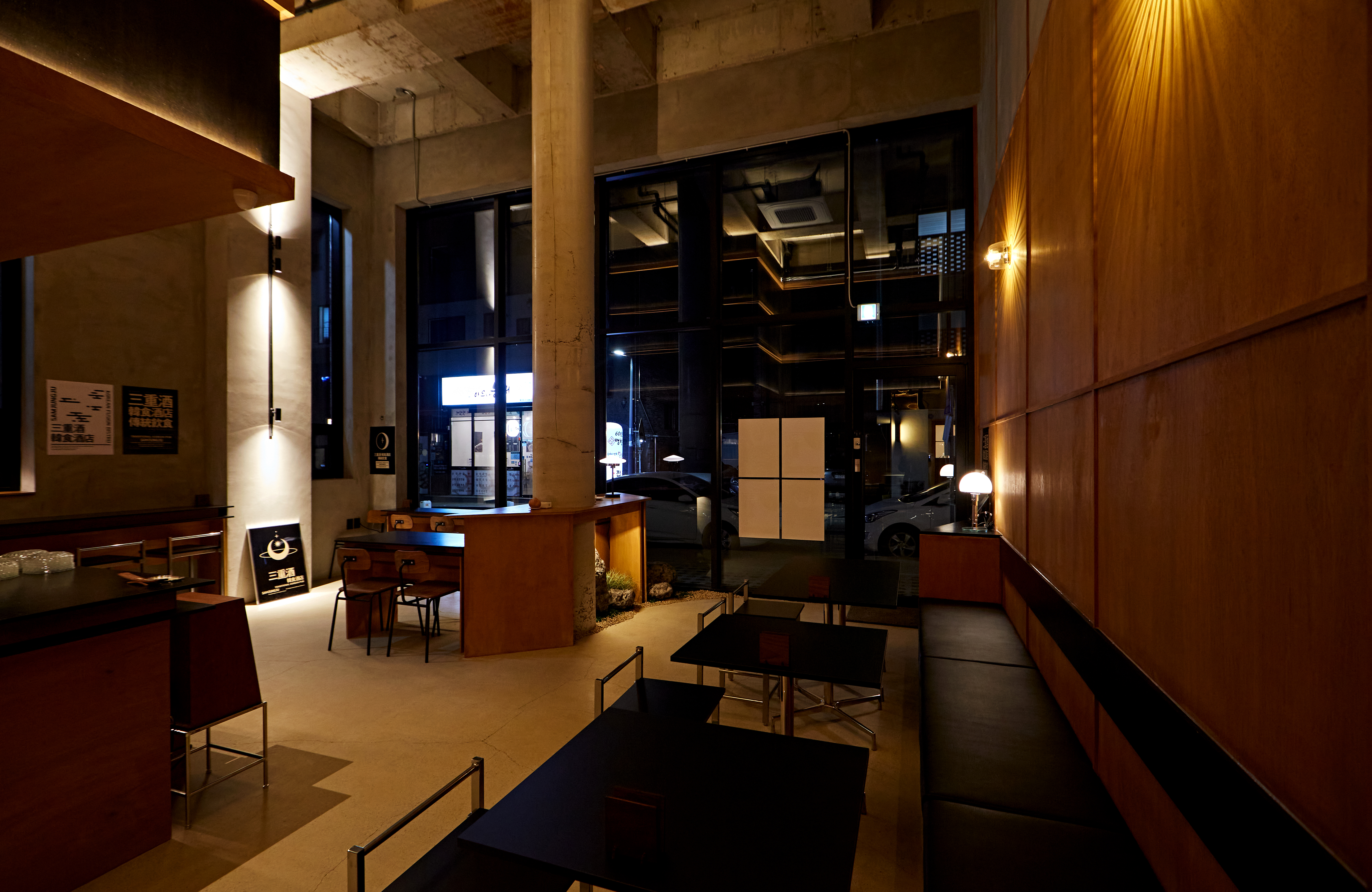Sam joong joo(三重酒) means "clean alcohol which is filtered for three times." Along with unfamiliar Korean-based fusion foods, it offers a familiar yet different experience with various types of traditional liquor. The site with a high ceiling height was thought to be a large drawing paper that could capture the image to be expressed. The large ceiling structure seen from the front contains the frame of hieroglyphics of the store name. Traditional images were expressed by using plywood, and black-toned textures used everywhere represent modern images. The combination of achromatic colors, concrete, and wood was used to remind the image of fusion food which the brand contains.