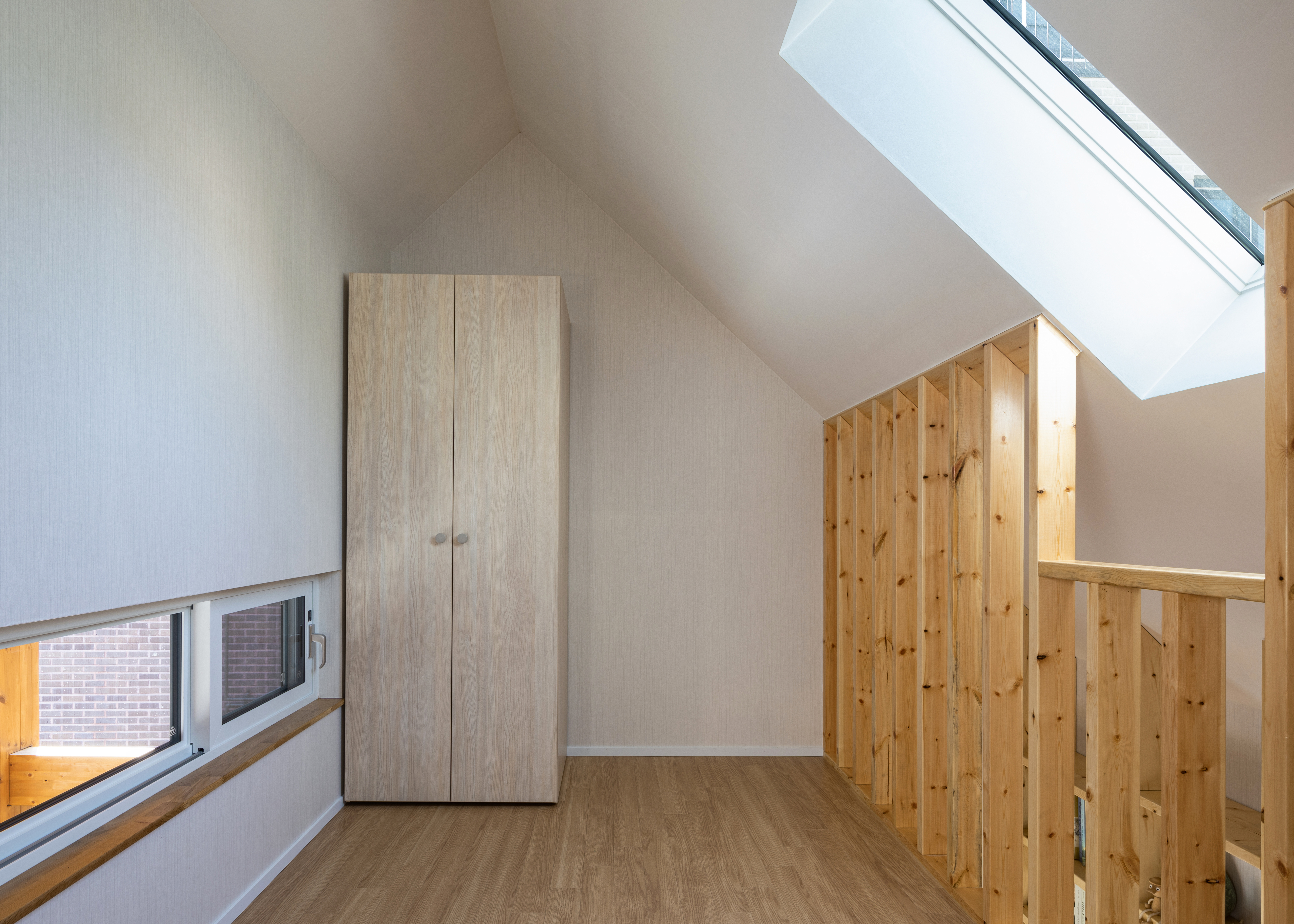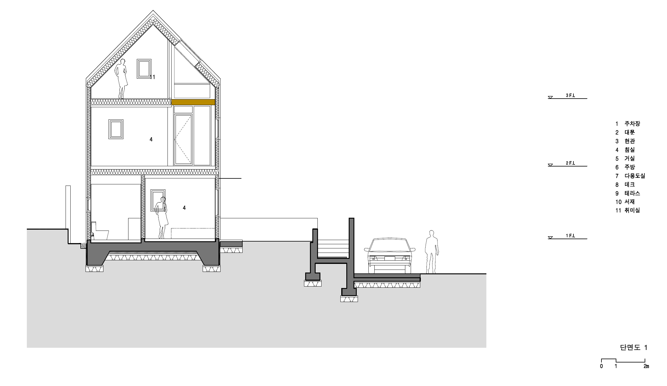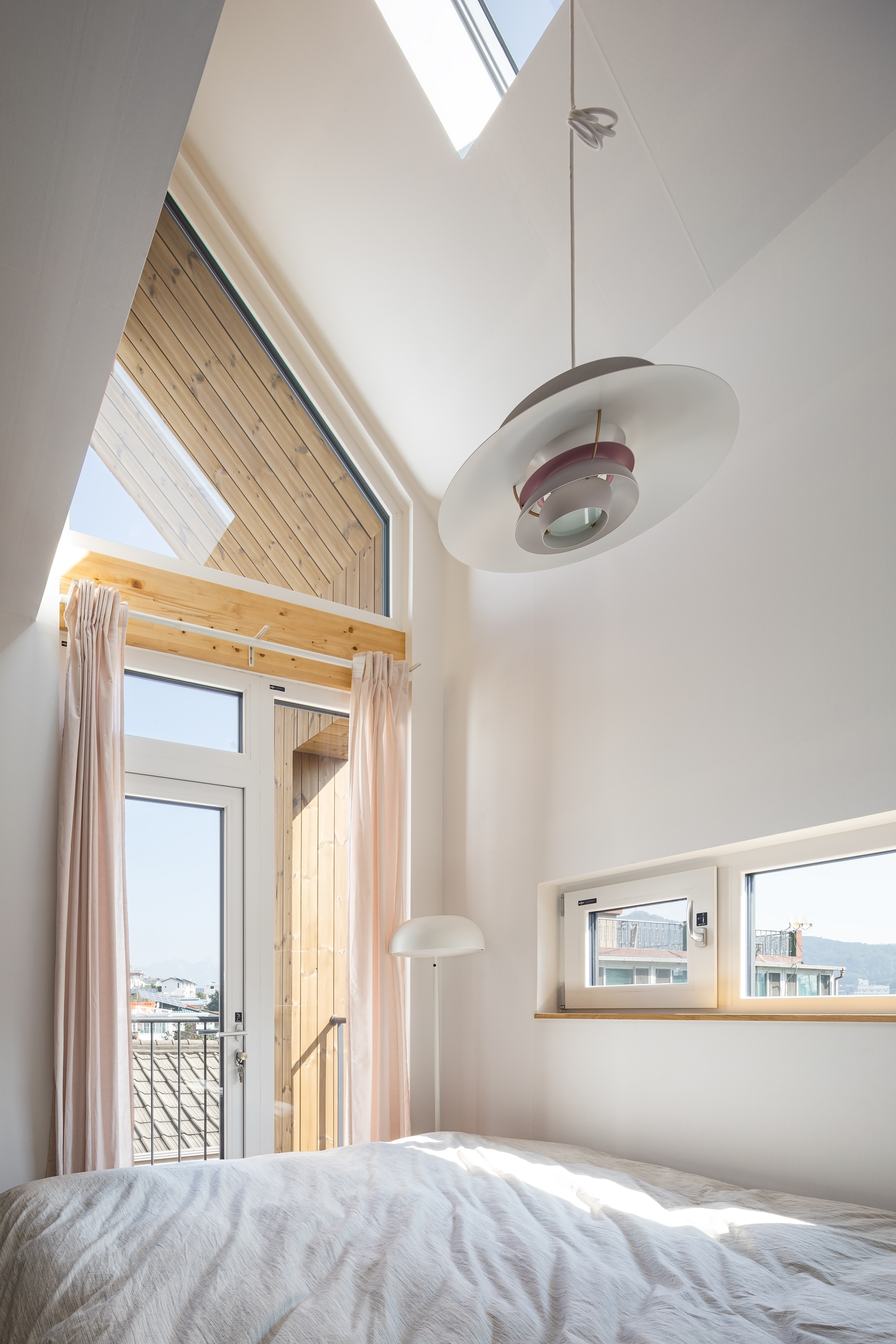 They, who makes kimchi themselves at home, asked for a utility room connected to the kitchen. The kitchen on the first floor leads to the front yard past the living room. A space to bury the crocks was provided between the front yard and the utility room. On the 1st floor, a room and bathroom as well as a private yard for the their parents were arranged along with the kitchen and living room. The 2nd floor is a space for the young couple(client), and the their bedroom was decided as the north room overlooking Yeonhui-dong, rather than the room in the south. The room in the south is being used as a study space since the door has not yet been installed, and when one goes out to the spacious terrace above the living room, a ‘sky yard’ where the wide sky of Yeonhui-dong can be seen is presented. Both of the two spaces on the second floor are connected to the third floor, which is used as the attic. Even though it is a small house, a three-dimensional detached house was created as there are split-level spaces as well as spaces with high floor heights.