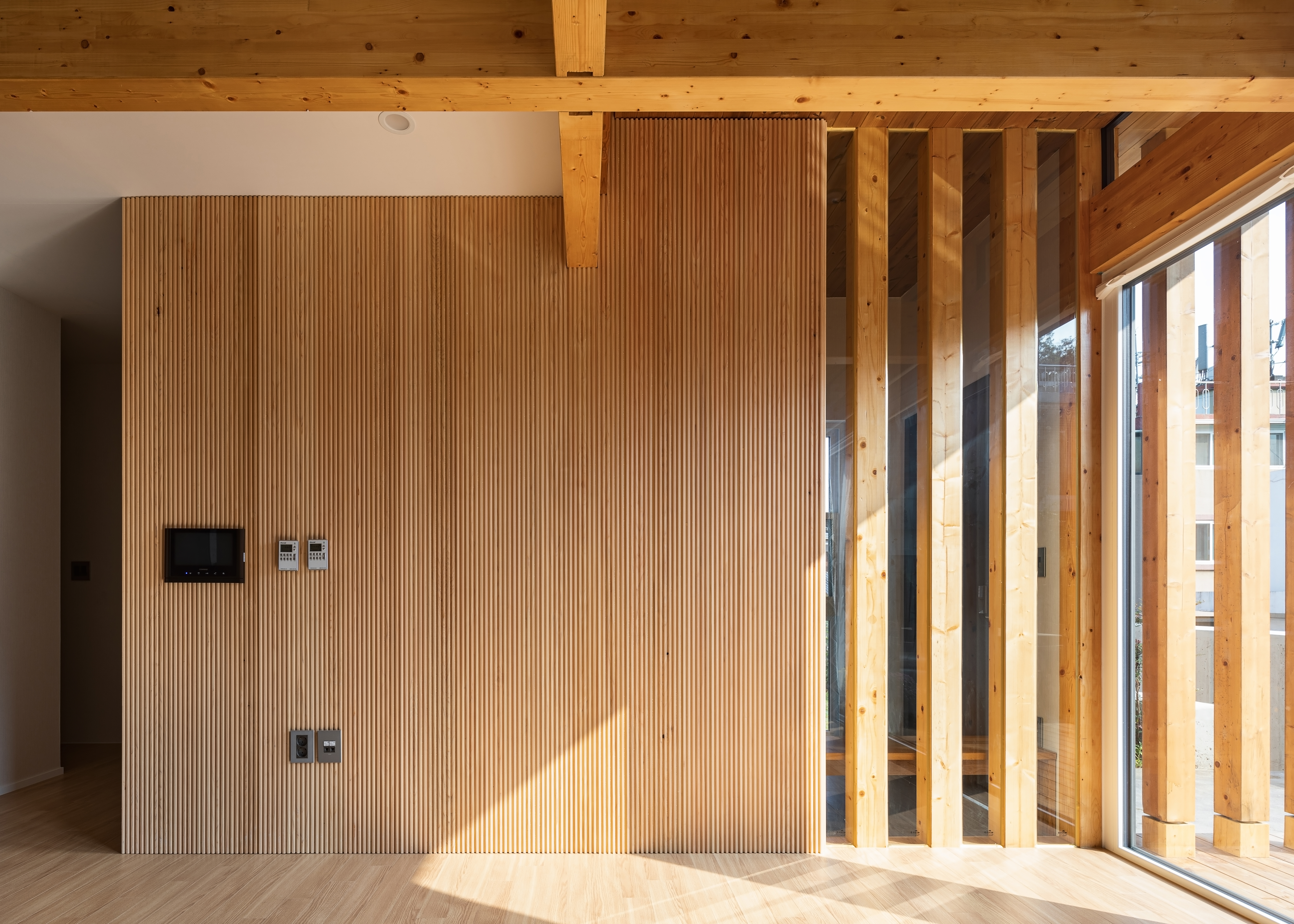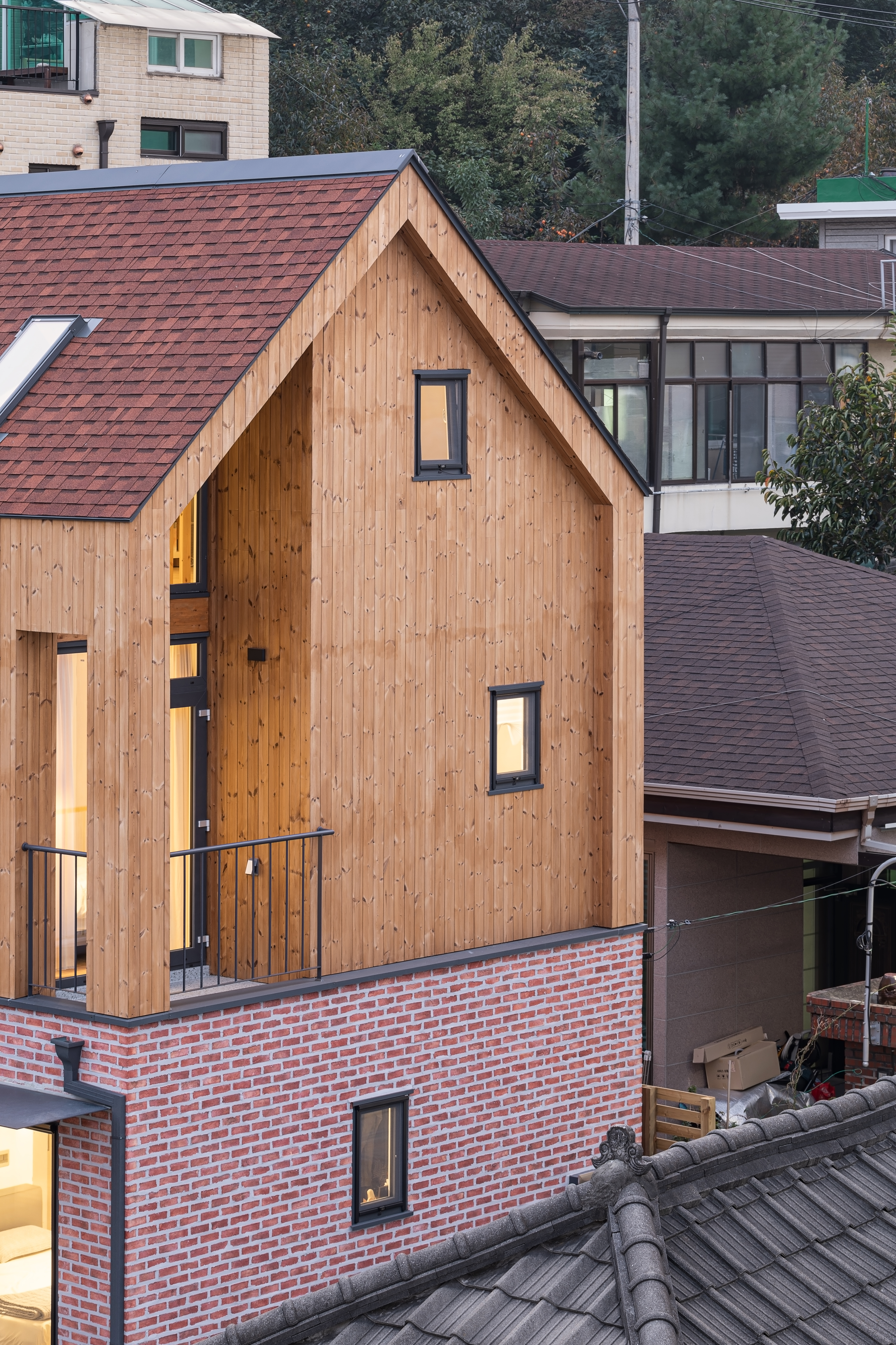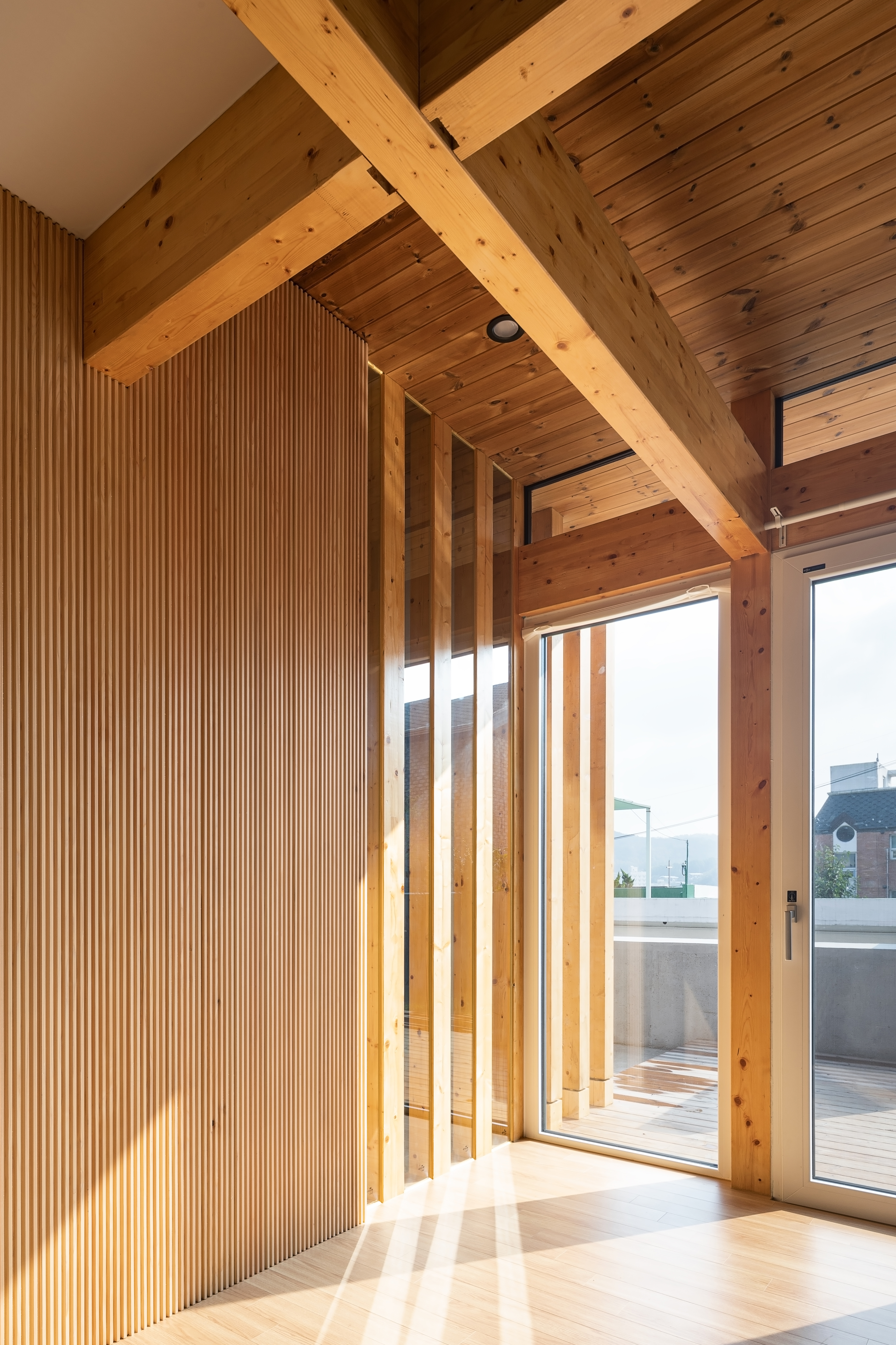 The 45-degree gable roof is finished with asphalt shingles. The exterior walls of the 1st floor were constructed by attaching bricks in the form of tiles onto the rain screen and cement board. The family, which have an extraordinary love for wood as a material, had mostly wooden furniture, including finishing materials of existing houses. For this reason, the house was built as a wooden house that could reduce cost and time, and was partly built in a wooden structure so that they could feel this material inside the house. The wooden pillars and beams of the living room were made in the shape of a cross for the family who are all devout Catholics.