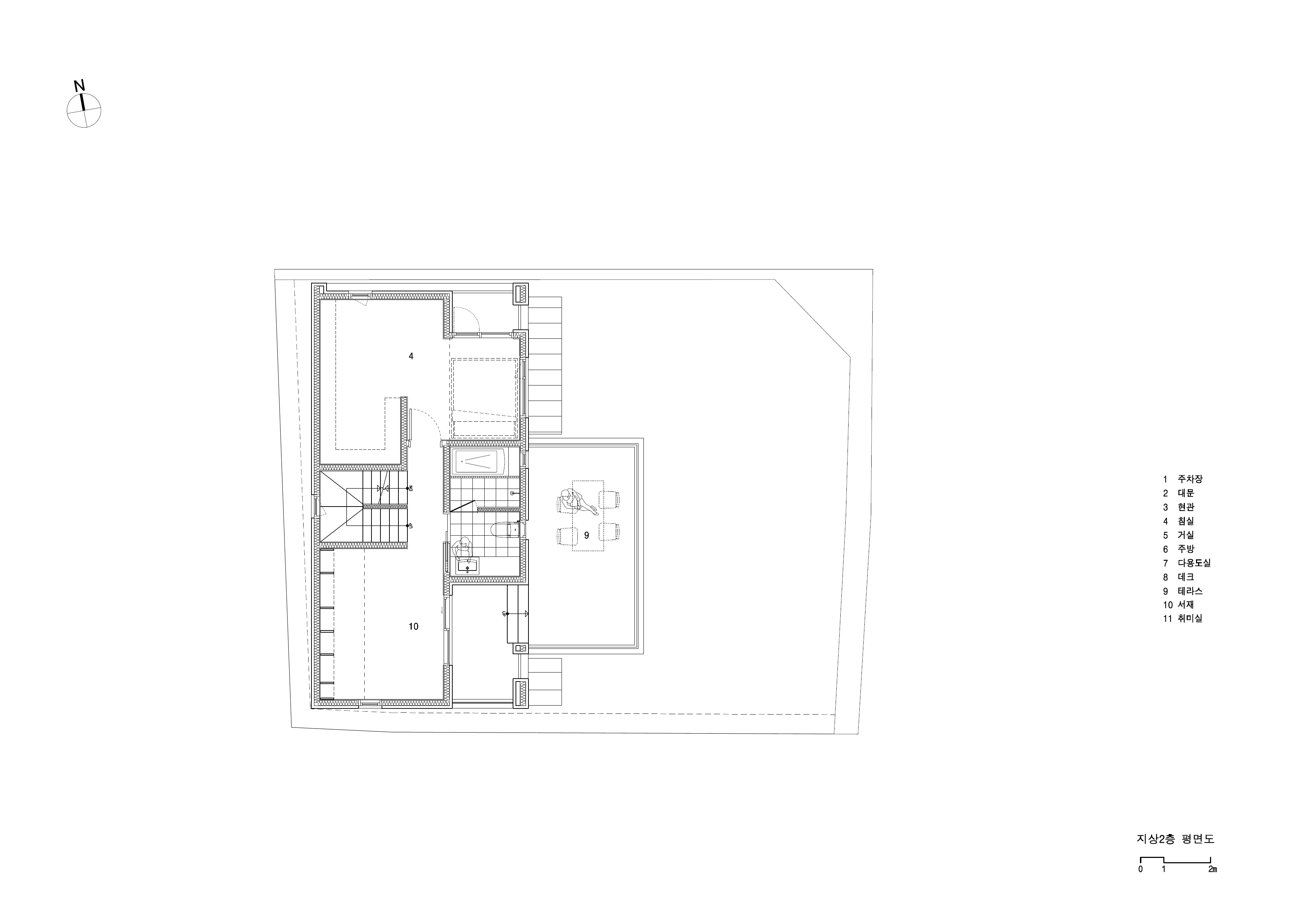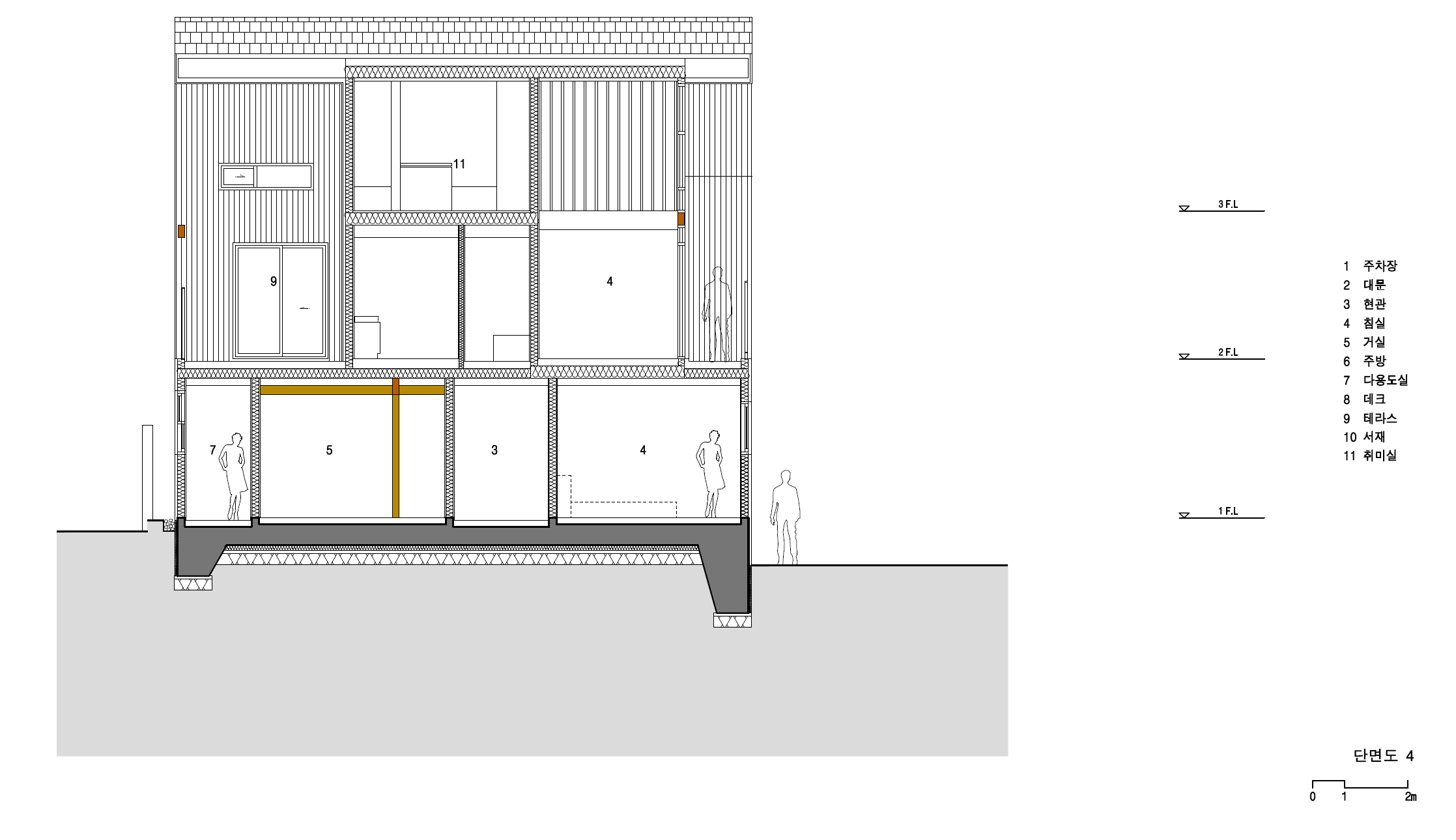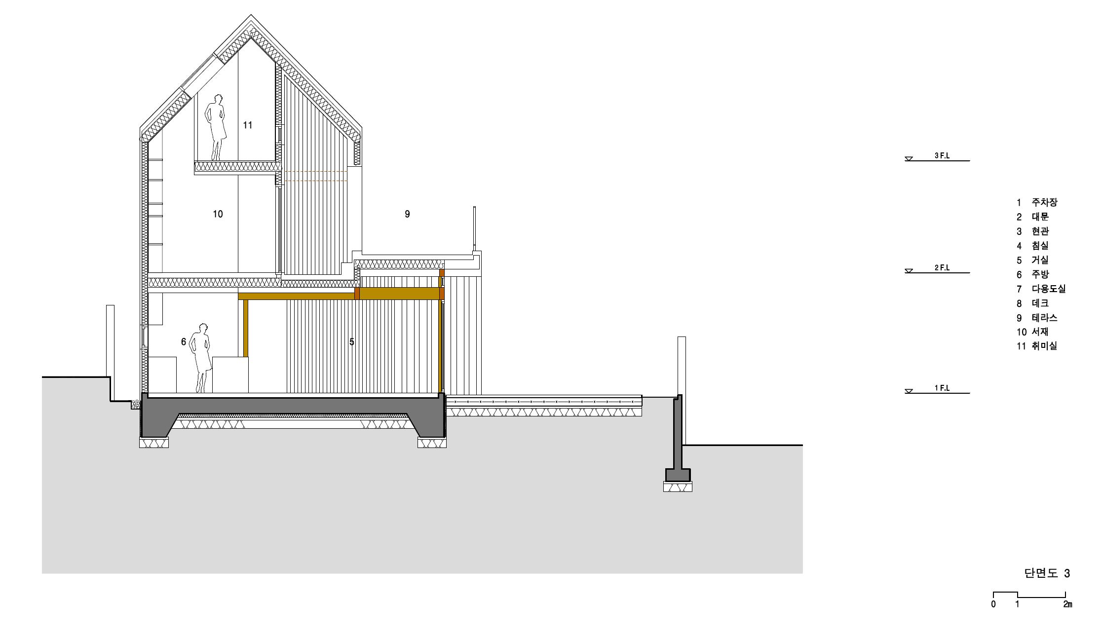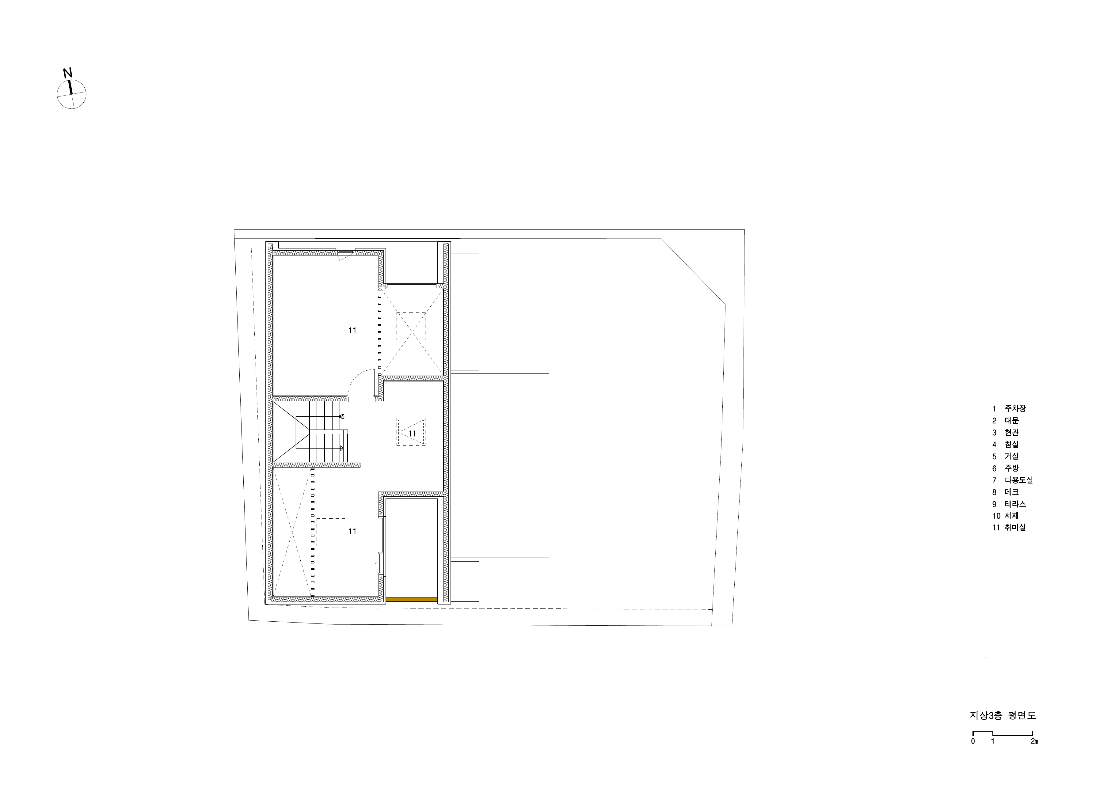 They, who makes kimchi themselves at home, asked for a utility room connected to the kitchen. The kitchen on the first floor leads to the front yard past the living room. A space to bury the crocks was provided between the front yard and the utility room. On the 1st floor, a room and bathroom as well as a private yard for the their parents were arranged along with the kitchen and living room. The 2nd floor is a space for the young couple(client), and the their bedroom was decided as the north room overlooking Yeonhui-dong, rather than the room in the south. The room in the south is being used as a study space since the door has not yet been installed, and when one goes out to the spacious terrace above the living room, a ‘sky yard’ where the wide sky of Yeonhui-dong can be seen is presented. Both of the two spaces on the second floor are connected to the third floor, which is used as the attic. Even though it is a small house, a three-dimensional detached house was created as there are split-level spaces as well as spaces with high floor heights.