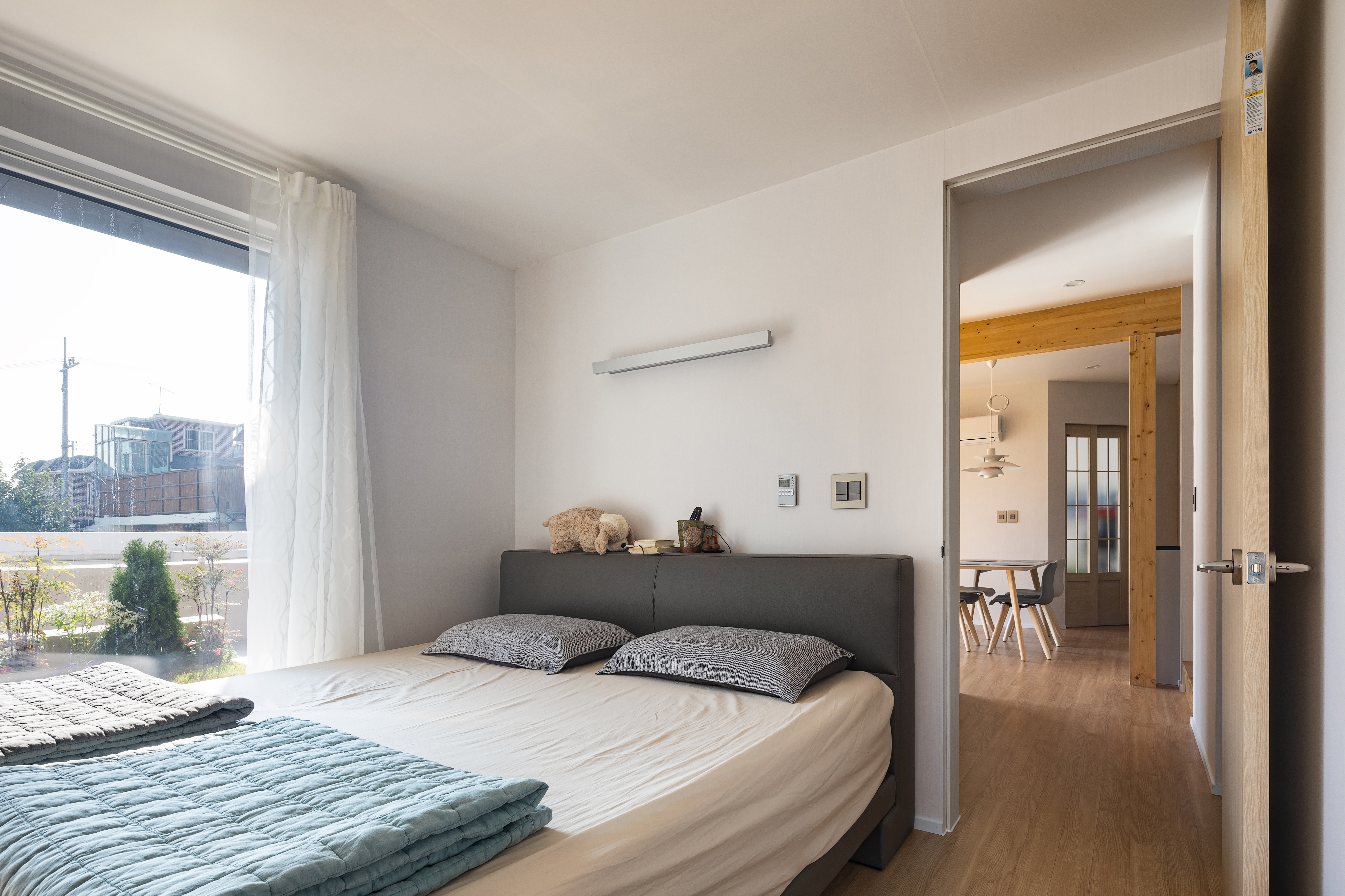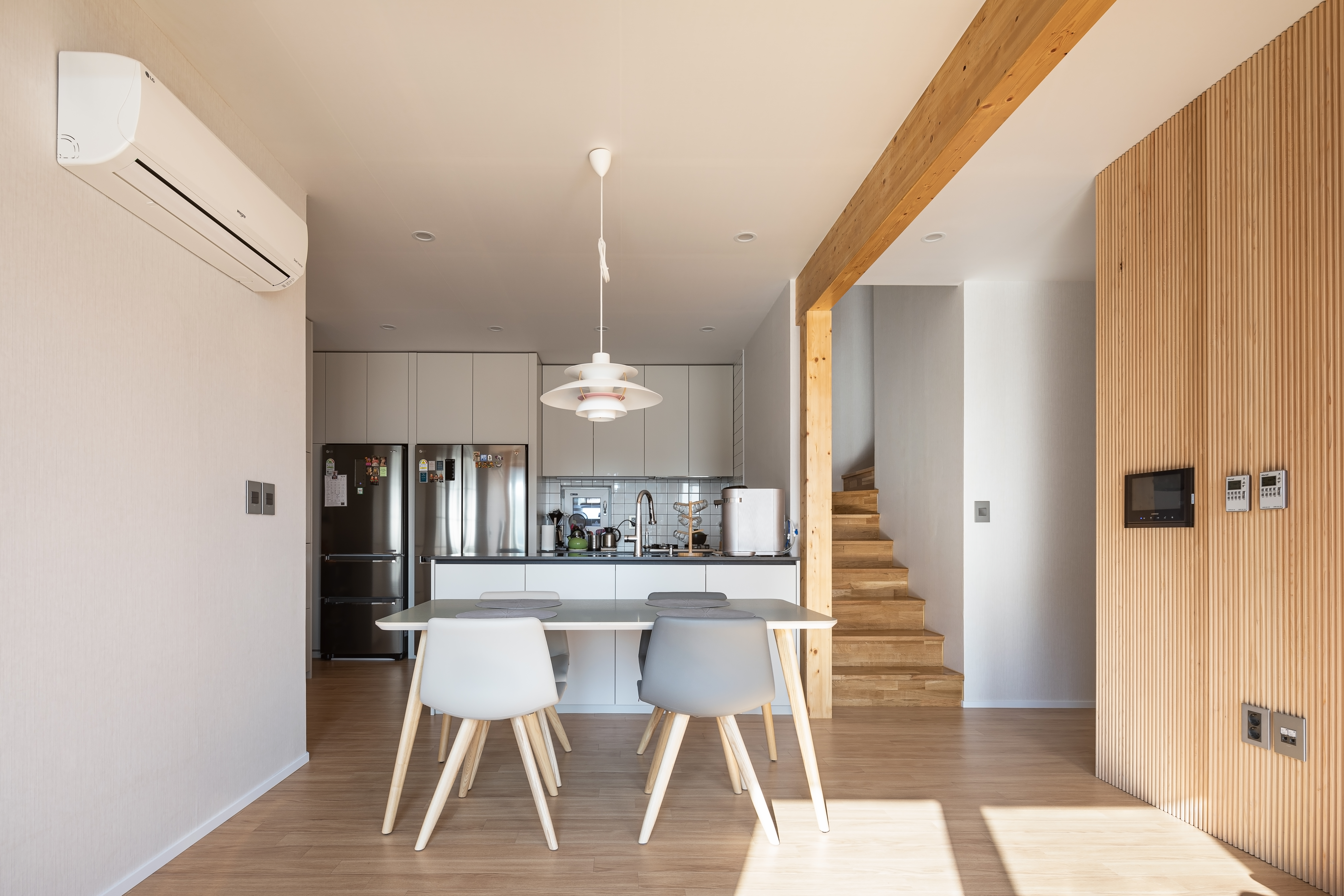 The 45-degree gable roof is finished with asphalt shingles. The exterior walls of the 1st floor were constructed by attaching bricks in the form of tiles onto the rain screen and cement board. The family, which have an extraordinary love for wood as a material, had mostly wooden furniture, including finishing materials of existing houses. For this reason, the house was built as a wooden house that could reduce cost and time, and was partly built in a wooden structure so that they could feel this material inside the house. The wooden pillars and beams of the living room were made in the shape of a cross for the family who are all devout Catholics.
