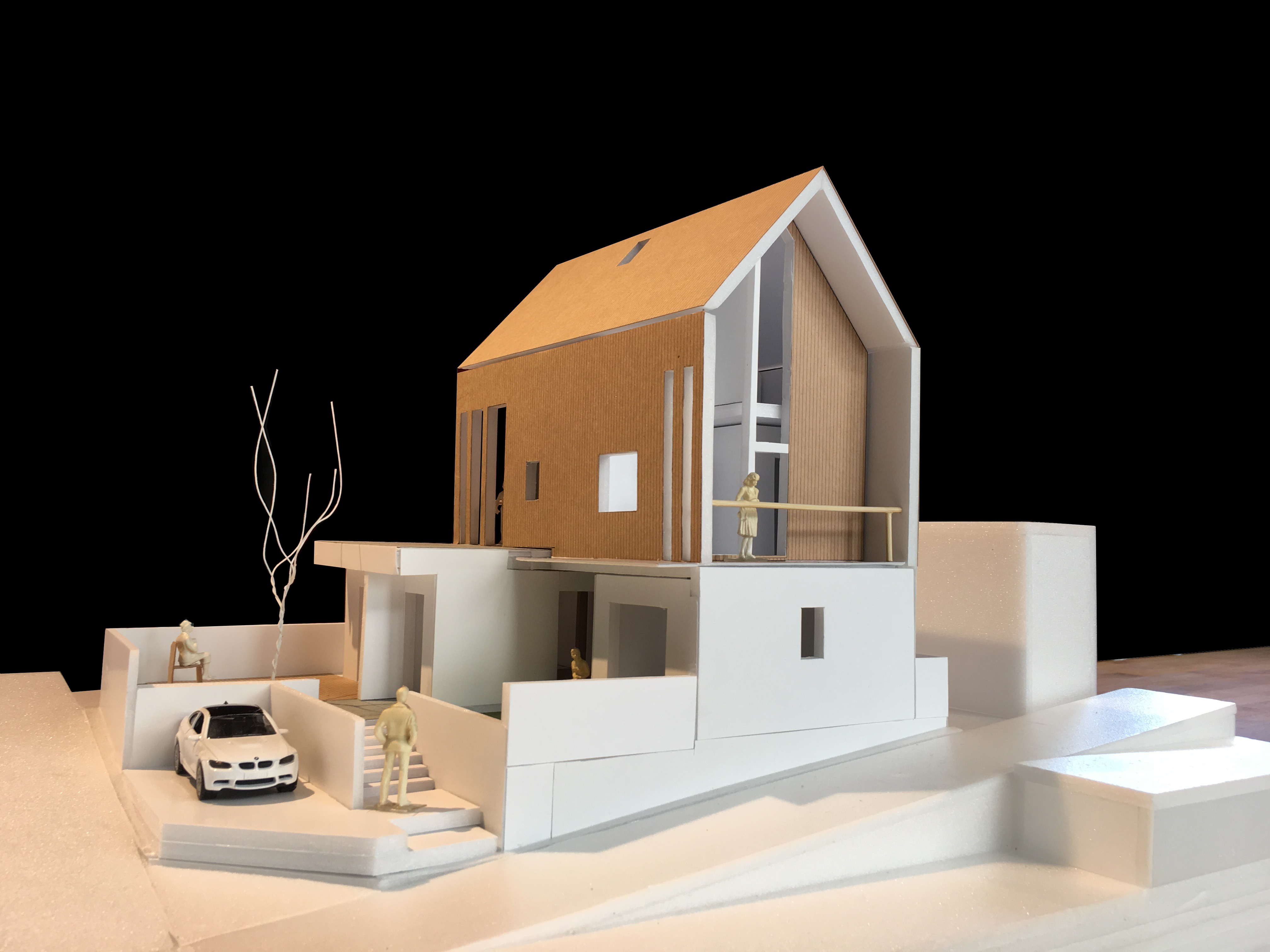45도의 박공지붕은 아스팔트슁글로 마감됐으며, 1층의 외벽은 타일 형태의 벽돌이 레인스크린과 시멘트보드 위에 덧붙여져 있다. 목재에 대한 애정이 남다른 이 가족은 기존 집의 마감재도 그렇고, 가지고 있는 가구들도 대부분 원목가구였다. 이러한 이유로 집은 비용과 시간을 줄일 수 있는 목조주택으로 지어졌고 이러한 자재의 느낌을 집 내부에서도 그들이 느낄 수 있도록 부분적으로 중목구조로 지어졌다. 거실의 목재 기둥과 보는 독실한 카톨릭 신자인 가족 모두를 위해 십자가 모양으로 만들어졌다.