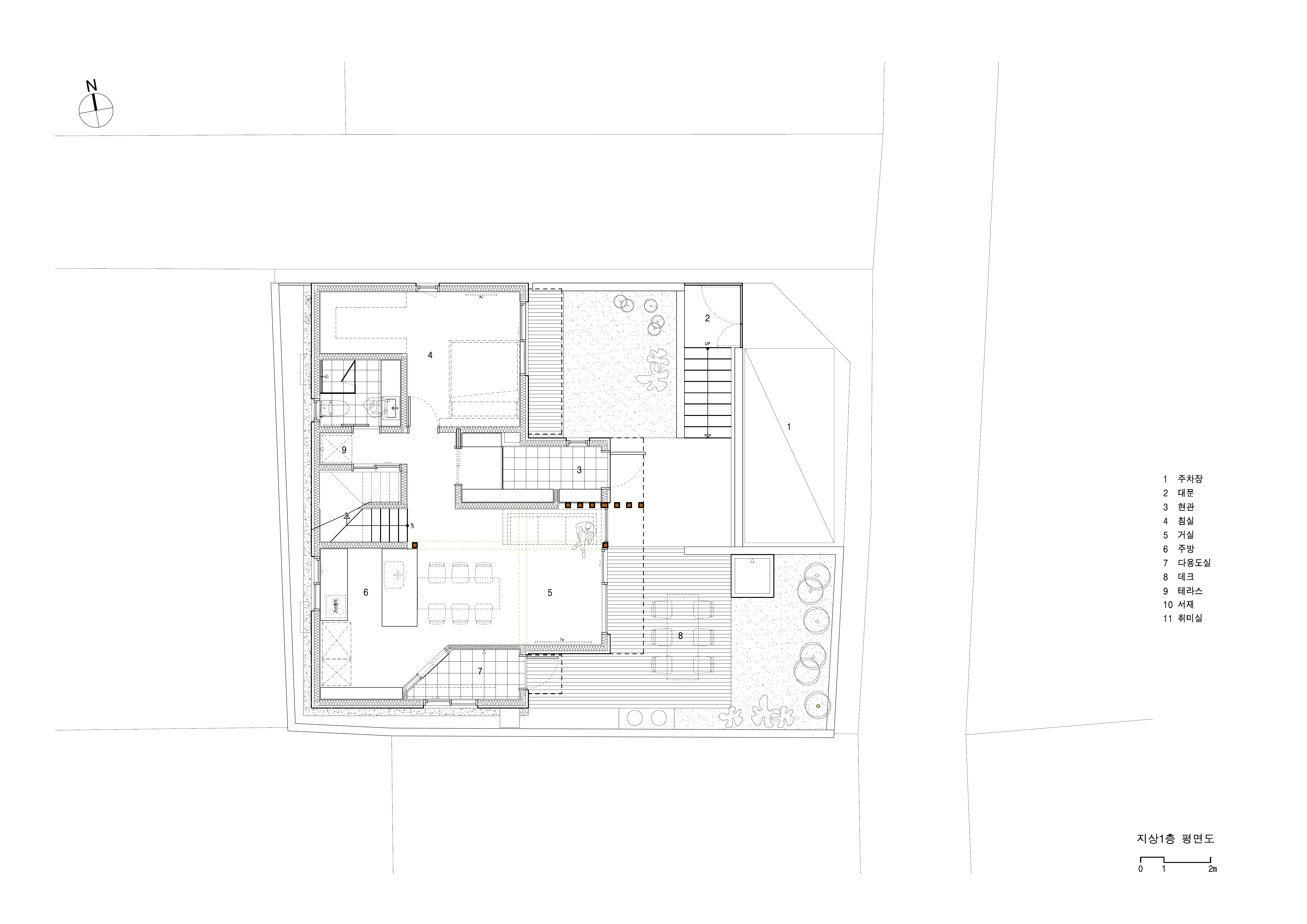 집에서 김장을 하시는 어머니는 주방과 연결된 다용도실을 요청했다. 1층의 주방은 거실을 지나 앞마당으로 연결된다. 앞마당과 다용도실 사이에는 장독을 묻을 공간도 마련됐다. 1층은 주방, 거실과 함께 부모님을 위한 방과 욕실, 그리고 전용으로 쓸 수 있는 마당이 나온다. 2층은 젊은 부부의 공간으로, 부부침실은 남쪽이 아닌 연희동을 내려다 볼 수 있는 북쪽을 향한다. 남쪽방은 아직 문을 달지 않아 서재 공간으로 쓰고 있는데 거실 위쪽의 넓은 테라스로 나가면 연희동의 넓은 하늘이 보이는 ‘하늘마당’이 펼쳐진다. 2층 두 개의 공간은 모두 다락으로 쓰이는 3층으로 공간이 연결된다. 작은 집이지만 곳곳에 복층의 공간이나 높은 층고의 공간이 있어 입체적인 거주 공간임을 보여준다.