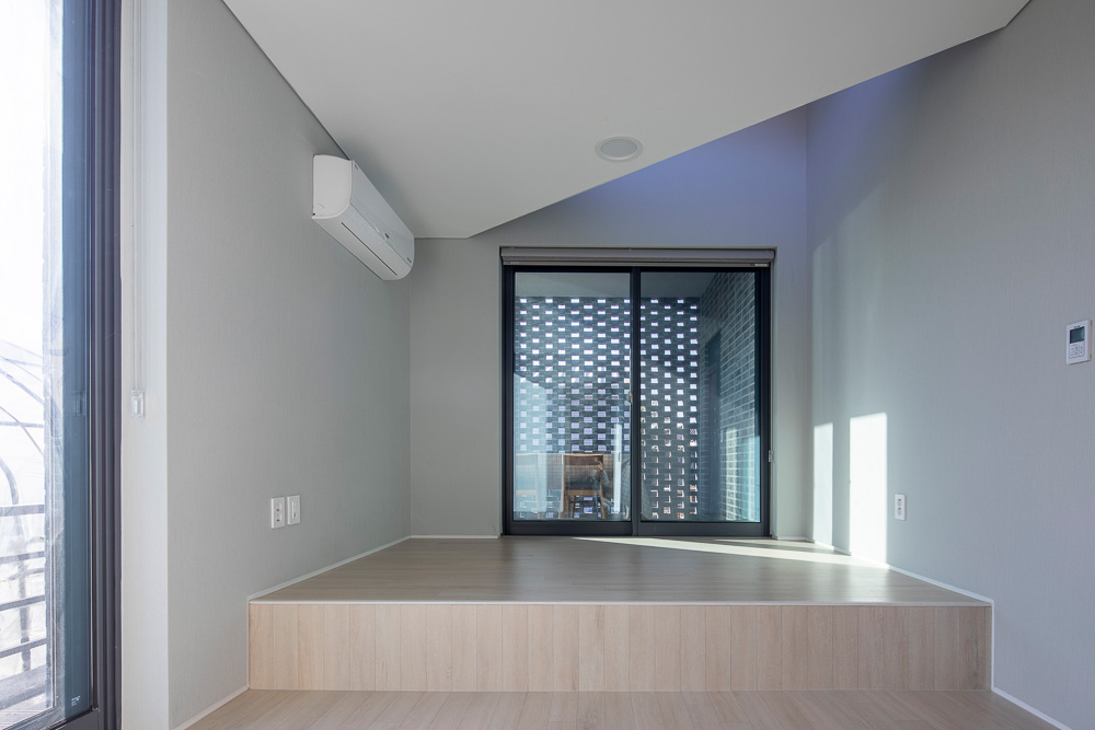 The clerestory windows that run along the entire house, a characteristic of Gangjin Sagak’s designs, are shared by the whole family. These windows were planned as a single gap that can be experienced in all spaces of the parents’ bedroom, kitchen, dining room, living room, and couple’s bedroom. With the single gap that is designed regardless of the room situation, each room allows users to experience a sense of interior space under the same scenery outside the window, in situations that change according to the change in ceiling height.