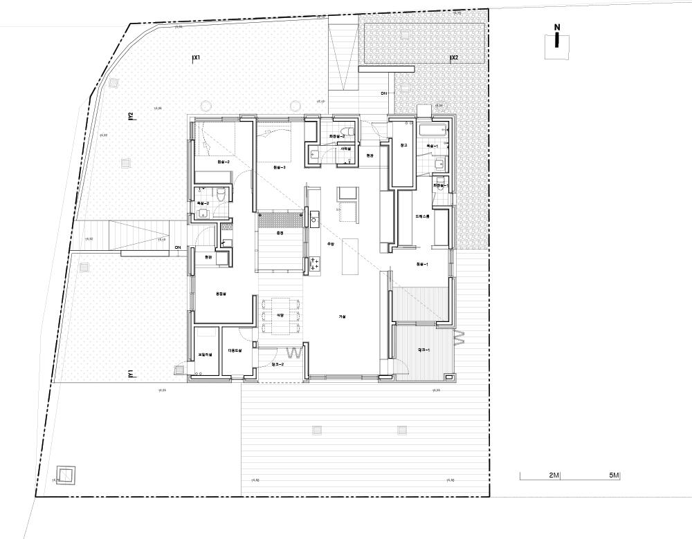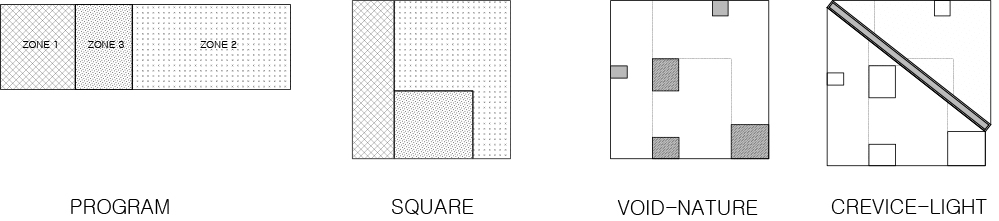 독립적인 2세대지만 섞여서 살아갈 수밖에 없는 가족을 가장 단순한 정사각형으로 표현하고자 하는 것은 건축가의 욕심일 수도 있다. 그러나 이런 생각이 최종적으로 집의 특징을 만드는 데 이바지할 것으로 생각했고 건축주와 공유했다. 정사각형 속에서도 세대 간 독립성을 충분히 달성할 수 있다는 믿음과 정사각형이 가지는 경제성에 건축주 또한 공감했다. 이후 정사각형 내에서 분리될 부분과 공유될 부분을 배치했고, 깊은 실내를 극복하기 위해 중정과 내부로 파고든 옥외 데크 등을 계획했다.