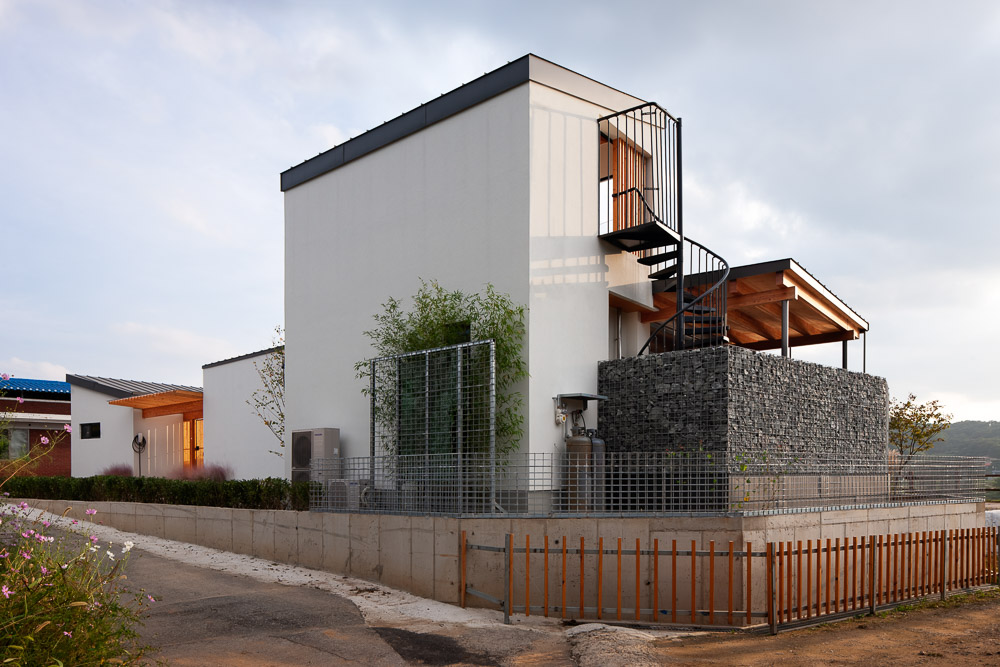 One of the mistakes made by people who dream of leaving their apartments behind for a rural life is choosing an unnatural site surrounded by a retaining wall. When you construct an embankment and make the sloping land flat and straight for the sake of a large yard, neither nature nor a village can exist. Even if there was a yard, it would be no different from ‘life in an urban apartment’. The site of ‘The FriYah’ is long and thin, and the shape of the ground is uneven. Nevertheless, the yard space facing the surrounding houses and the wonderful view of the Namhangang River does more than make amends for the shortcomings of the land.