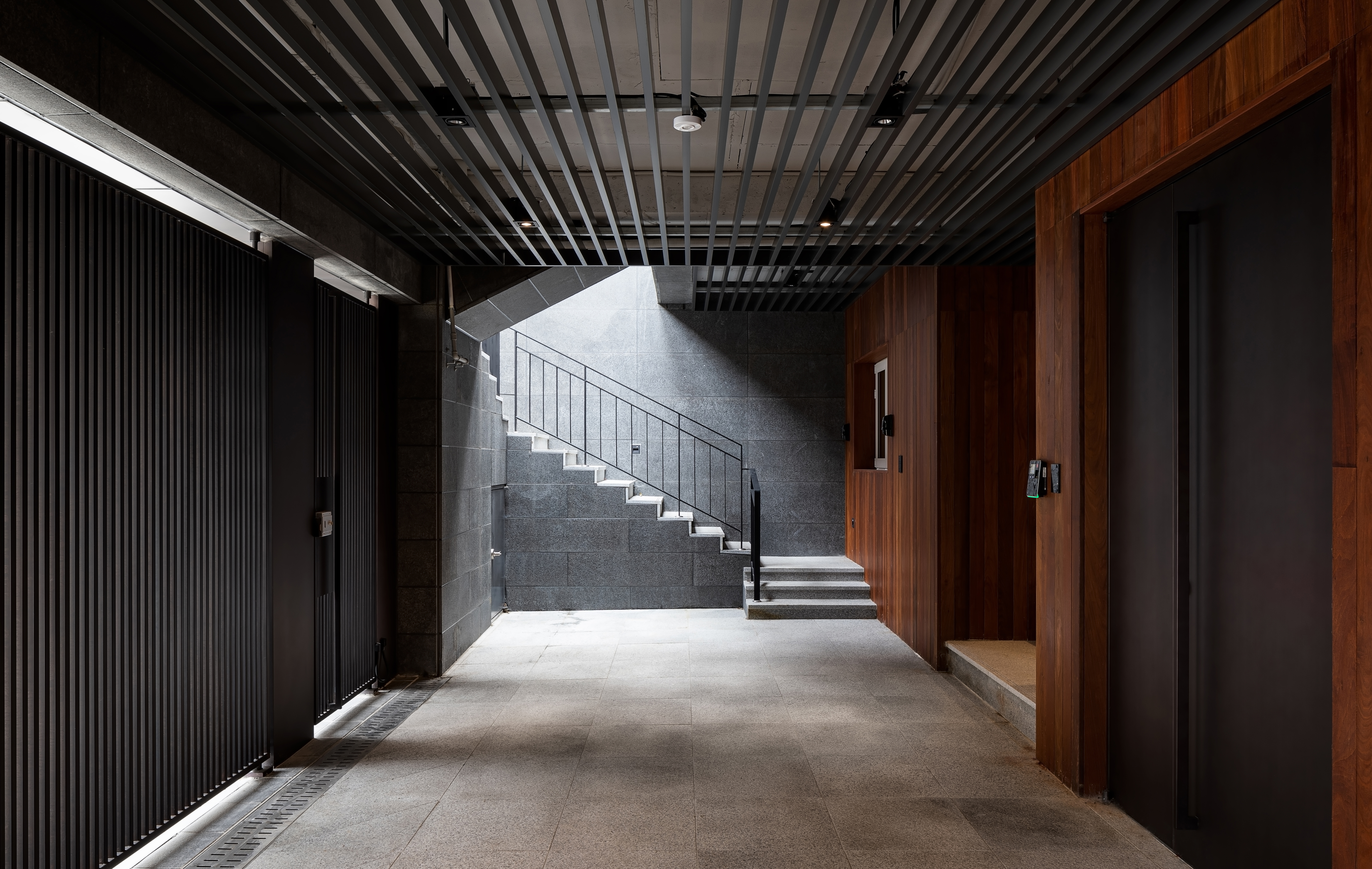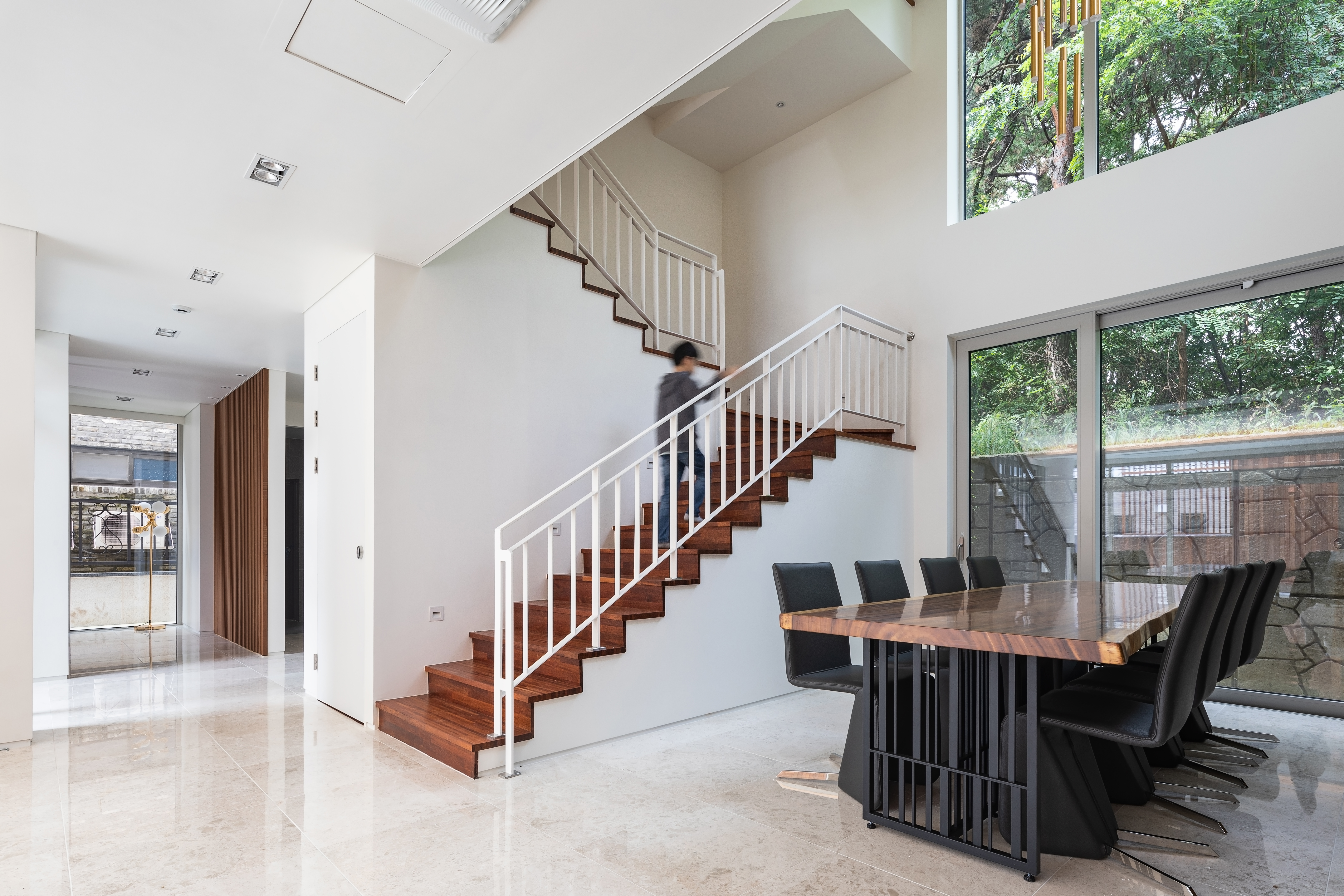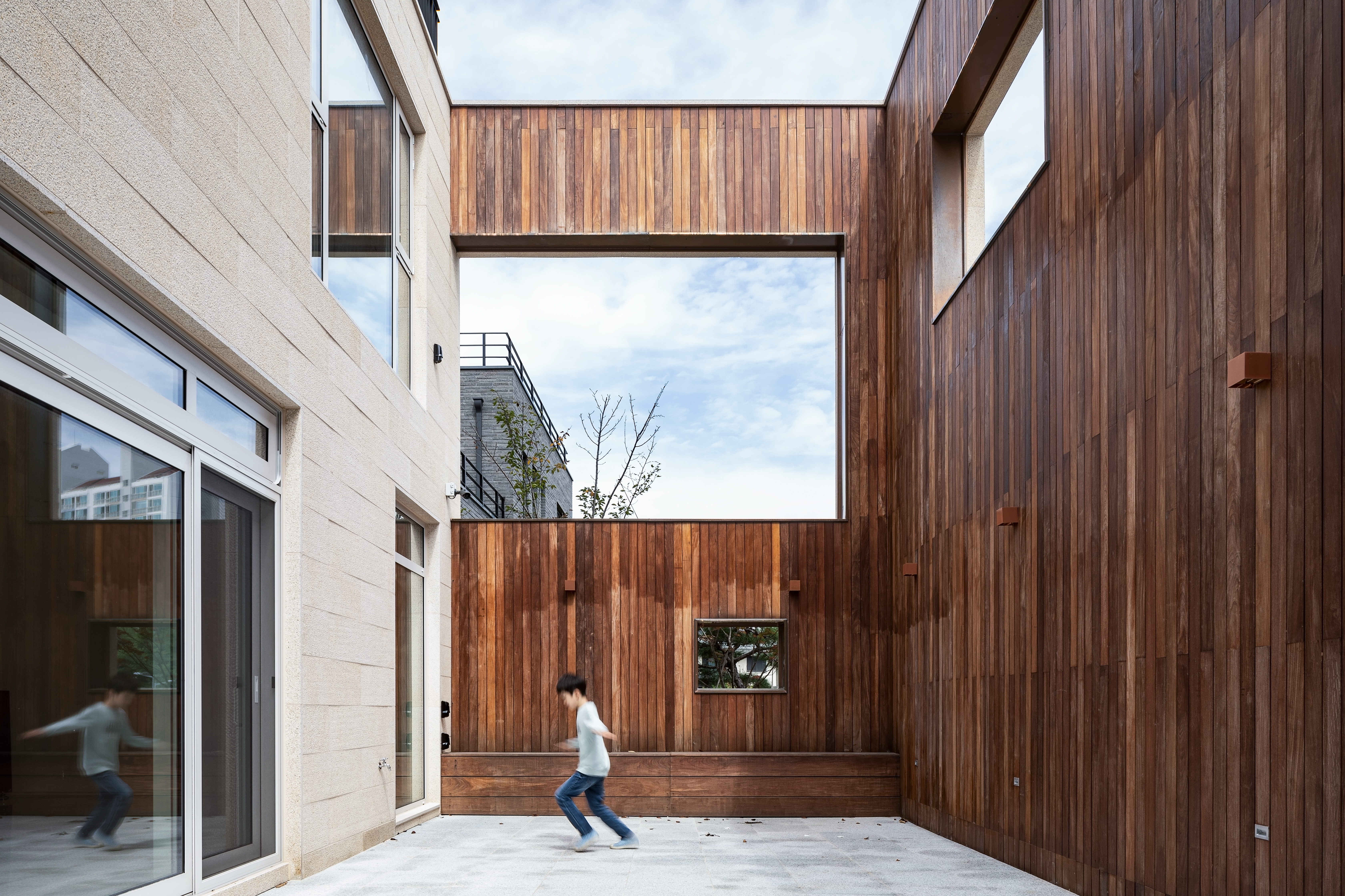 When you enter the main gate on the B1 floor, there is a parking lot and entrance, and when you enter inside, there is a guest room, hobby room, stairs and elevator. If you go up to the first floor through the external stairs, there is a yard and another entrance. This optional use of the two front doors provides flexibility in responding to the differences in time differences. The living room and kitchen on the 1st floor, facing the front yard, are where the family usually stays together, and the restaurant where the upper part is open with the stairs attracts attention from the upper and lower floors. On the 2nd floor, there is a bedroom and playground for grandparents and children, and on the 3rd floor, there is a bedroom and study for parents. The rooms on each floor share life by looking at each other through the courtyard, terrace and indoor open space. The wooden stone house has various types of yards on every four floors. The wide gate on the B1 floor is seen inside and out, and the outside space in front of the entrance becomes a small yard that communicates with the village road. The 1st floor, which has the meaning of an extended living room, matches the floor level with the living room and is finished with stone, and is surrounded by fences to protect privacy with neighbors, so you can stay in the outside space more freely. In addition, in front of the grandparents' bedroom on the 2nd floor, there is a cozy terrace yard facing the forest of the back mountain. Between the two spaces, a front window and a wide sliding door are installed, so you can experience the bedroom, the yard, and the forest at the same time. Finally, from the spacious terrace in front of the bedroom on the 3rd floor, you can see the distant city over the fence and the terrace space on the 2nd floor. Between the interior space of the house and the exterior environment is a wall-enclosed yard composed of openings of various sizes.