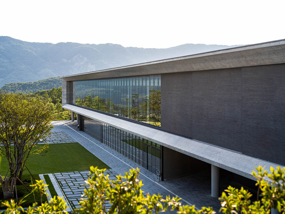 직사각형의 웅장한 노출 콘크리트 프레임은 자연을 담는 렌즈로, 그 사이 켜켜이 쌓인 높고 긴 롱브릭 벽은 외부에서 내부로 시선과 동선의 흐름을 유도하는 동시에 공간의 깊이를 연출하도록 의도하였다.