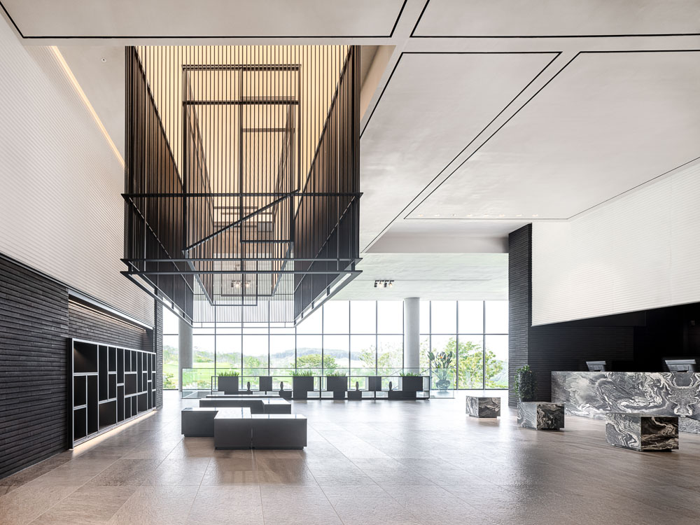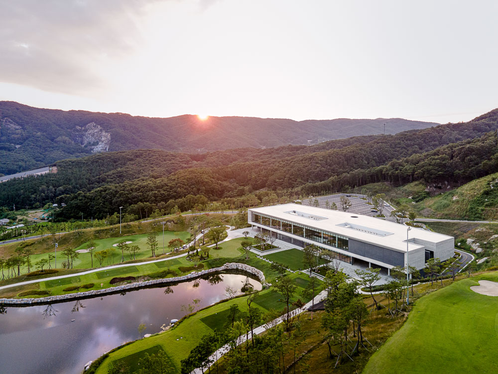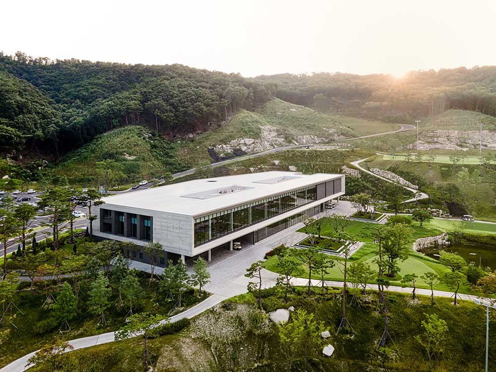 ROUTE52 CC Clubhouse is located on the highest ridge of Dangsan Mountain in Yeoju, which consists of a broad plain. Our expectations for this blessed place - the perfect location that can be easily found even from a distance offering a distant view and being able to enjoy the vast green and nature together - were unfortunately utterly blown away during the on-site survey when we found dozens of hectares of upended red-brown soil. Instead of mimicking nature sloppily by advocating the idea of ‘architecture that blends in with nature,’ we instead thought paradoxically that we should do the architecture and leave nature to nature and that this would be the most natural thing. In that site, we decided to place the long and wide concrete mass as raw as it is indifferently.