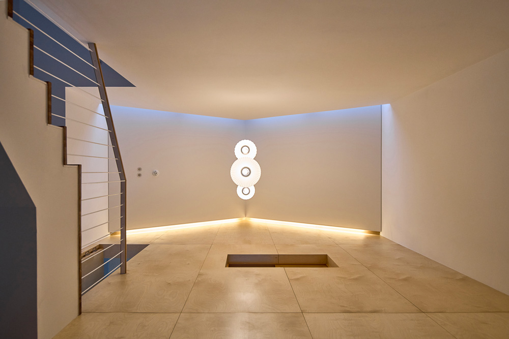 The surrounding scenery from the veranda on the second floor with a plan is the highlight of this house. The two-story Porch space, which embodies a traditional pavilion, is a semi-internal semiexternal space where you can actively enjoy the feeling of the season and is connected to the courtyard on the first floor and urban and perceptual. The upper part of the kitchen/restaurant space, which is open up to the second floor, is a central space that organically integrates the interior space, and the ceiling created by the harmony of natural light of high-side windows and artificial light of indirect lighting is the point of the interior space chosen by the architect.