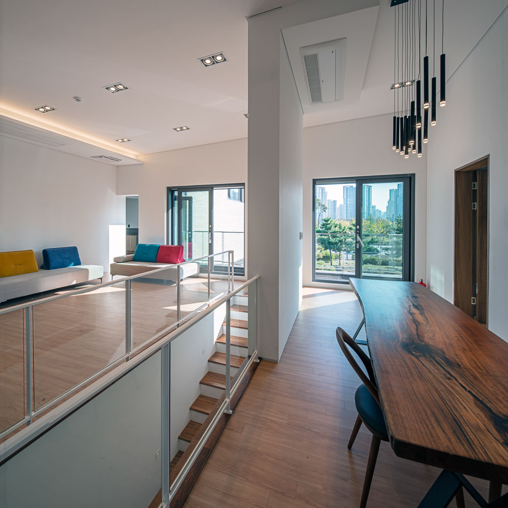The piloti on the first floor, which is an entry space on the front road, is a transition space that connects the outside and inside of the ground, and is used as a parking space after separating the front door of each household. Through the separated porch, the first and second floors are separated into the generation of parents and the generation of sons in the form of a mass of A and B. The second-floor study and hobby room of the parents' generation are community spaces that are connected and shared by generations, and the inner space is horizontally and vertically expanded and linked through skip floor cross-sectional planning. The main focus of the plan is the separation of movements to effectively respond to changes in family members in the future.