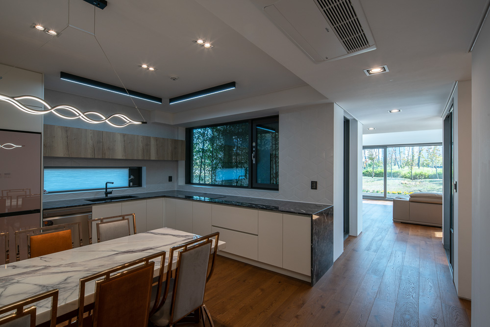 In general, the yard of a detached housing site in a housing site development district cannot be free from the perspective of adjacent roads and land on the volume of the site. It planned to plan a private courtyard that was separated from the front road inside the site close to Cheongna Lake Park and adjacent to the buffer green area and share it with two generations. In the type of housing where the two generations must live independently and in harmony, the yard secures intergenerational sharing and serves as a medium for introducing the natural view of the lake park into the building in its own way.