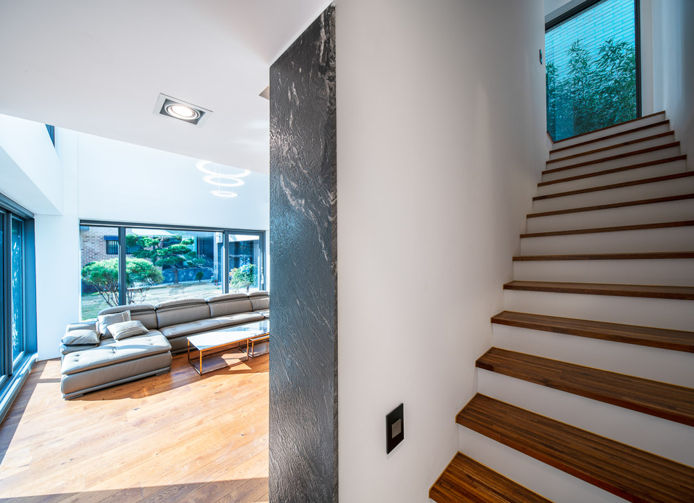 중정은 실내공간에 활력을 불어넣고 다양한 방식으로 자연을 각 세대의 공간마다 유입시켜 풍요로움을 선사한다. 수납공간을 확보하기 위하여 다락 공간을 적극 설치하고, 스킵플로어의 단면을 적극적으로 활용한 효율적인 공간 사용도 설계 과정의 중요한 포인트였다.