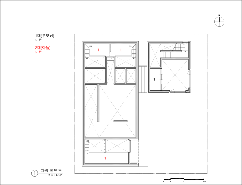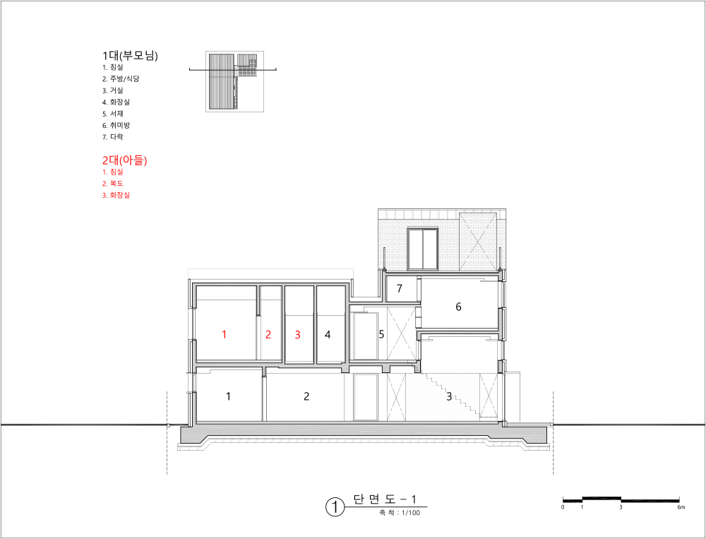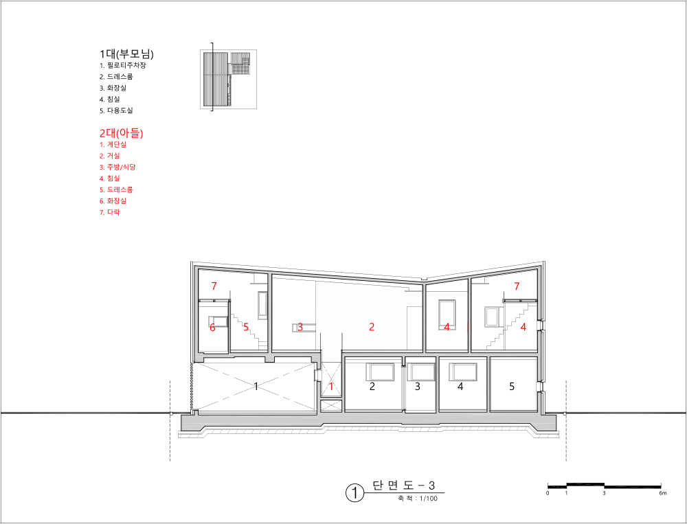 전면도로에서 진입공간인 1층 필로티는 대지 외부와 내부를 연결하는 전이공간이며 각 세대의 현관을 분리하고 주차공간으로 이용된다. 분리된 현관을 통하여 1층과 2층은 ‘ㄱ, ㄴ’의 매스 형태로 부모 세대와 아들 세대로 분리된다. 부모 세대의 2층 서재와 취미 방은 세대가 서로 연결되고 공유하는 커뮤니티 공간으로 스킵플로어 단면 계획을 통하여 내부 공간은 수평적 수직적으로 확장되고 연계된다. 추후 가족 구성원 변화에 대한 대응을 효과적으로 하기 위한 동선의 분리도 계획의 주요 주안점이다.