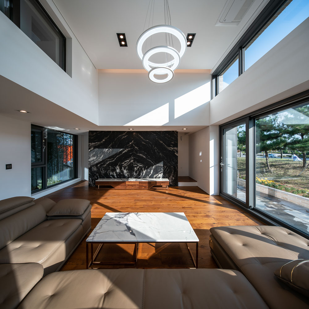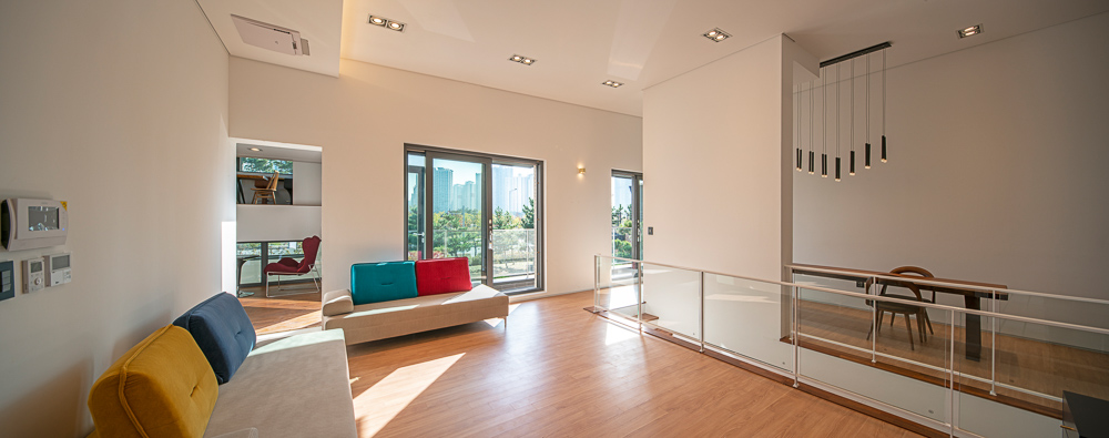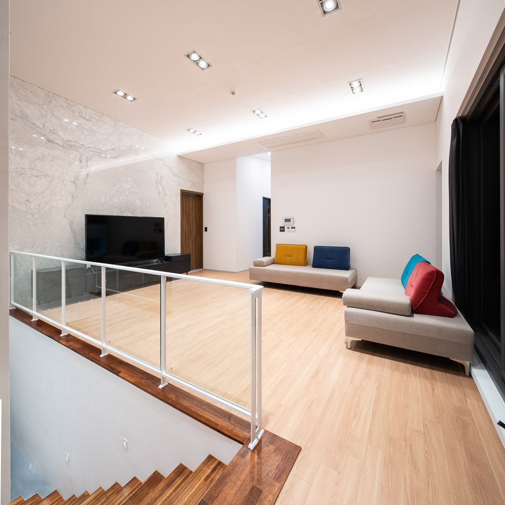 The piloti on the first floor, which is an entry space on the front road, is a transition space that connects the outside and inside of the ground, and is used as a parking space after separating the front door of each household. Through the separated porch, the first and second floors are separated into the generation of parents and the generation of sons in the form of a mass of A and B. The second-floor study and hobby room of the parents' generation are community spaces that are connected and shared by generations, and the inner space is horizontally and vertically expanded and linked through skip floor cross-sectional planning. The main focus of the plan is the separation of movements to effectively respond to changes in family members in the future.