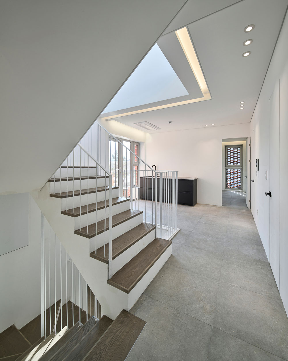Two households should share public spaces other than household division through separation by floor, but if necessary, they were considered to have different characteristics as houses of one household to two households. In the case of hobby rooms, that was planned to be more higher than other spaces at the request of the client, and through this, the study room placed above makes a more special. The study room, located on the skip floor, is another independent space separated from other rooms and is also an elevation element that adds strength to the building. On the second floor, there are a total of four rooms, including the master room, which is also a series of sharing of new dreams to be drawn in the future.